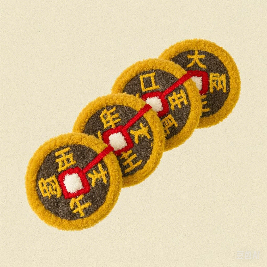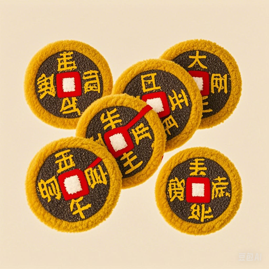 五帝钱毛绒挂件,毛绒材质五帝钱5枚,以红绳连接。