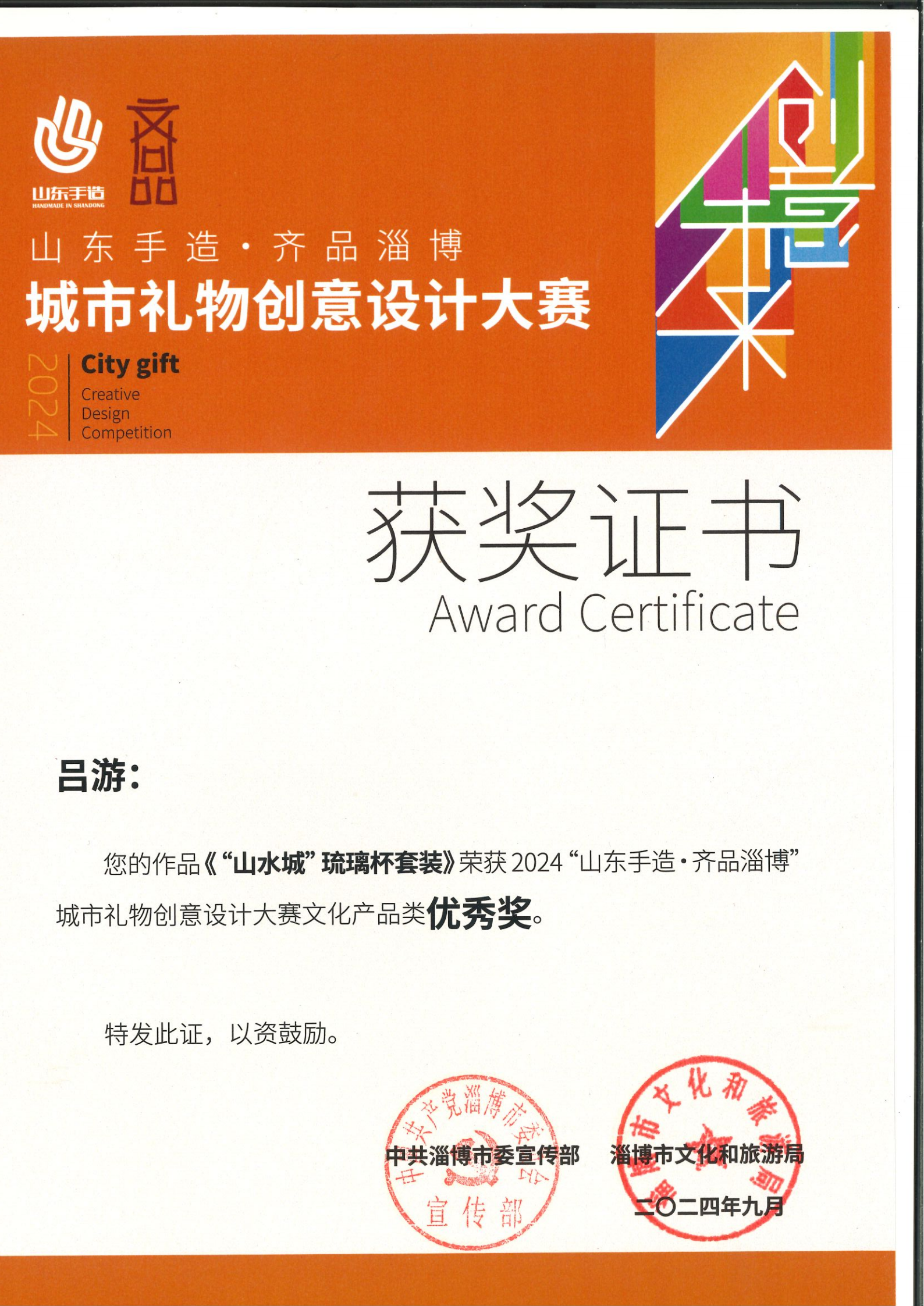 山东手造·齐品淄博 城市礼物创意设计大赛文化产品类优秀奖 作品作者:中央美术学院 吕游 指导教师:中央美术学院 胡汉华 若以“山、水、城”三字凝练淄博文化之精髓,则需深入其肌理,探寻其内在之美学与哲思。 作品以淄博“山、水、城”为灵感进行造型设计,加入了淄博地图、水文、山川等肌理元素。 淄博之城,是山与水的结晶,是自然与人文的交融。城之繁华,映射出淄博文化的开放与进取,它以一种生生不息的力量,推动着这座城市向着更加辉煌的未来迈进。“山、水、城”三者相辅相成,共同构筑了淄博文化的立体图景。山之沉稳、水之灵动、城之繁华,交织出一幅充满力量与美感的画卷,彰显了淄博文化的独特魅力与深远影响。