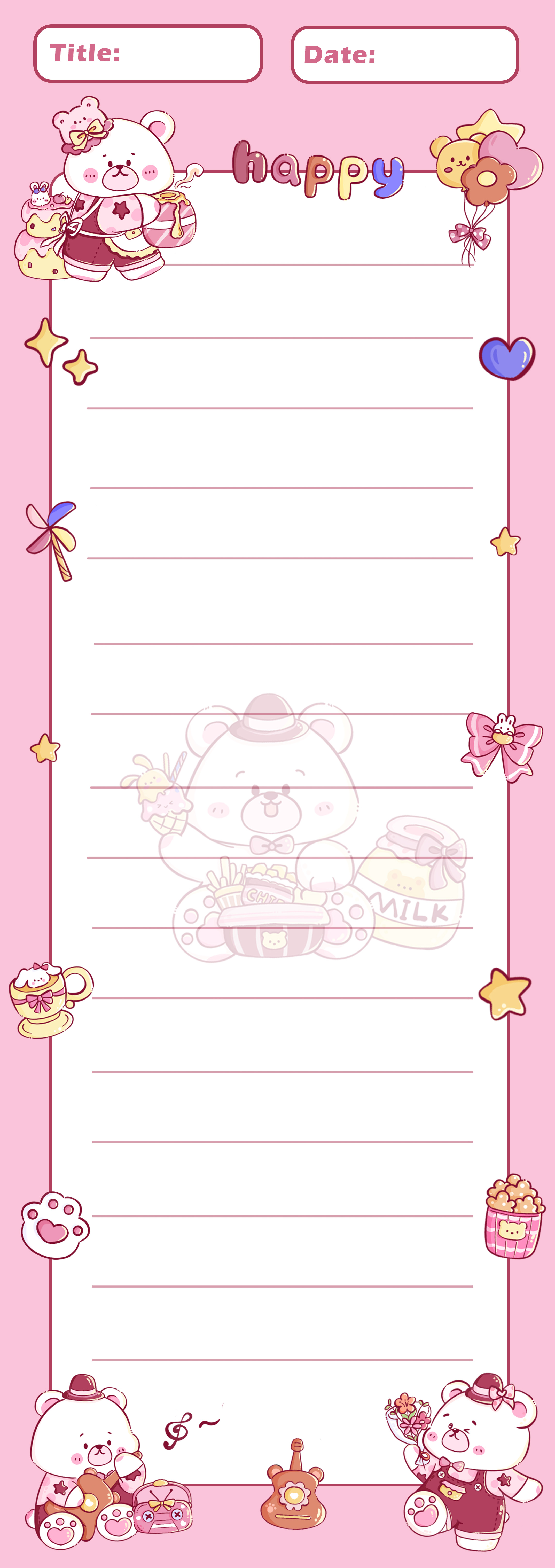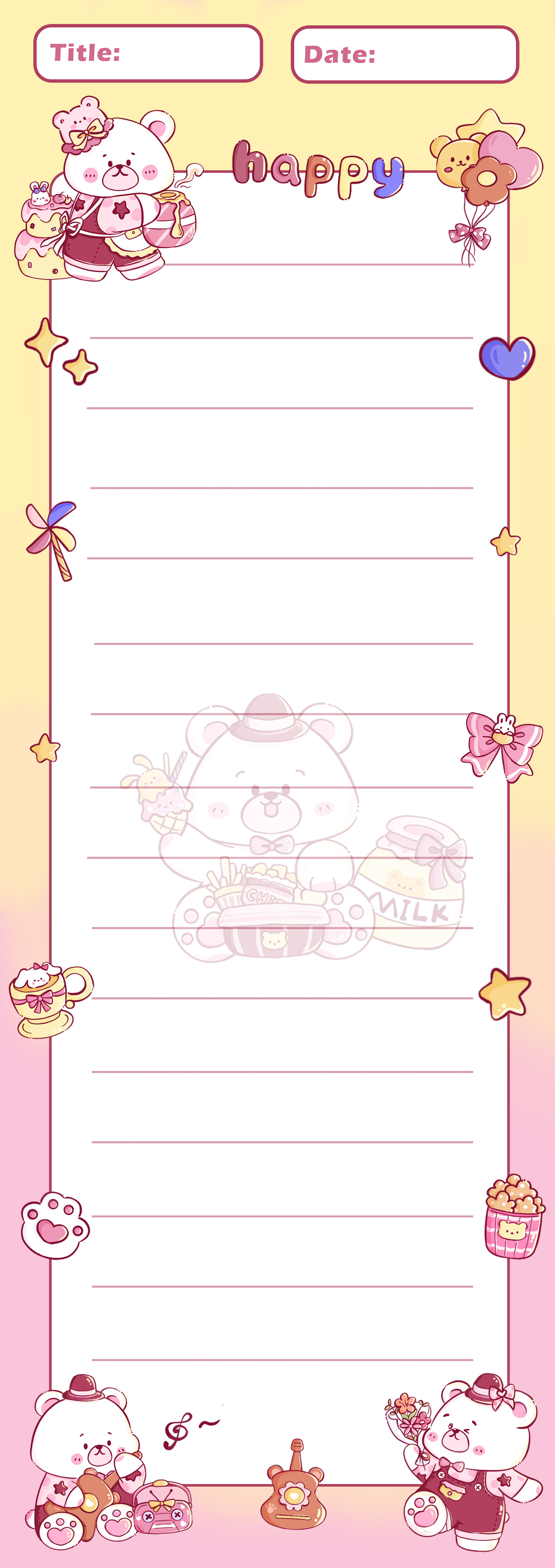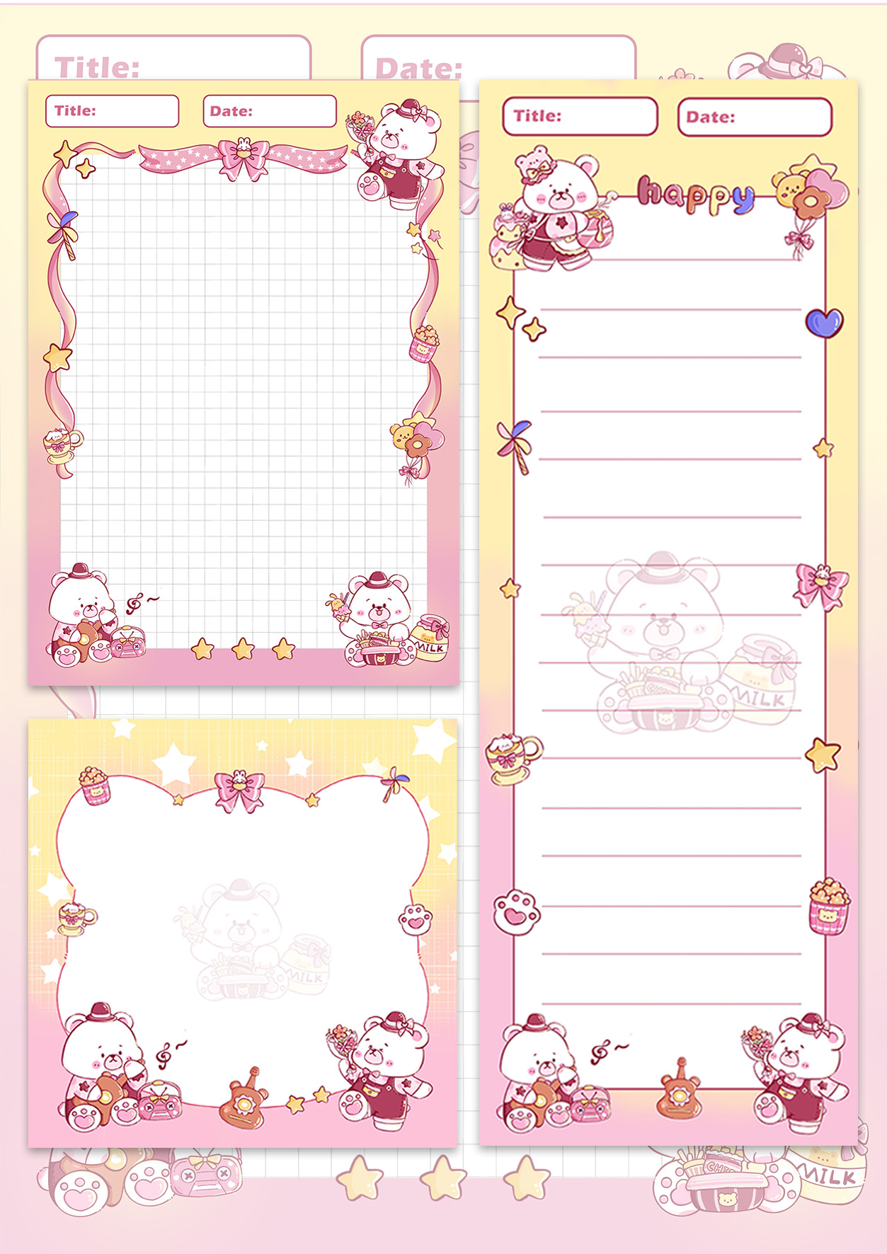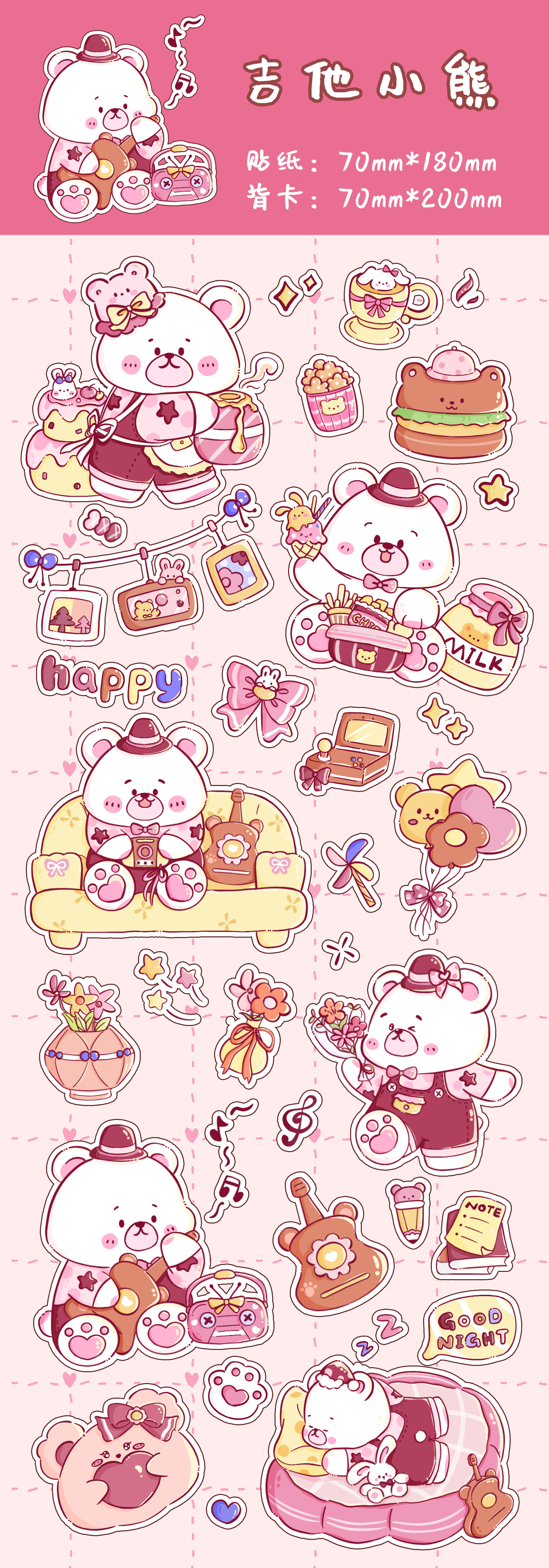 这里是一只爱弹吉他的小熊,看看它这一天都干了些什么? 做做美食,吃吃零食,打打游戏,练练吉他,练习累了就躺床睡觉咯~ 主卡:70mm*180mm 背卡:70mm*200mm 品类衍生:贴纸、拍纸本、便签、家纺、壁纸、线上美化、其他文创产品等 #文创展征集