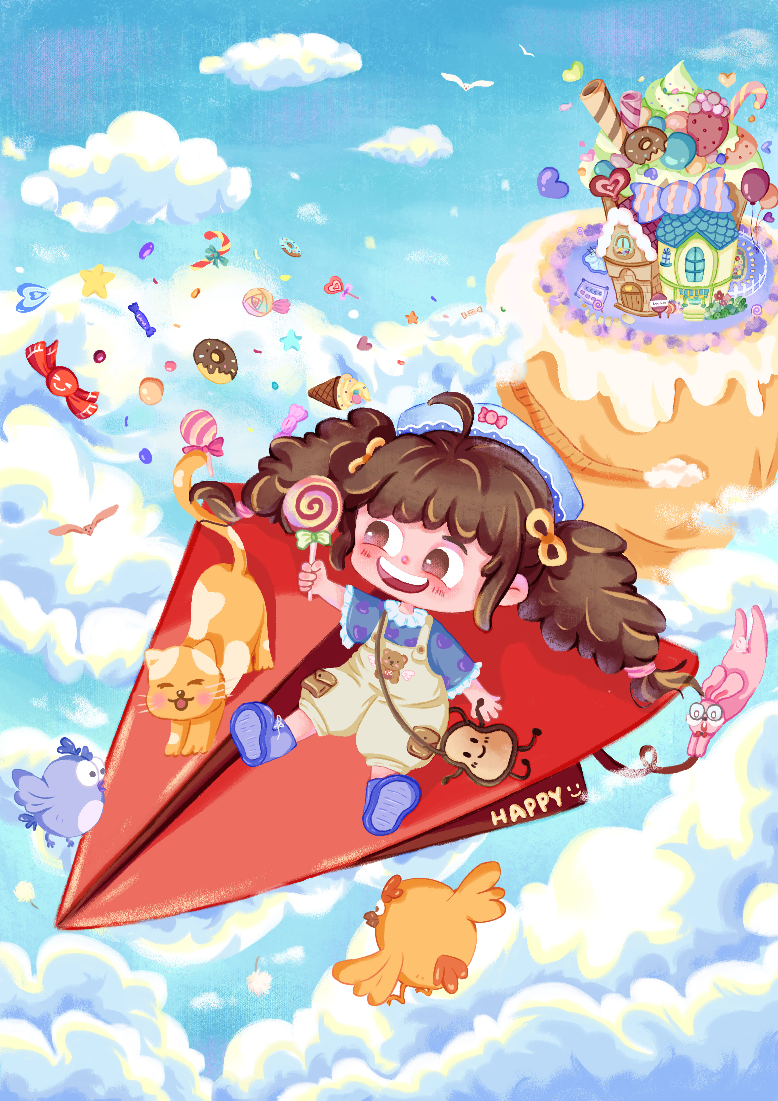 快来跟这位可爱又淘气的小妞一起出逃,享受自由的快乐吧~ 坐上纸飞机,背上小包包,带上心爱的小猫和兔子管家,吃着棒棒糖,开心地离开甜蜜蜜的城堡啦! 云端上,有小鸟和云彩陪伴洋溢着自由、新奇又快乐的味道 小女孩要开始探索外面奇妙又美丽的世界啦~ 出发!