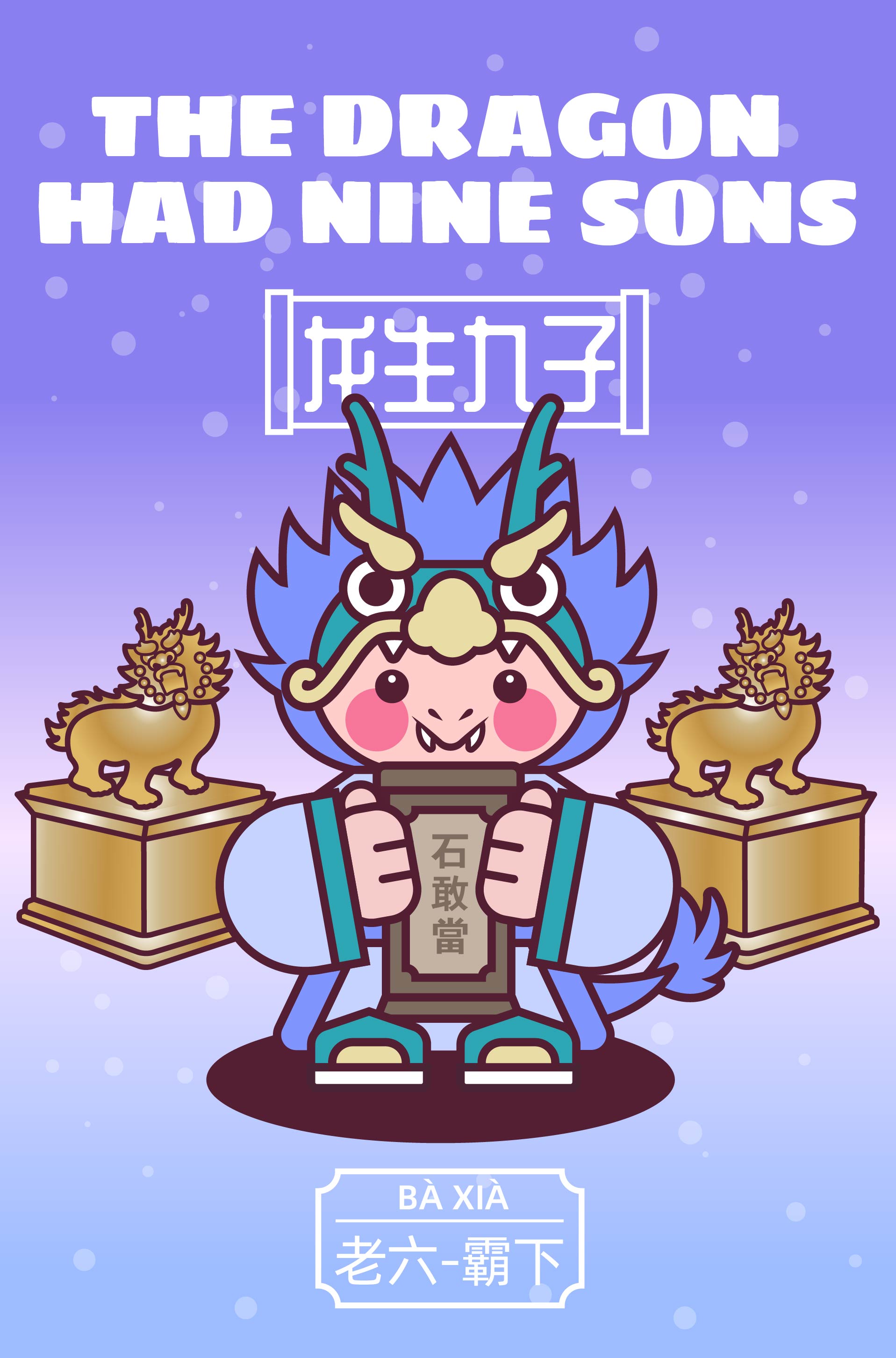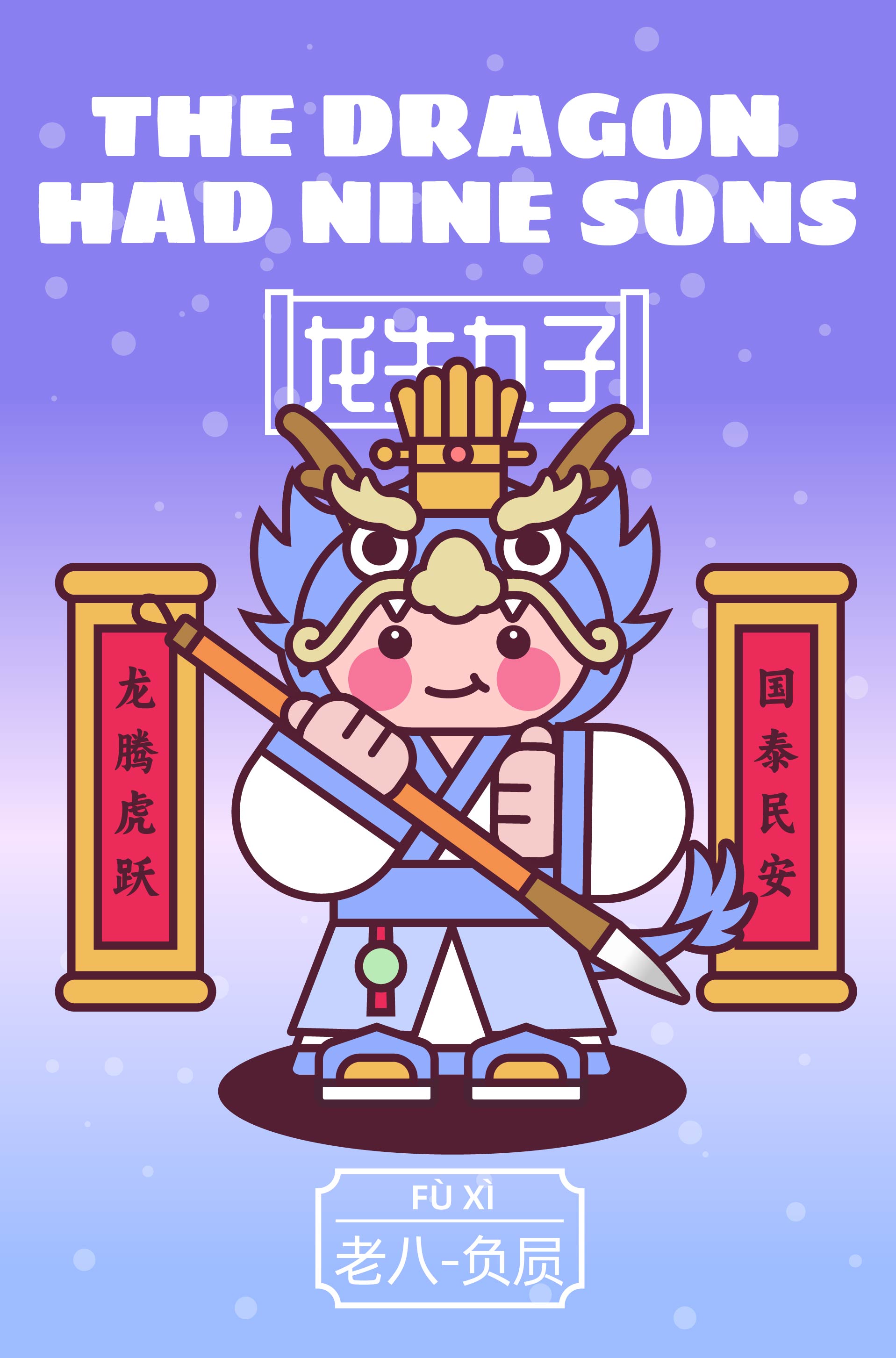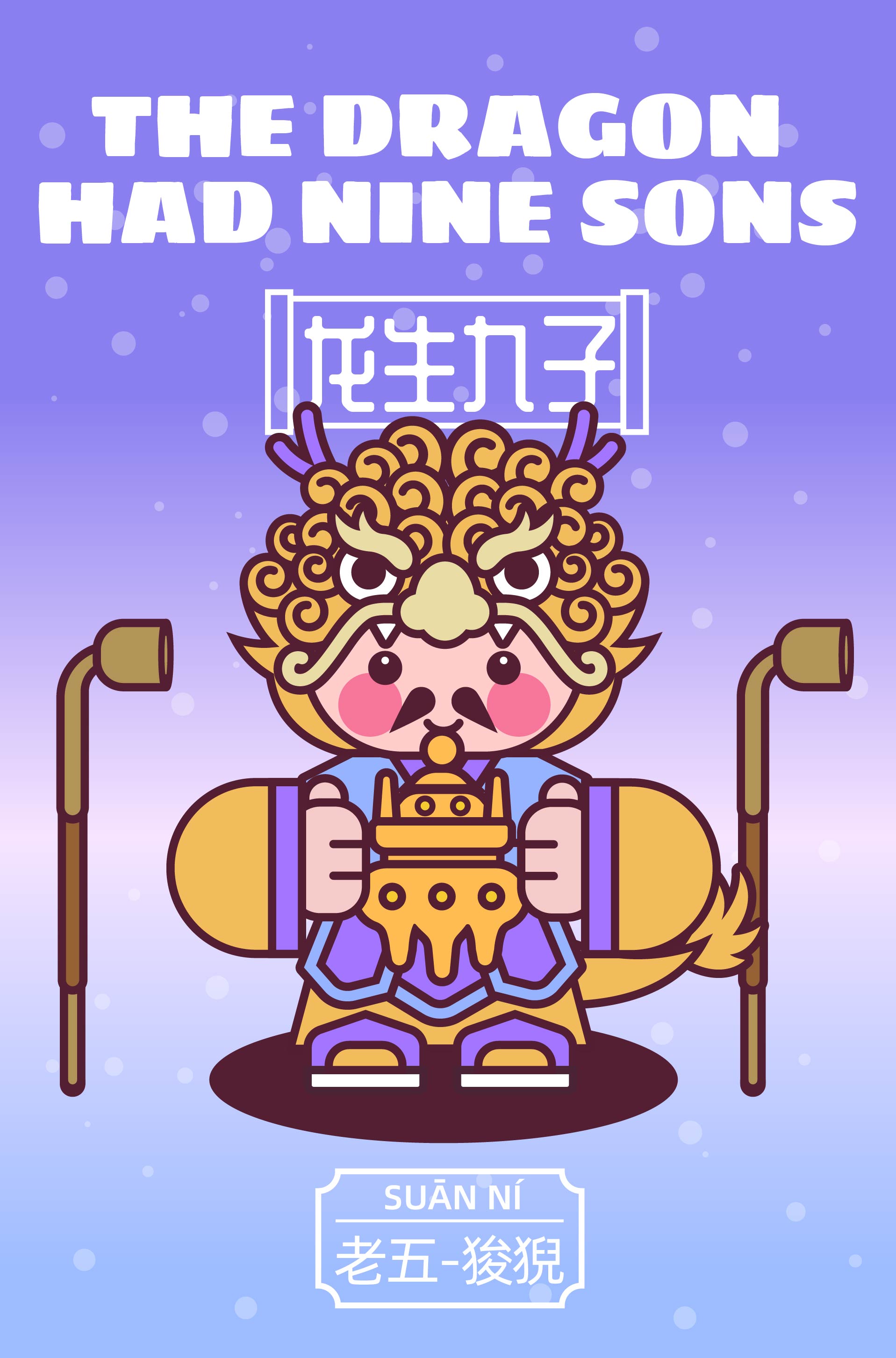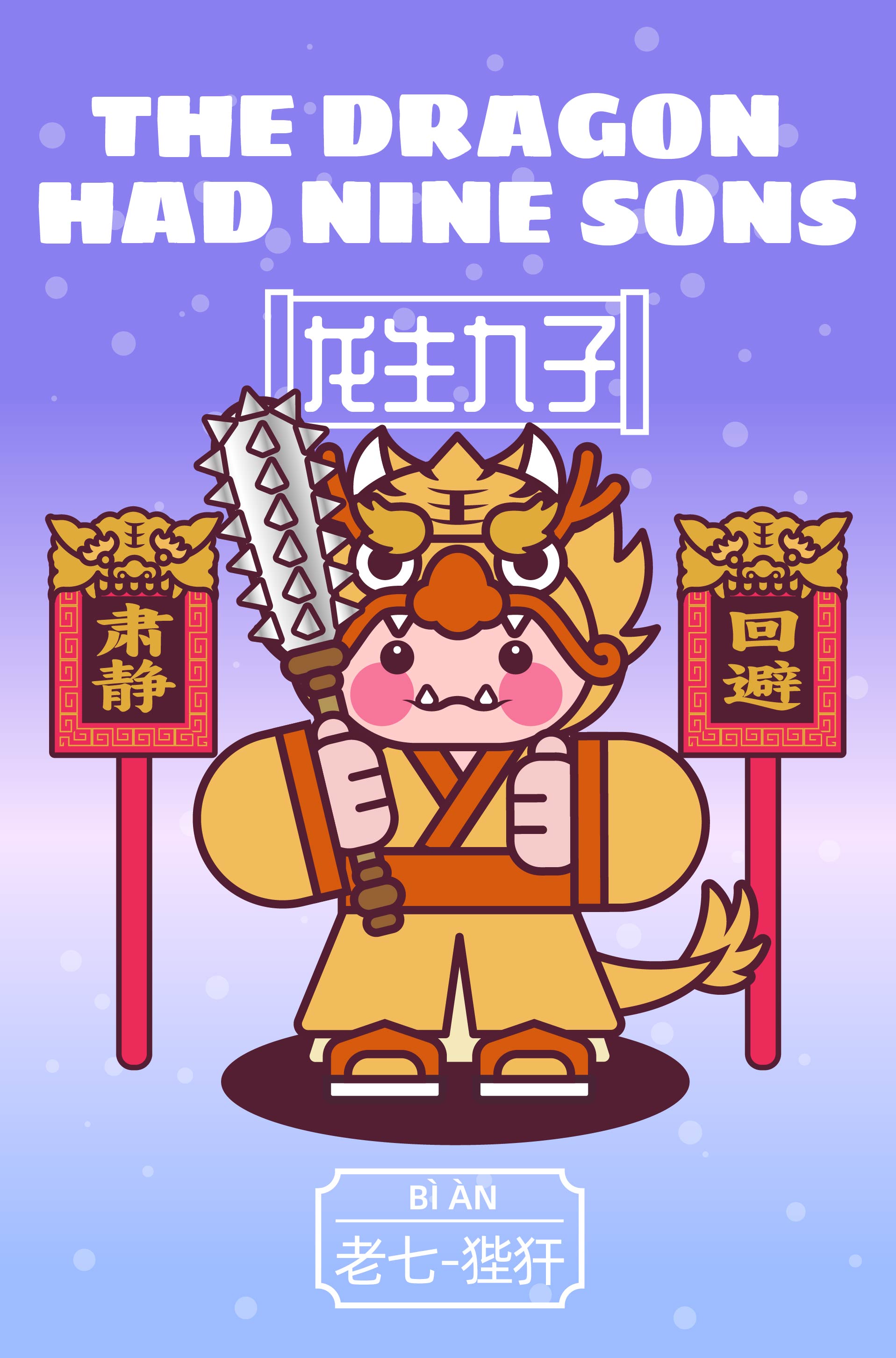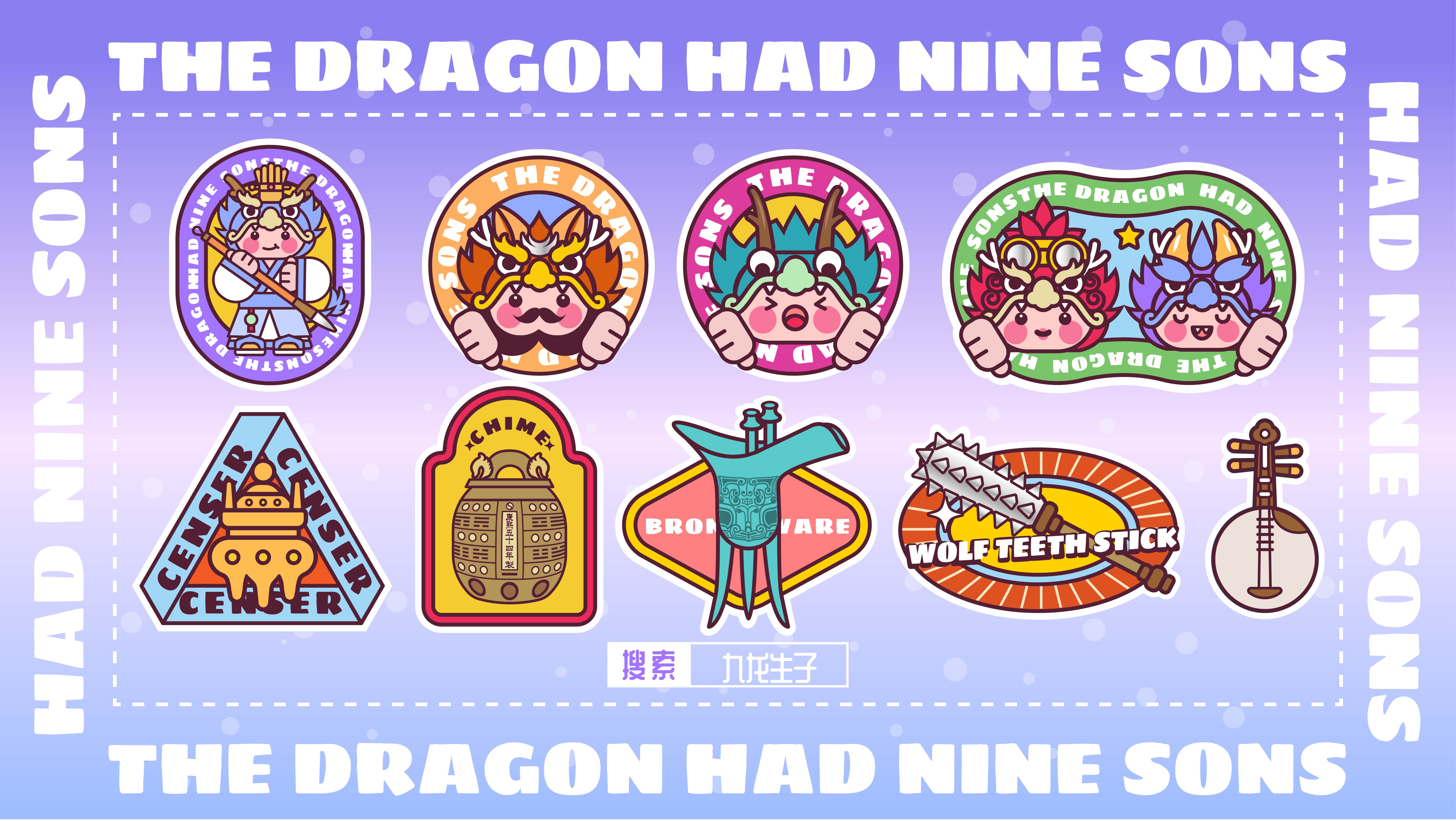 作品以中国传统神话“龙生九子”为主题,描绘了龙的九子围绕宫殿散落于不同方位,各自以鲜明的形象特征呈现: 囚牛伏于琴头,双目微闭聆听乐音; 睚眦怒目獠牙,手握剑柄; 嘲风立于殿角,昂首远眺; 蒲牢盘踞钟钮,似在嘶吼; 狻猊静卧香炉,吞烟吐雾; 霸下背负石碑,沉稳如山; 狴犴镇守狱门,威严凛然; 负屃缠绕碑文,文气萦绕; 螭吻口衔屋脊,守望建筑。 #文创展征集