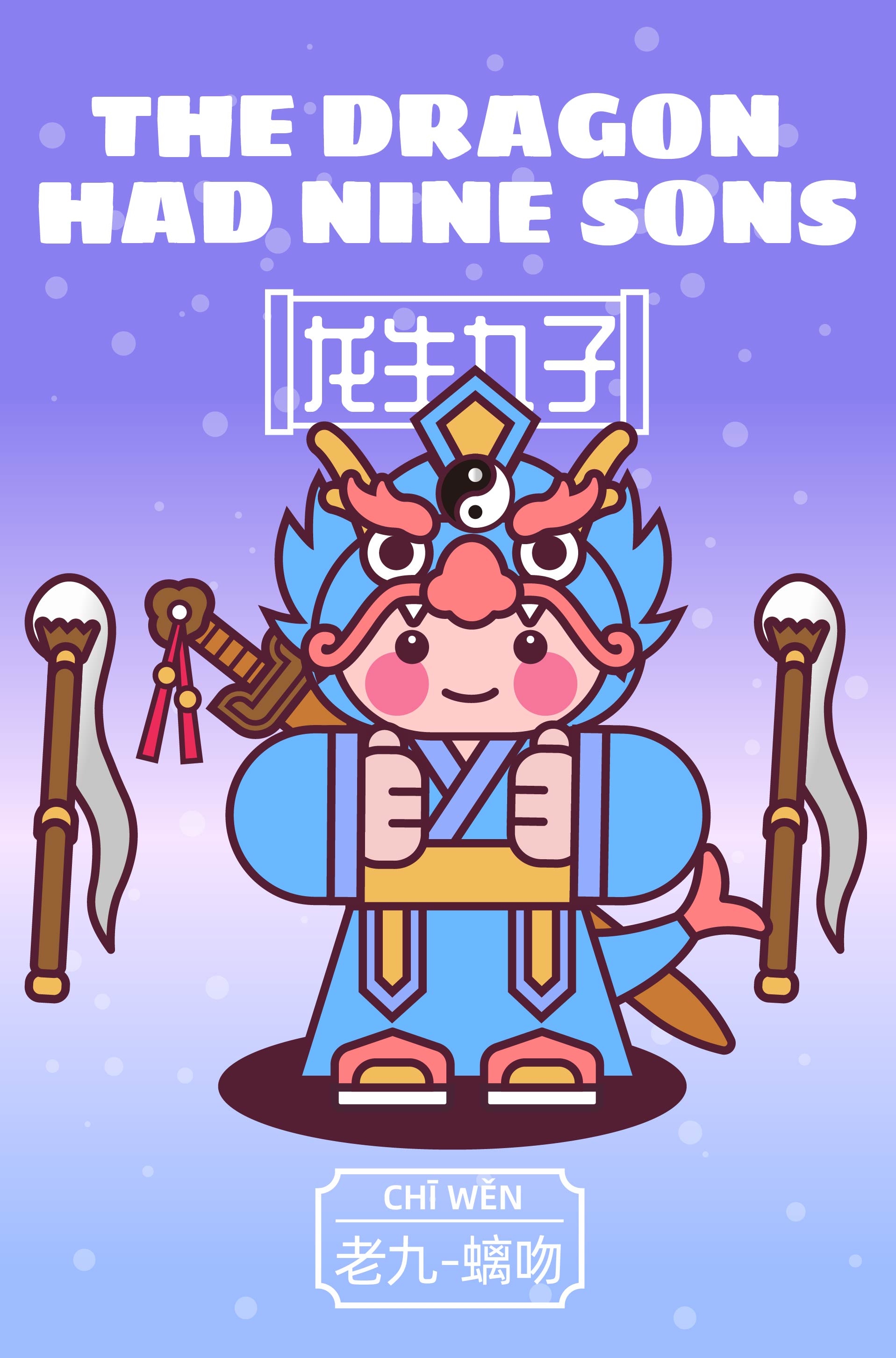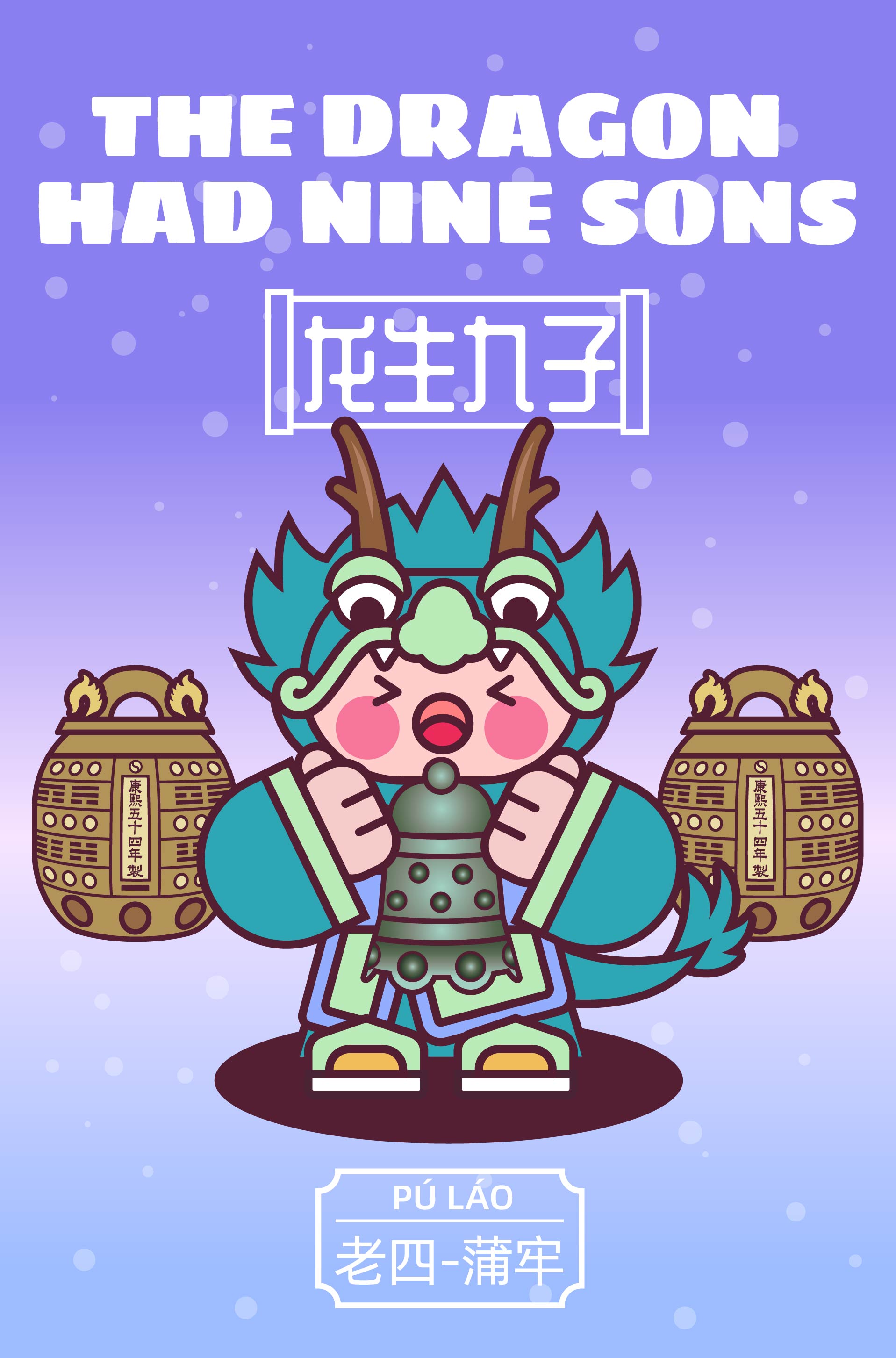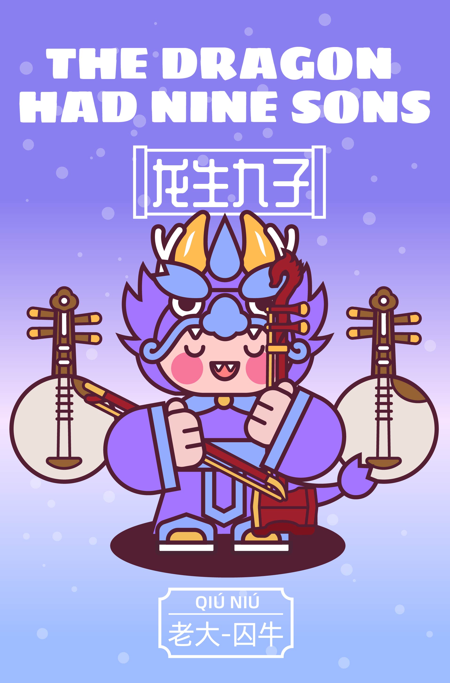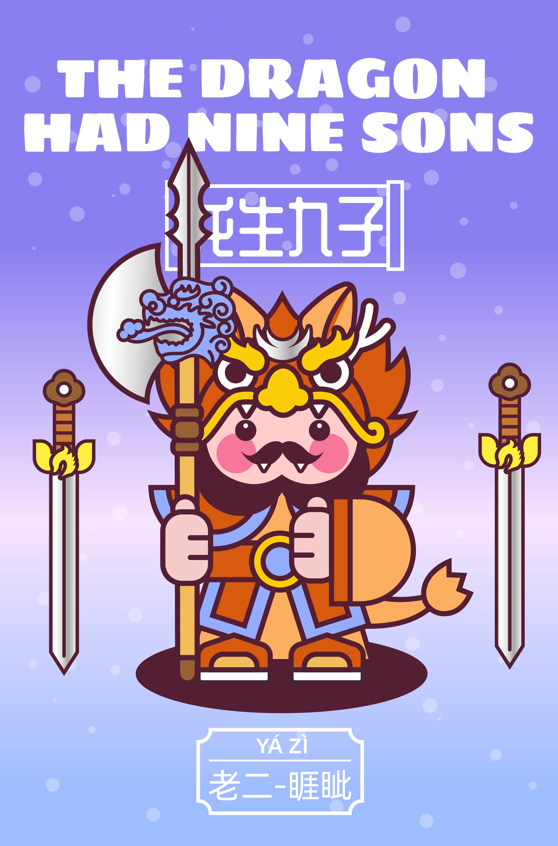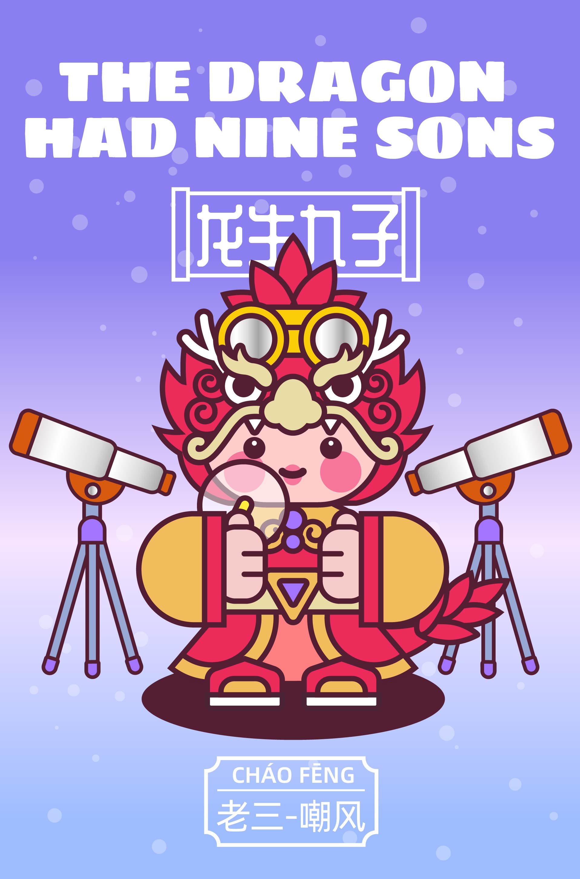 作品以中国传统神话“龙生九子”为主题,描绘了龙的九子围绕宫殿散落于不同方位,各自以鲜明的形象特征呈现: 囚牛伏于琴头,双目微闭聆听乐音; 睚眦怒目獠牙,手握剑柄; 嘲风立于殿角,昂首远眺; 蒲牢盘踞钟钮,似在嘶吼; 狻猊静卧香炉,吞烟吐雾; 霸下背负石碑,沉稳如山; 狴犴镇守狱门,威严凛然; 负屃缠绕碑文,文气萦绕; 螭吻口衔屋脊,守望建筑。 #文创展征集