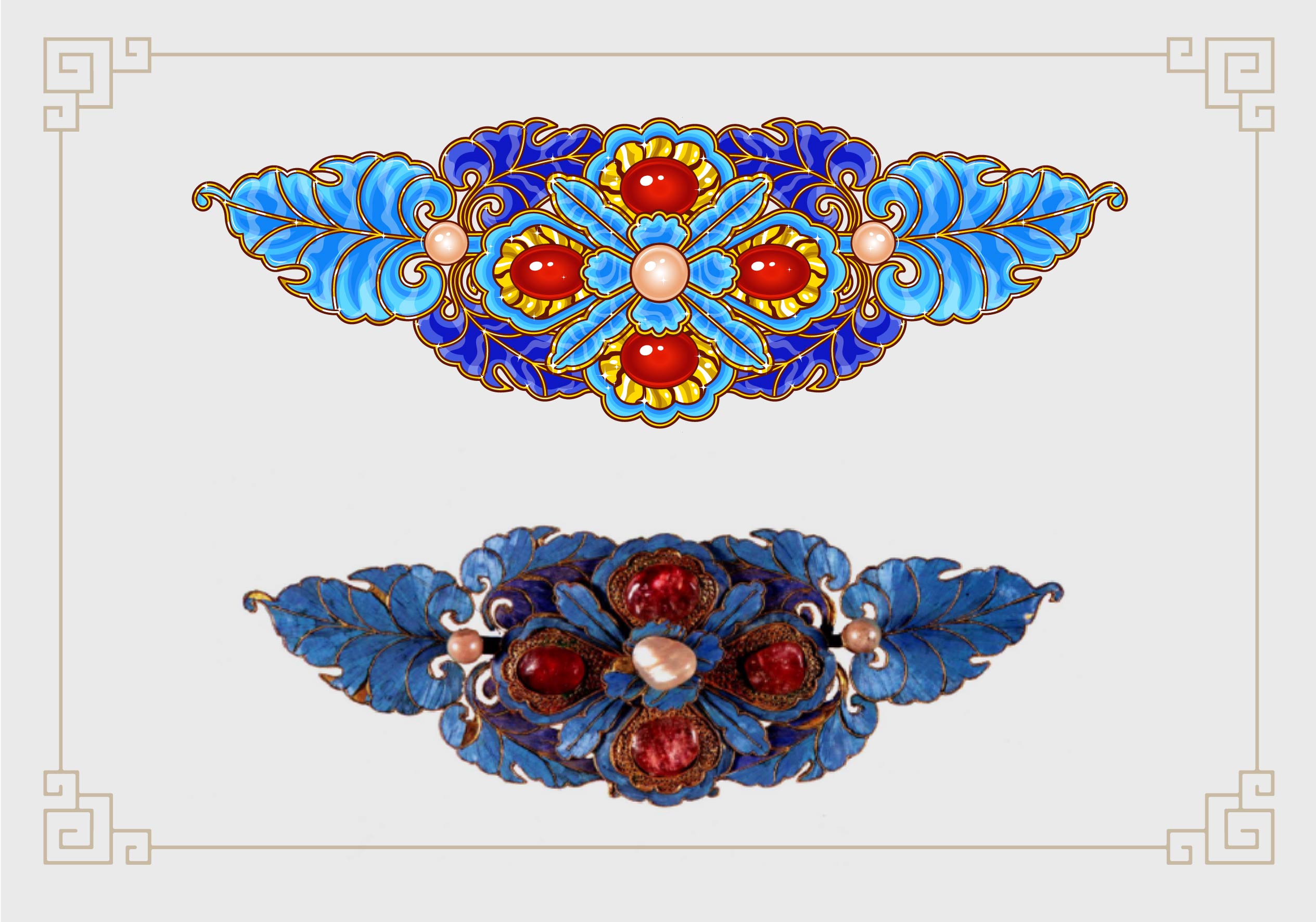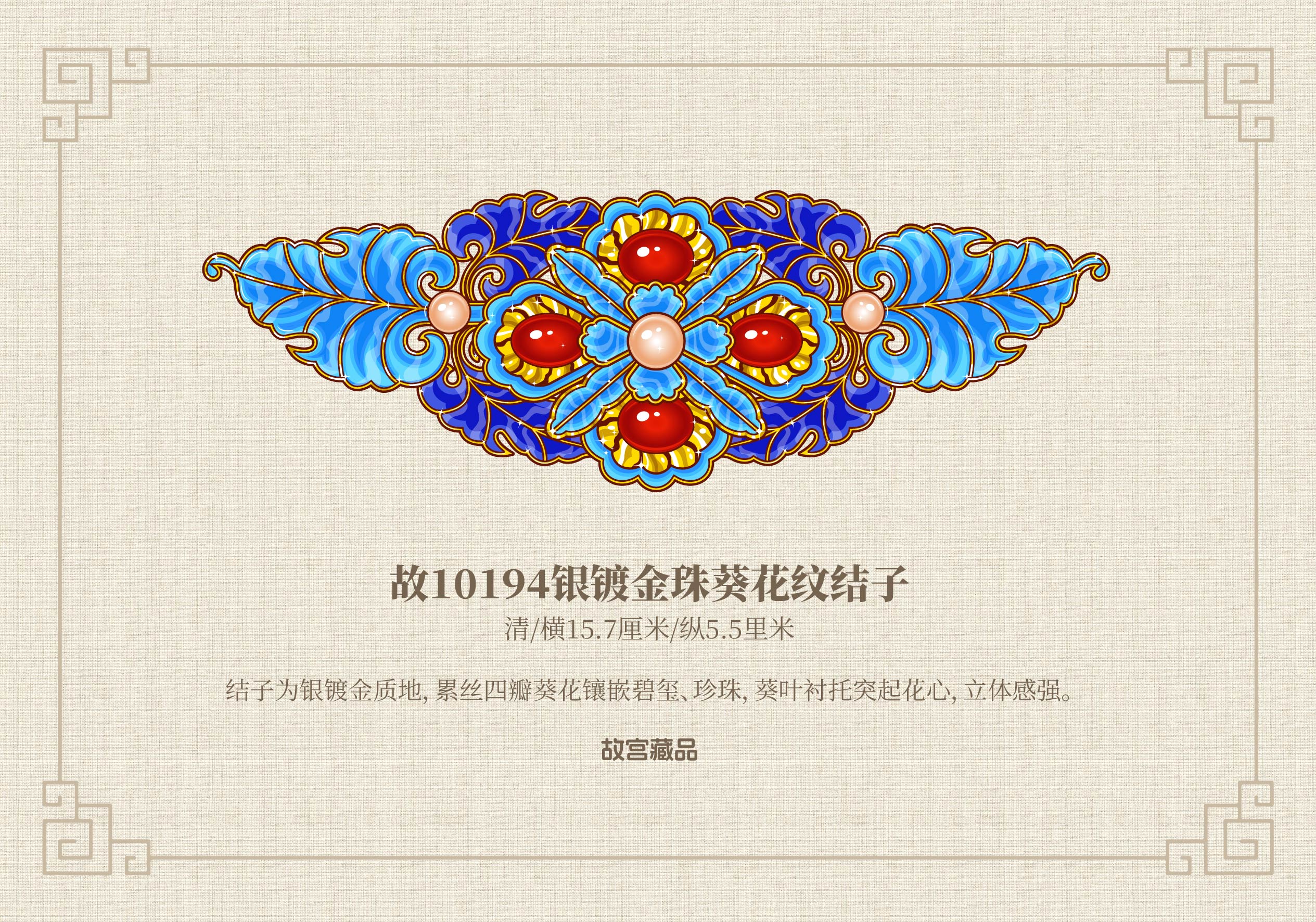 故10194银镀金珠葵花纹结子 清/横15.7厘米/纵5.5里米 结子为银镀金质地,累丝四瓣葵花镶嵌碧玺、珍珠,葵叶衬托突起花心,立体感强。