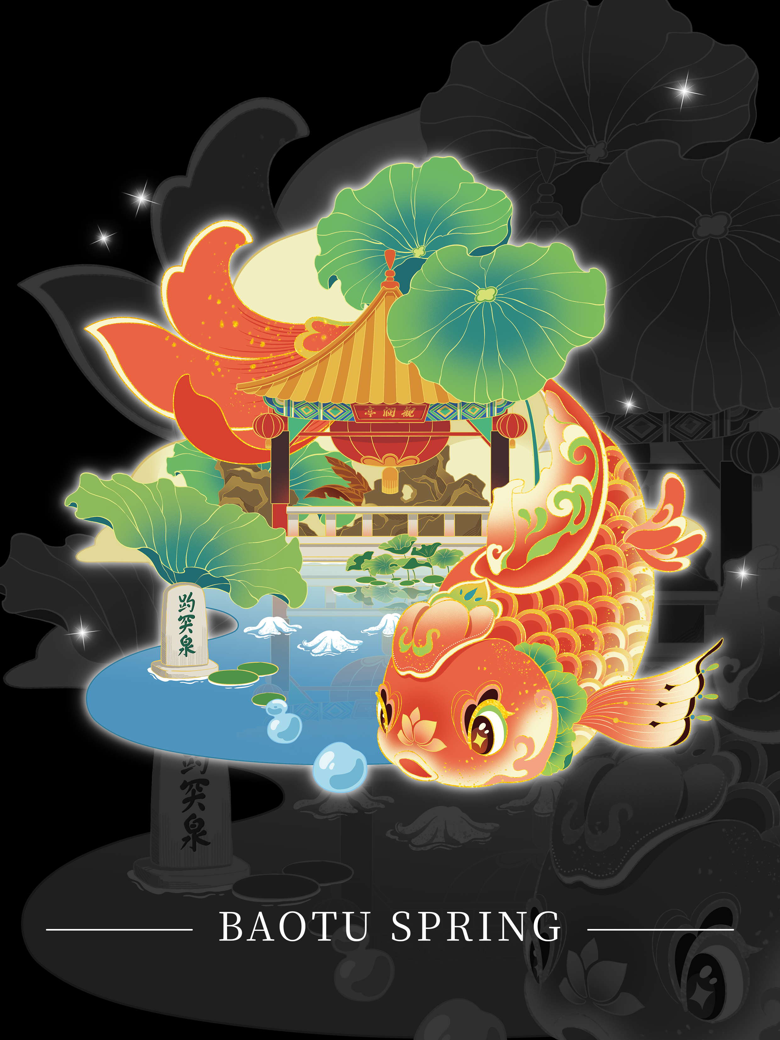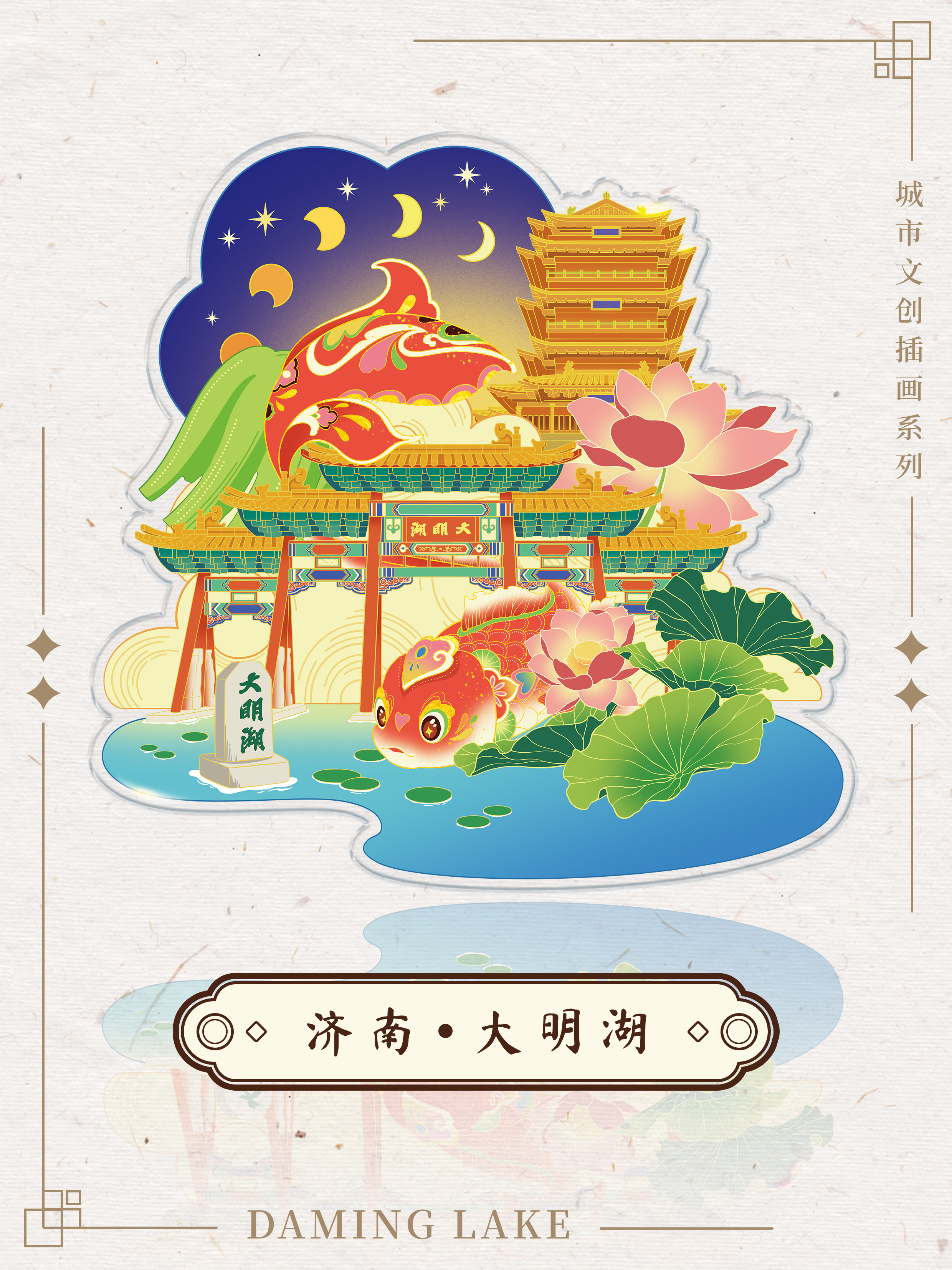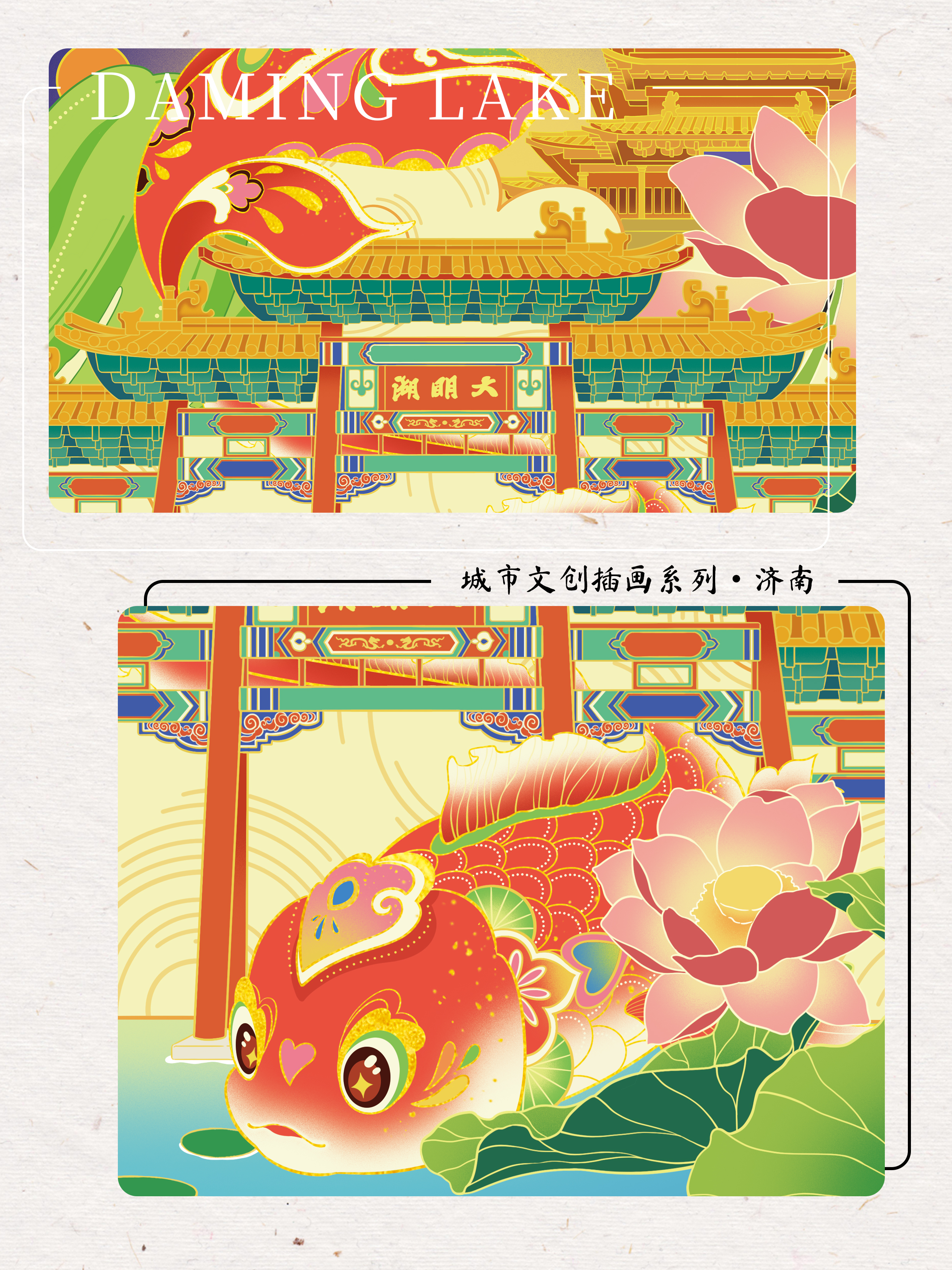 以济南两个知名景点:趵突泉和大明湖为主题设计的两款文创插画,用代表好运的锦鲤和济南特色元素荷花荷叶、柳树、泉水等相结合,能很好的展现泉城济南“四面荷花三面柳,一城山色半城湖”的美丽景色。