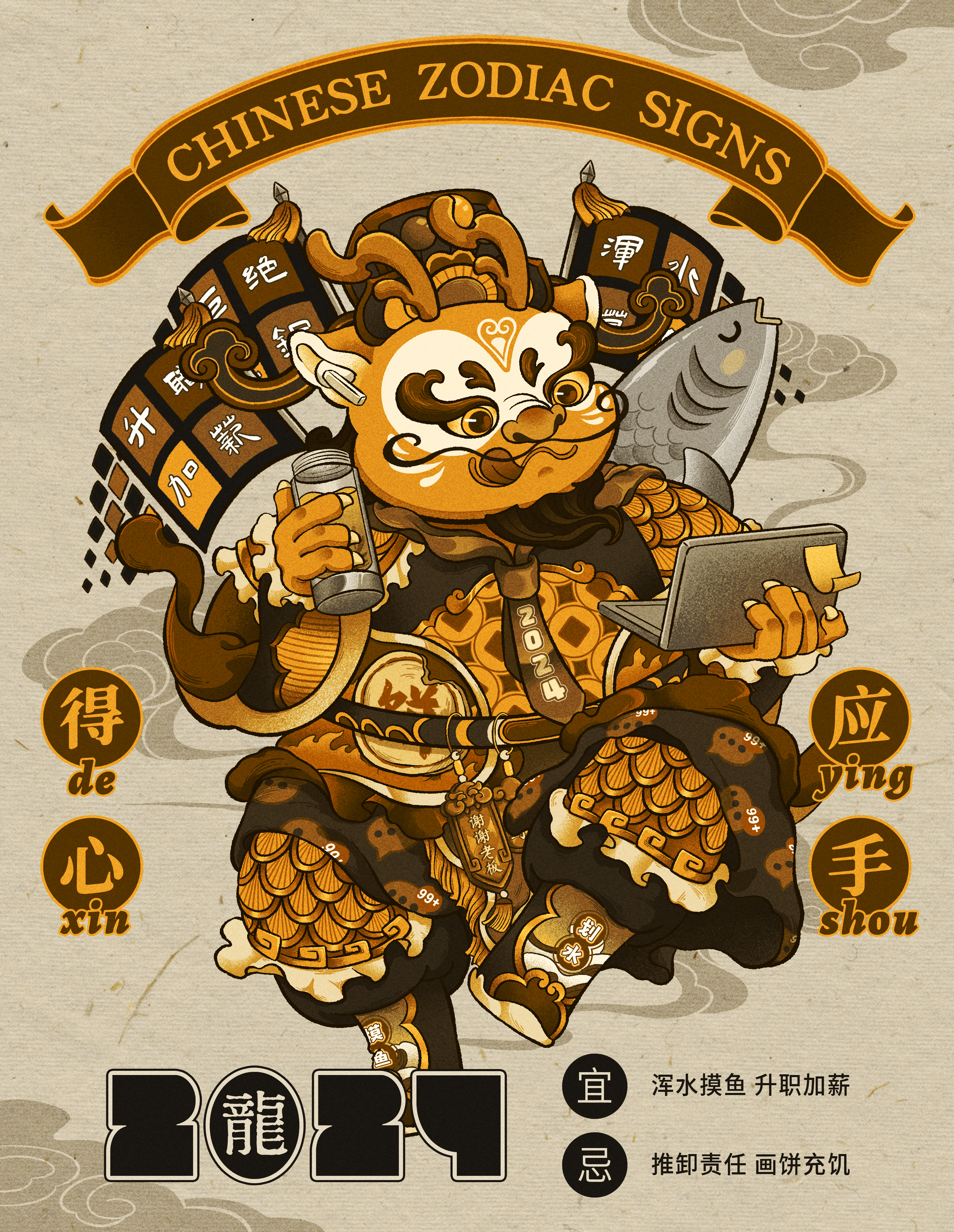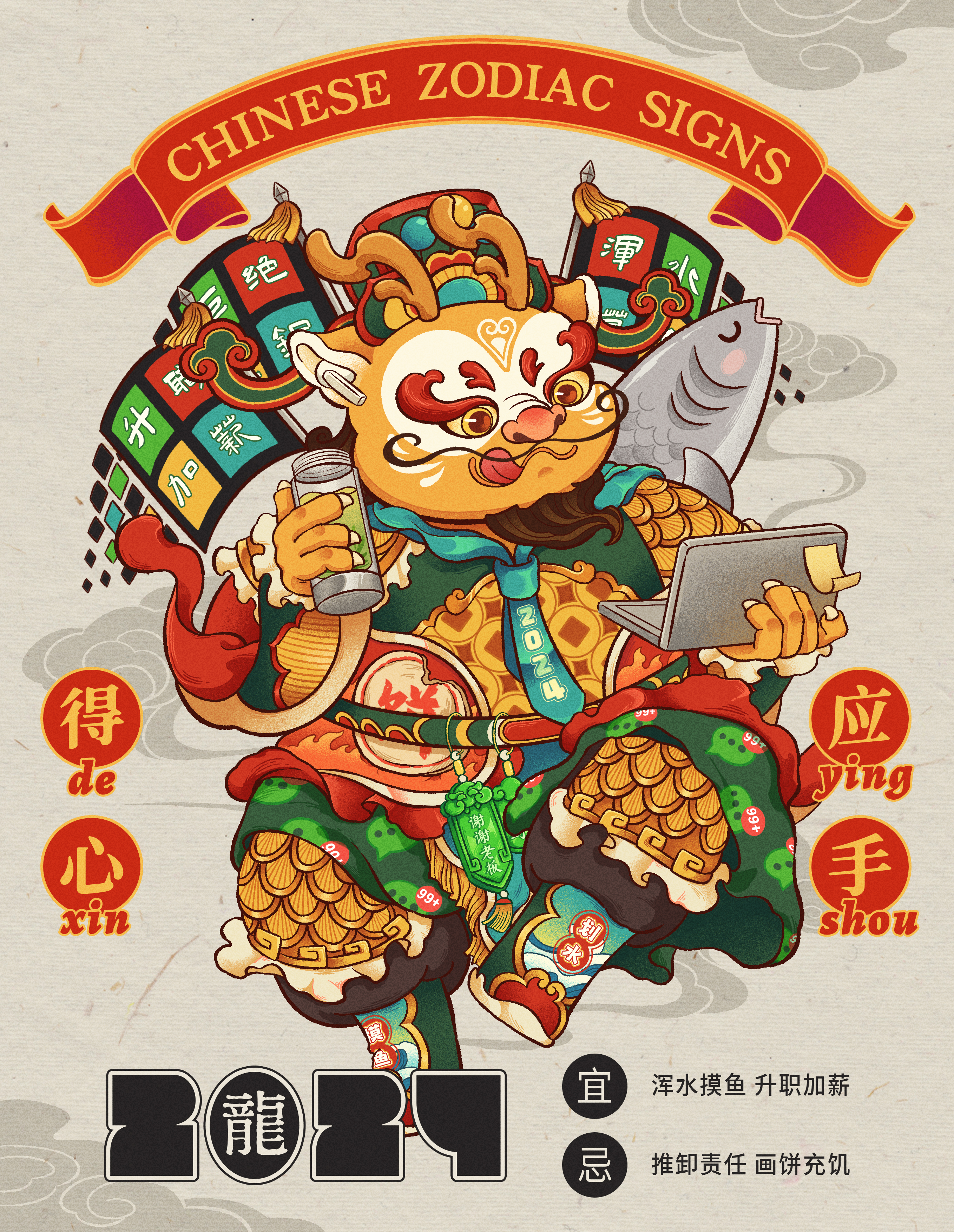 以拟人化的龙为原型,创作的趣味龙年门神插画,采用中国风和潮流插画结合的绘制技巧