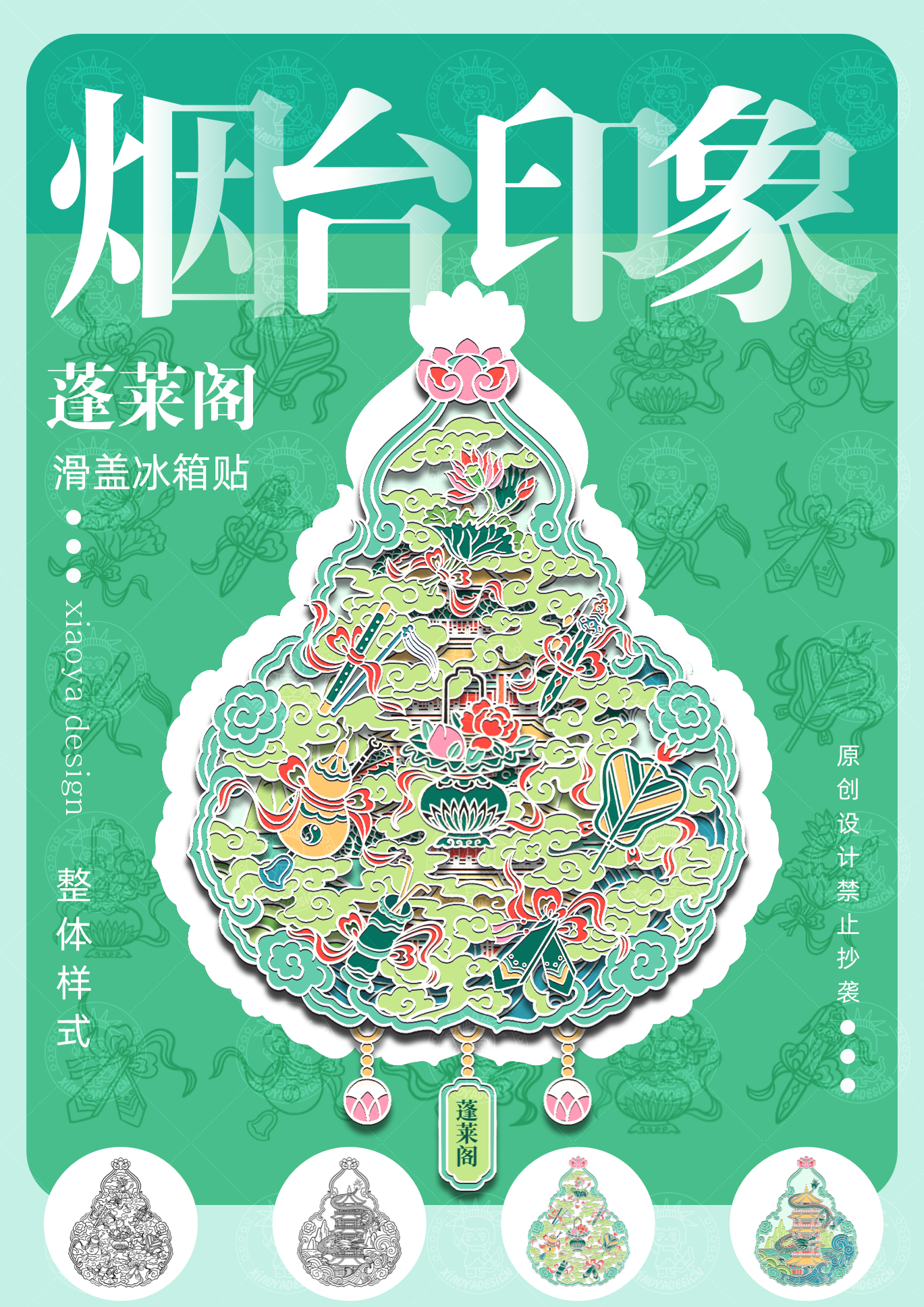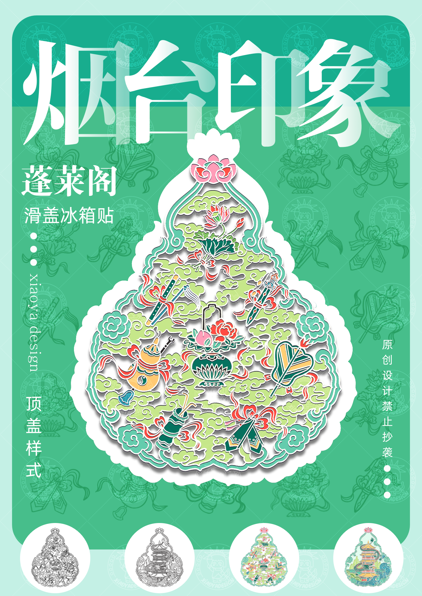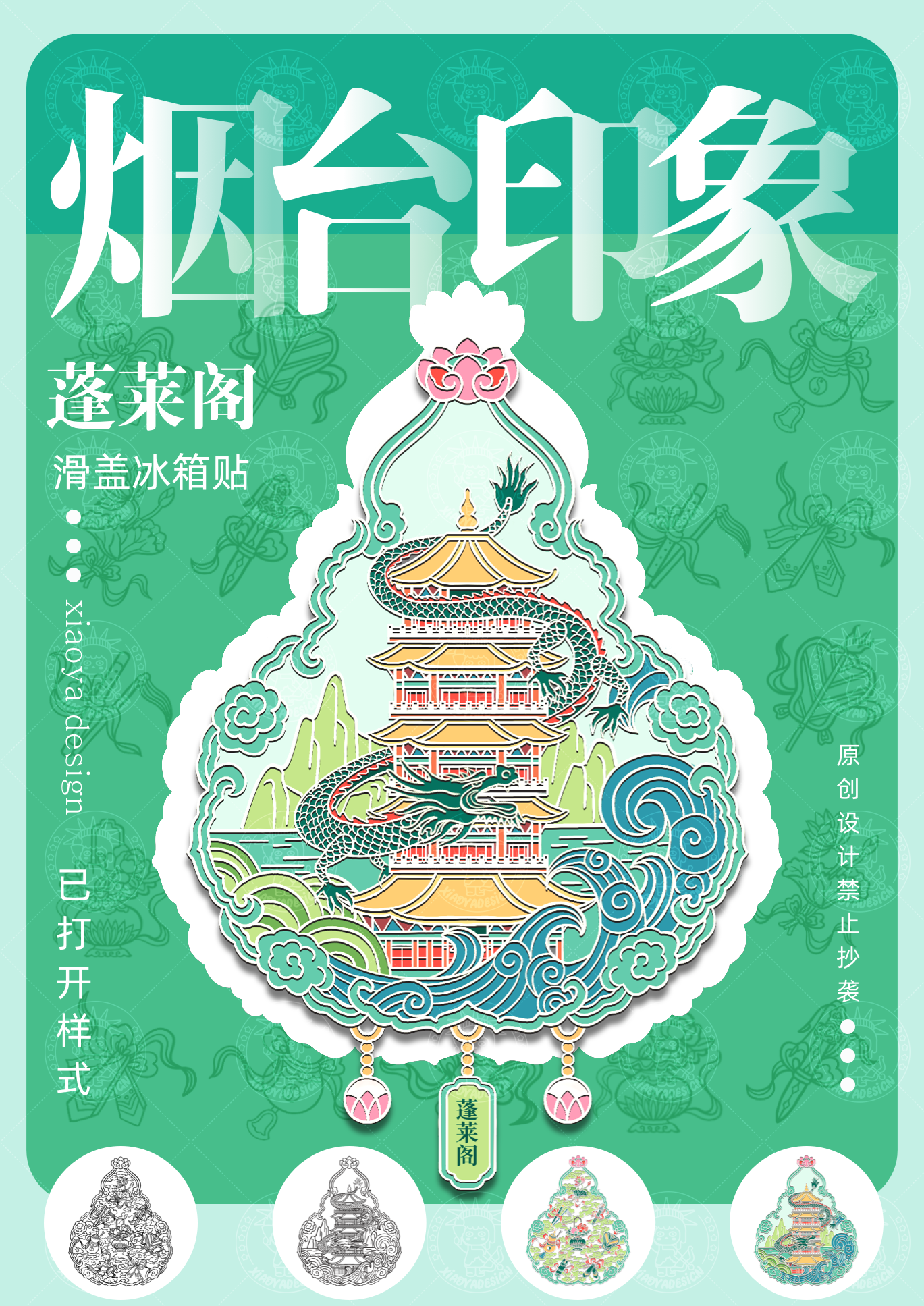 ✨ **「宝葫纳福,一滑见蓬莱」 外层设计:暗八仙纹样交织祥云,勾勒宝葫芦轮廓,古典纹样诉说道家仙韵,指尖轻推,开启一段寻仙之旅。 内层惊喜:滑盖之下,蓬莱阁跃然眼前!海浪托起琼楼玉宇,蟠龙盘踞祥云间,灵草点缀其中,蓝绿主色调如碧海青天,点缀明黄、绯红,瞬间点亮冰箱上的“东海仙境”。 设计巧思 1、葫芦谐音“福禄”,暗八仙护佑吉祥,滑动互动增添趣味。 2、海浪纹与建筑浮雕工艺细腻,龙纹象征尊贵,每一笔都是对蓬莱仙境的诗意还原。 🎁 **收藏理由** 冰箱上的“微型非遗”!旅游纪念、馈赠亲友,让山海神话融入日常,每次开合都是与仙阁的隔空对话~
