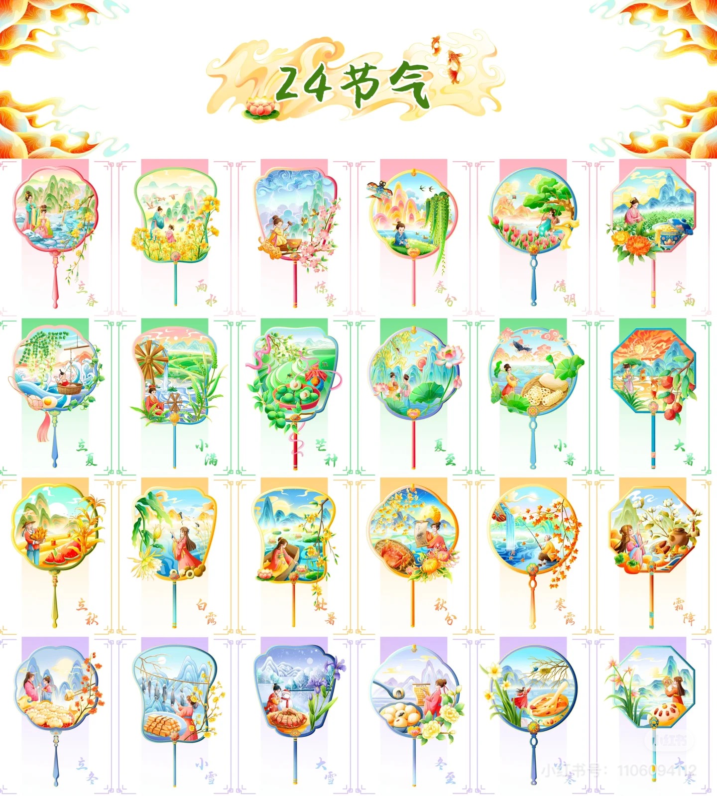 【执扇观岁时|二十四节气化作掌心风雅】当青绿山水晕染惊蛰的雨,蝉翼纱上栖着立夏的荷,二十四番花信风穿过千年光阴,在团扇上悄然绽放——我把四季裁成画,将流年写成诗。