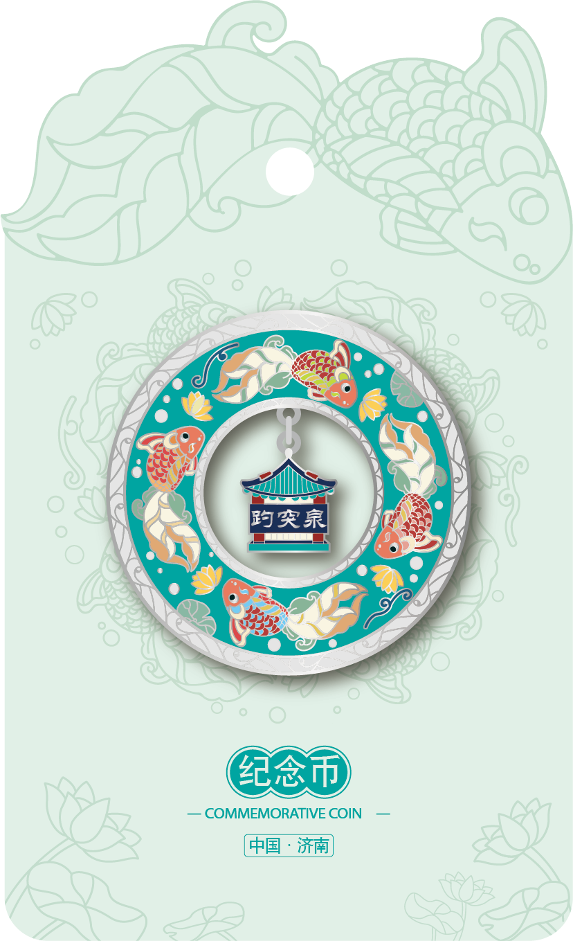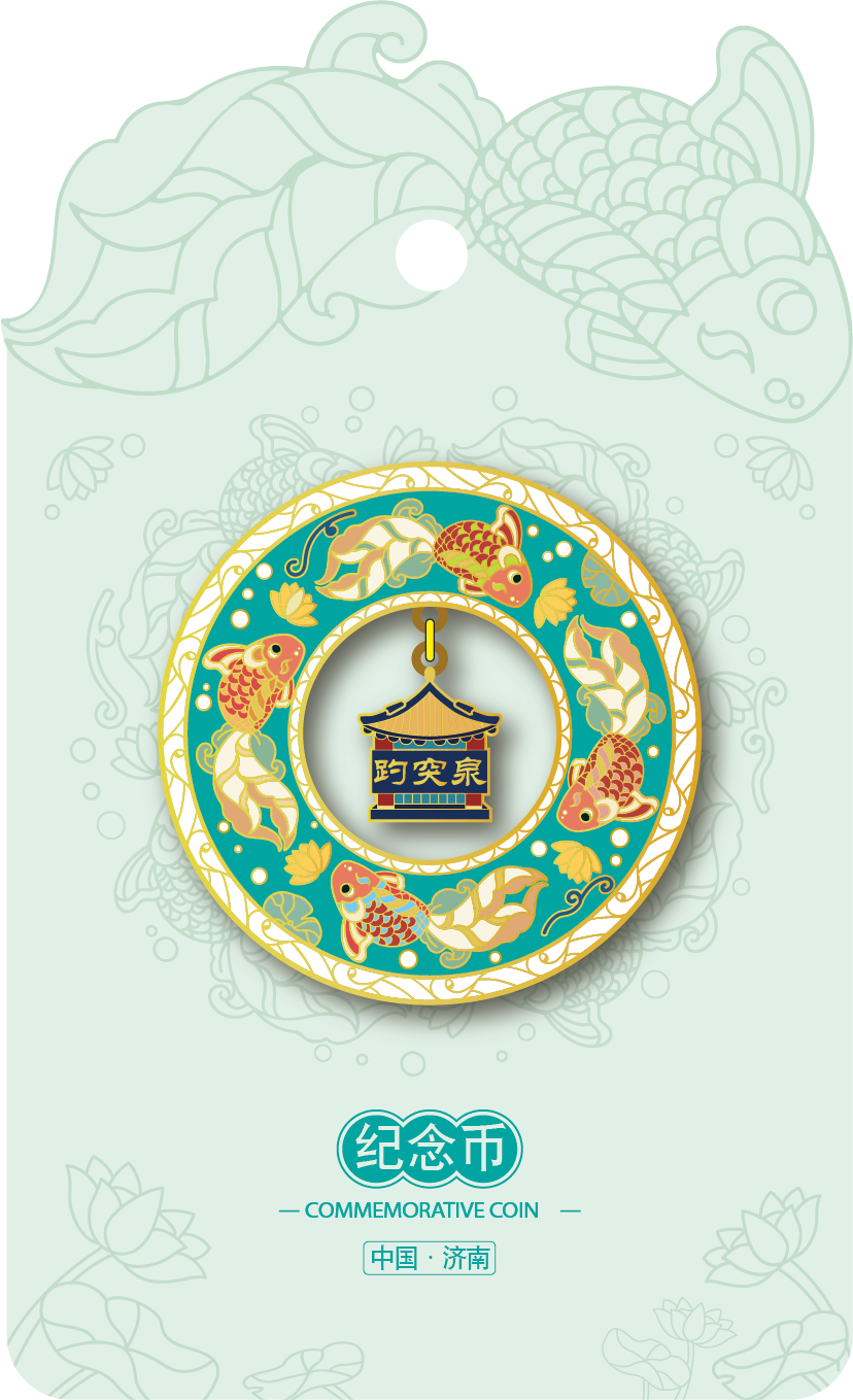 中心浮雕观澜亭景观,外圈环绕三尾游弋锦鲤;喷涌泉水纹饰铺底,光面与磨砂质感交替呈现。