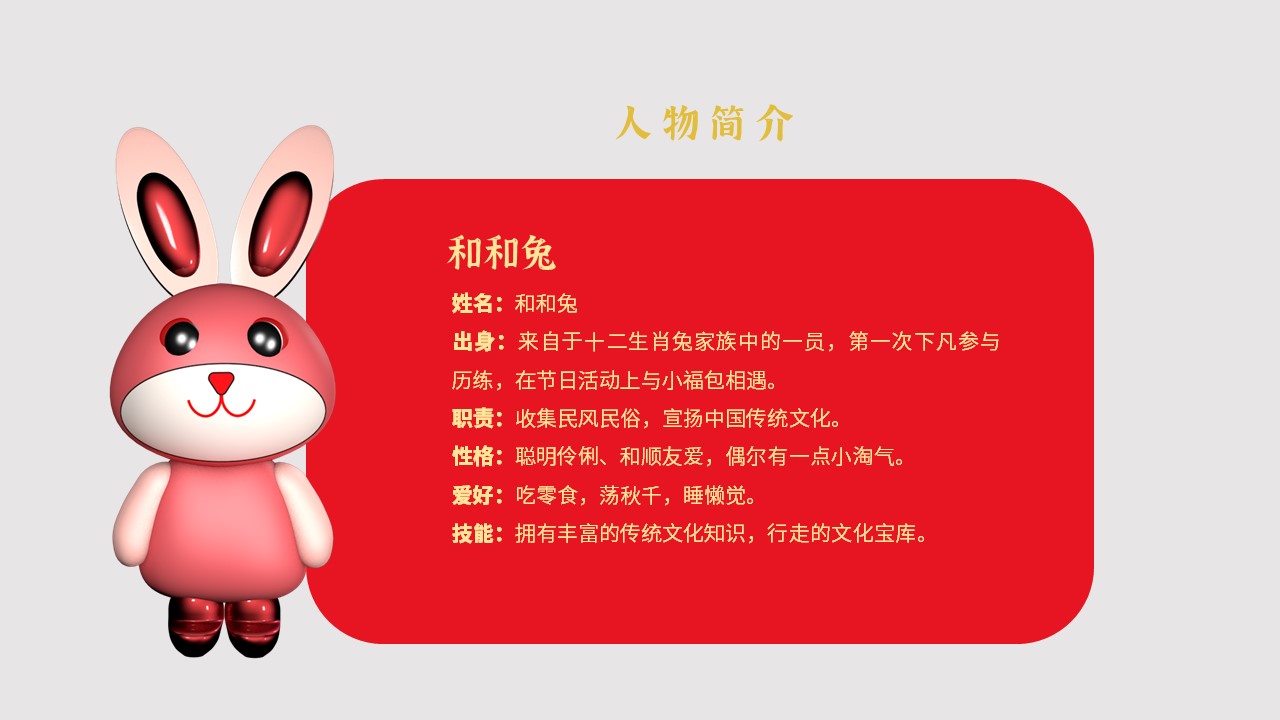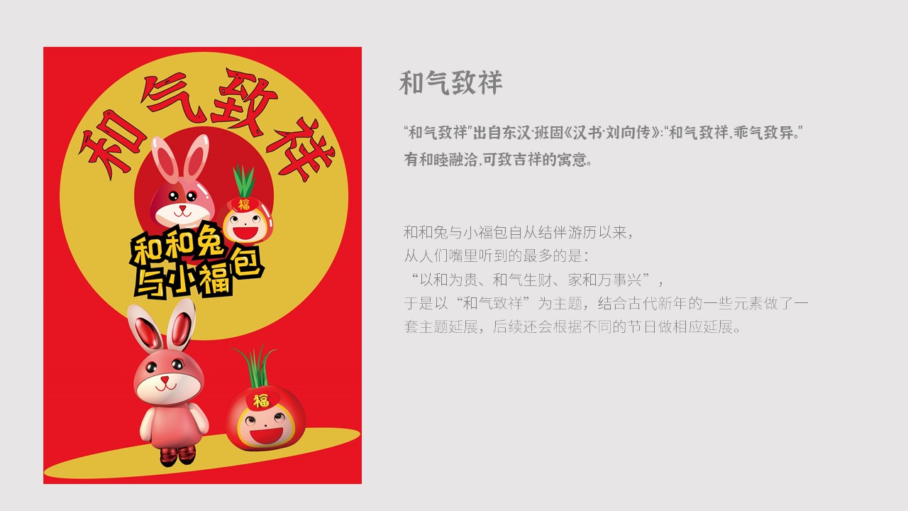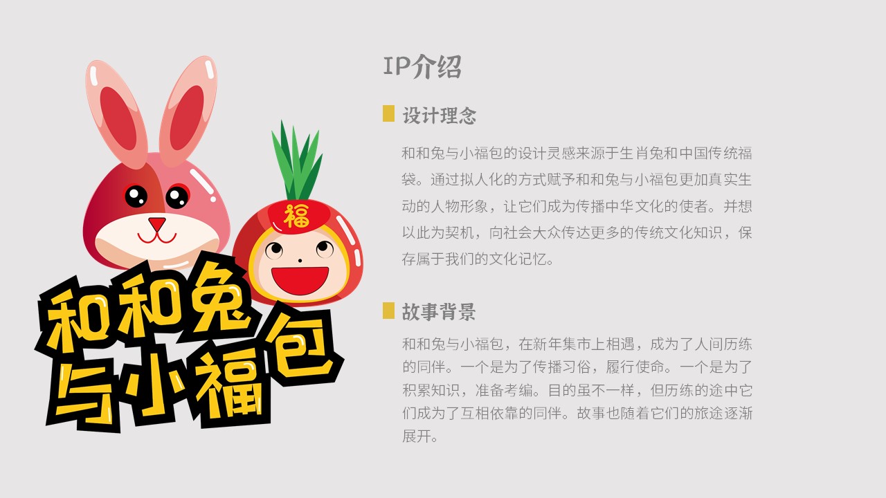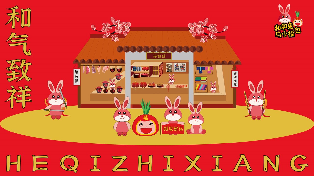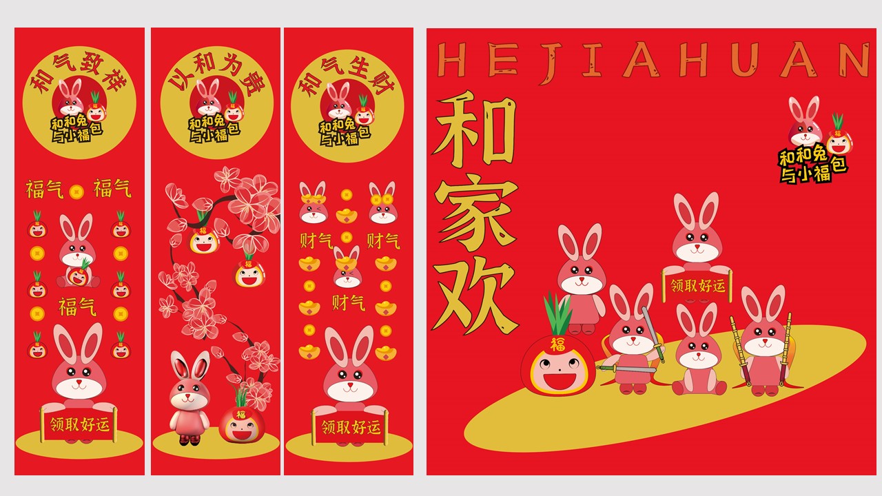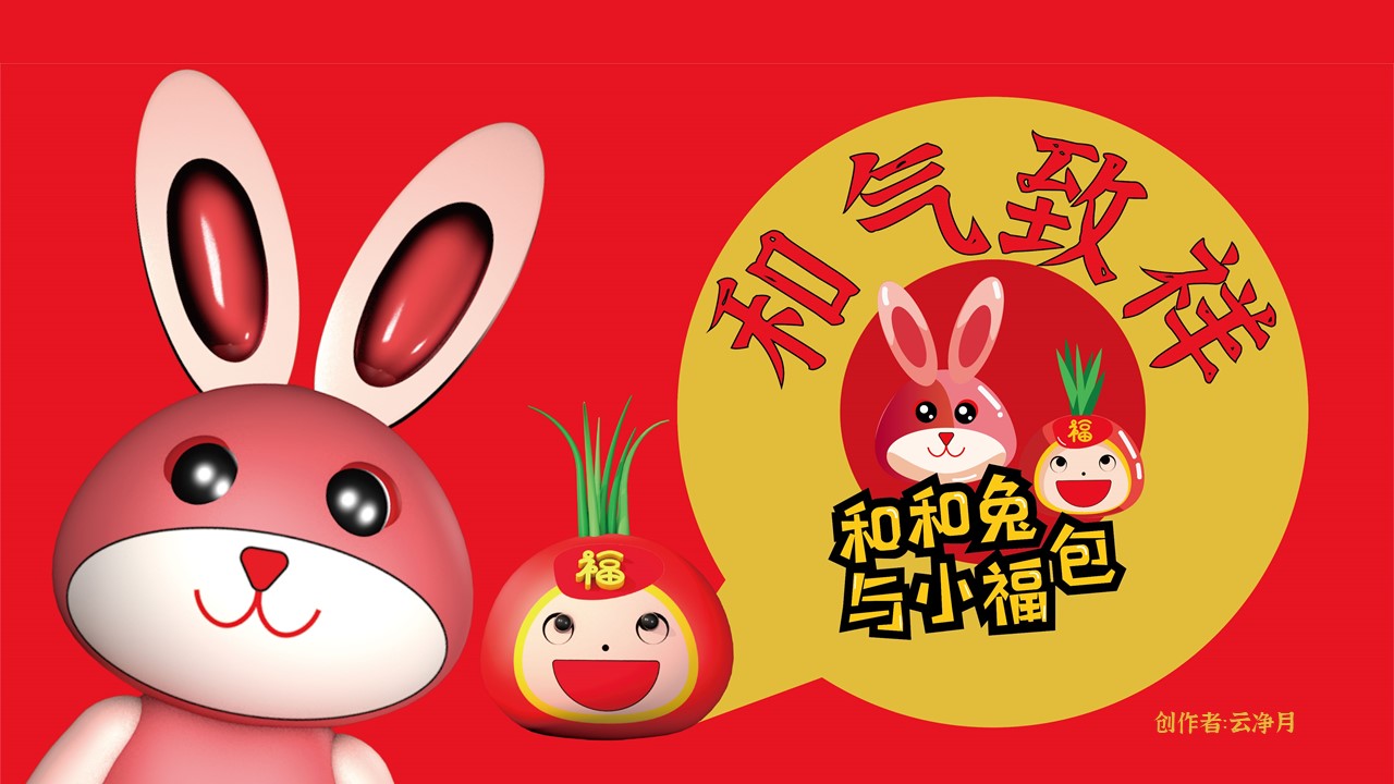 和和兔与小福包的设计灵感来源于生肖兔和中国传统福袋。通过拟人化的方式赋予和和兔与小福包更加真实生动的人物形象,让它们成为传播中华文化的使者。并想以此为契机,向社会大众传达更多的传统文化知识,保存属于我们的文化记忆。(已登记版权)