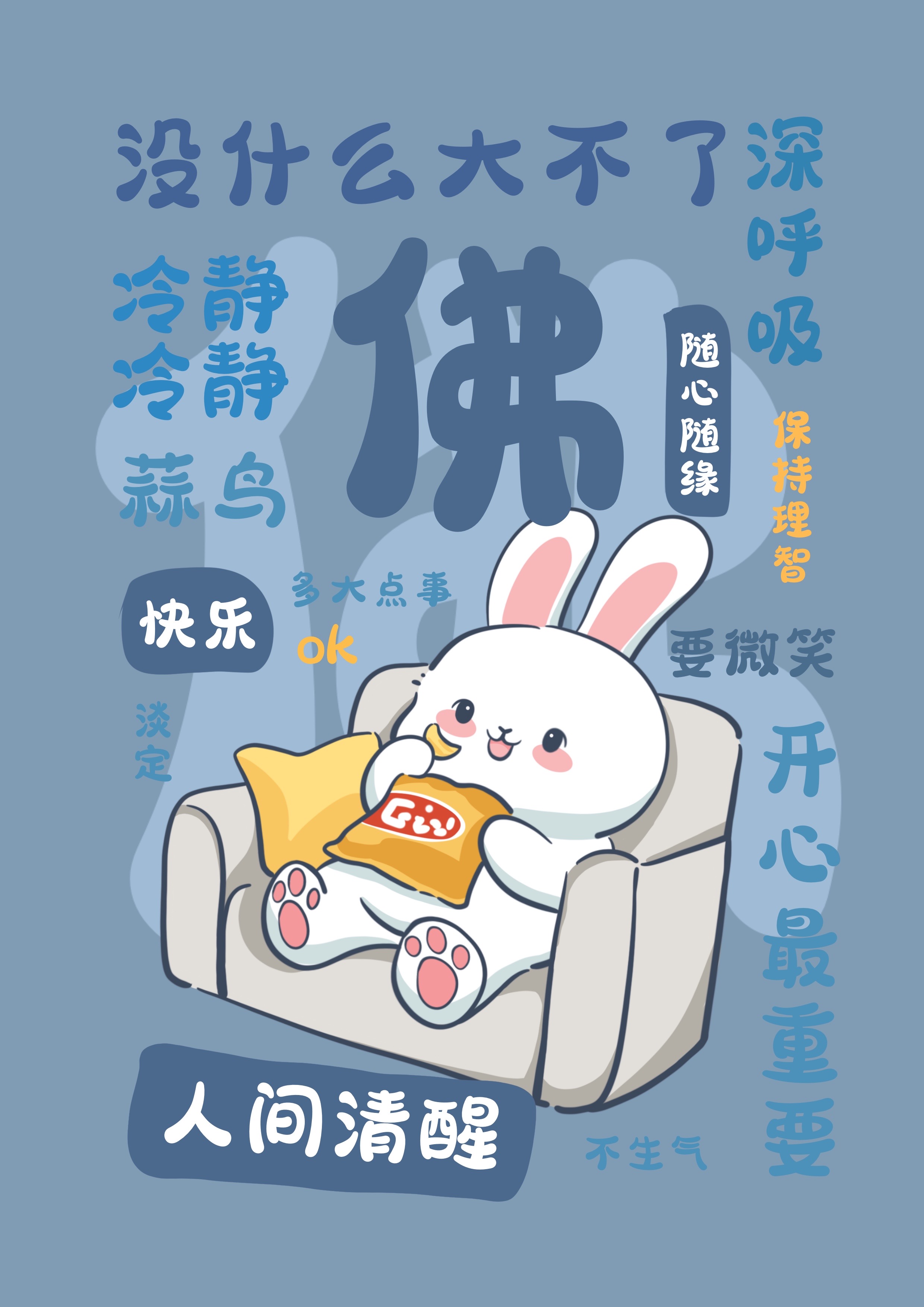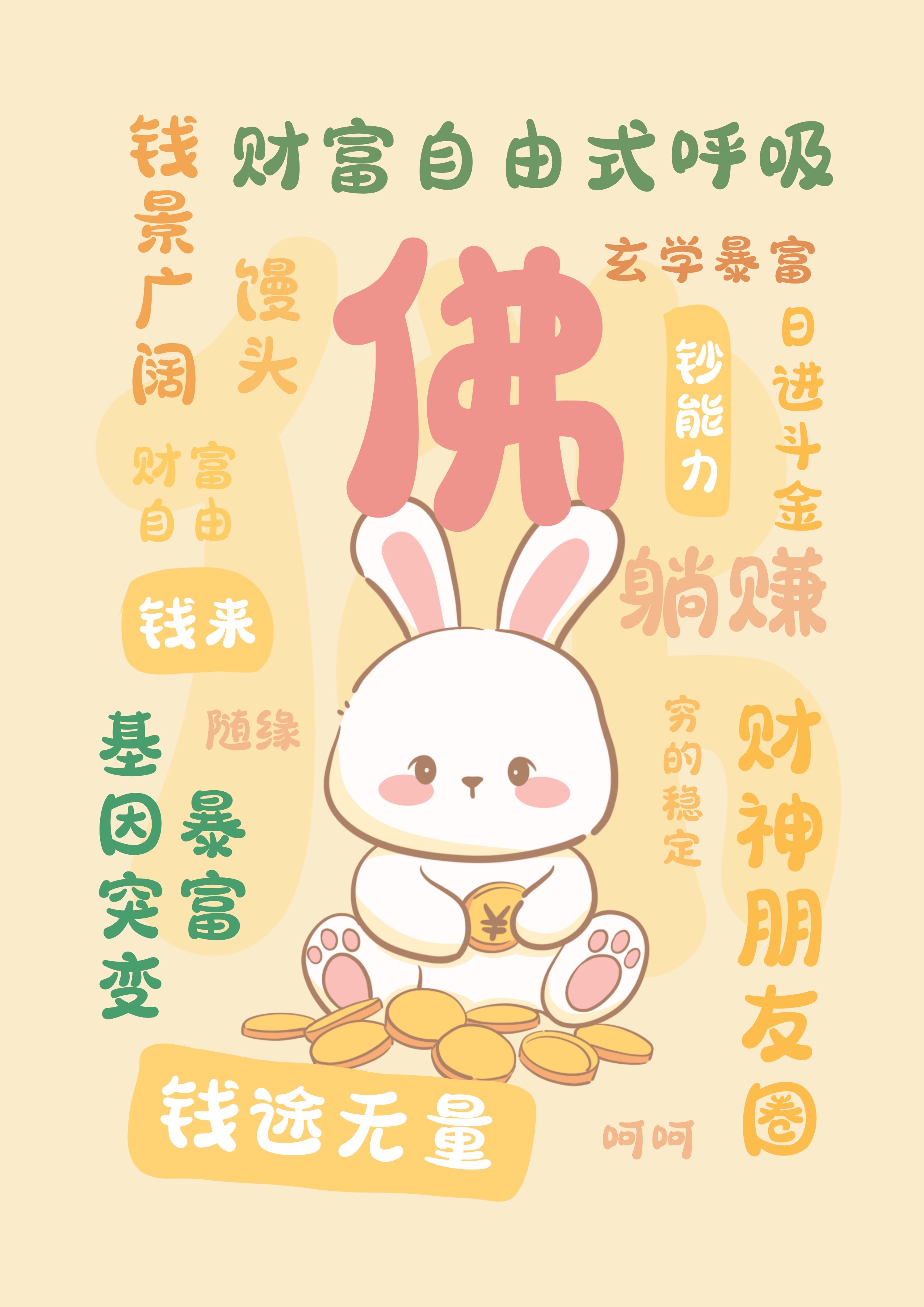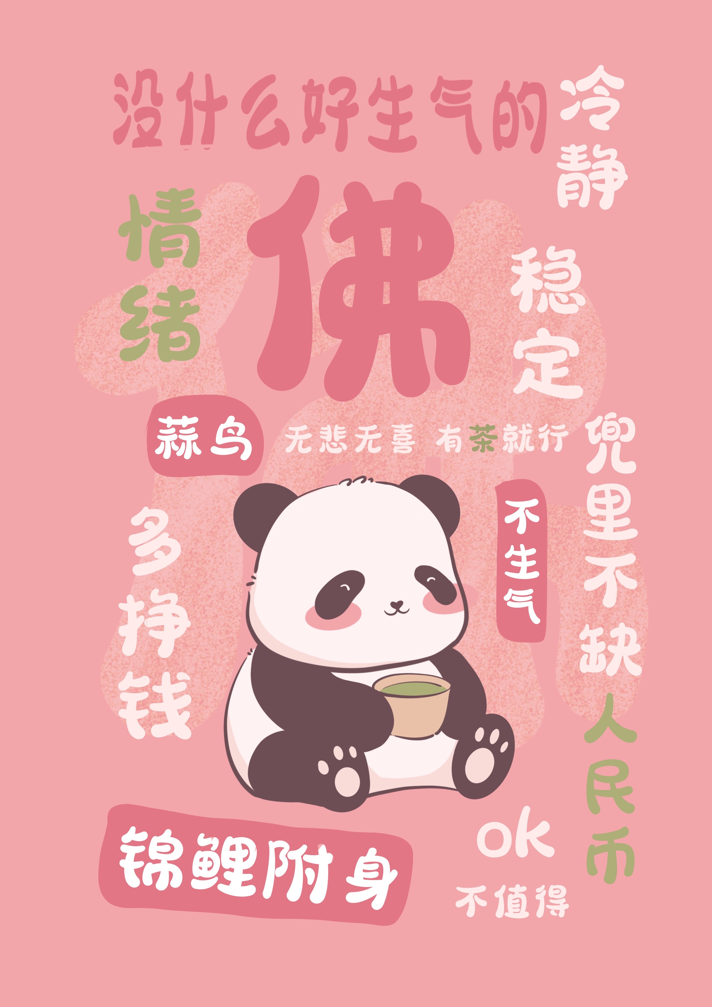 这幅可爱插画以憨态可掬的大熊猫和小兔子为主角,躺沙发山吃零食、悠闲的泡个澡、认真的数钱、端坐粉嫩背景中悠哉饮茶,用视觉松弛感直击现代人焦虑痛点! 环绕的文字矩阵暗藏玄机:“冷静”“情绪稳定” 像符咒镇住烦躁,“兜里不缺人民币”“多挣钱” 用幽默坦白人间清醒,“锦鲤附身” 增添好运buff,而 “蒜鸟”“不值得” 等网络梗犀利解构琐事烦恼。 整体用萌系画风包裹犀利生活哲学:调安抚神经,错落文字如弹幕般解压,劝你放下纠结、佛系搞钱——毕竟,生气不如喝茶,玄学不如钱包满呀!