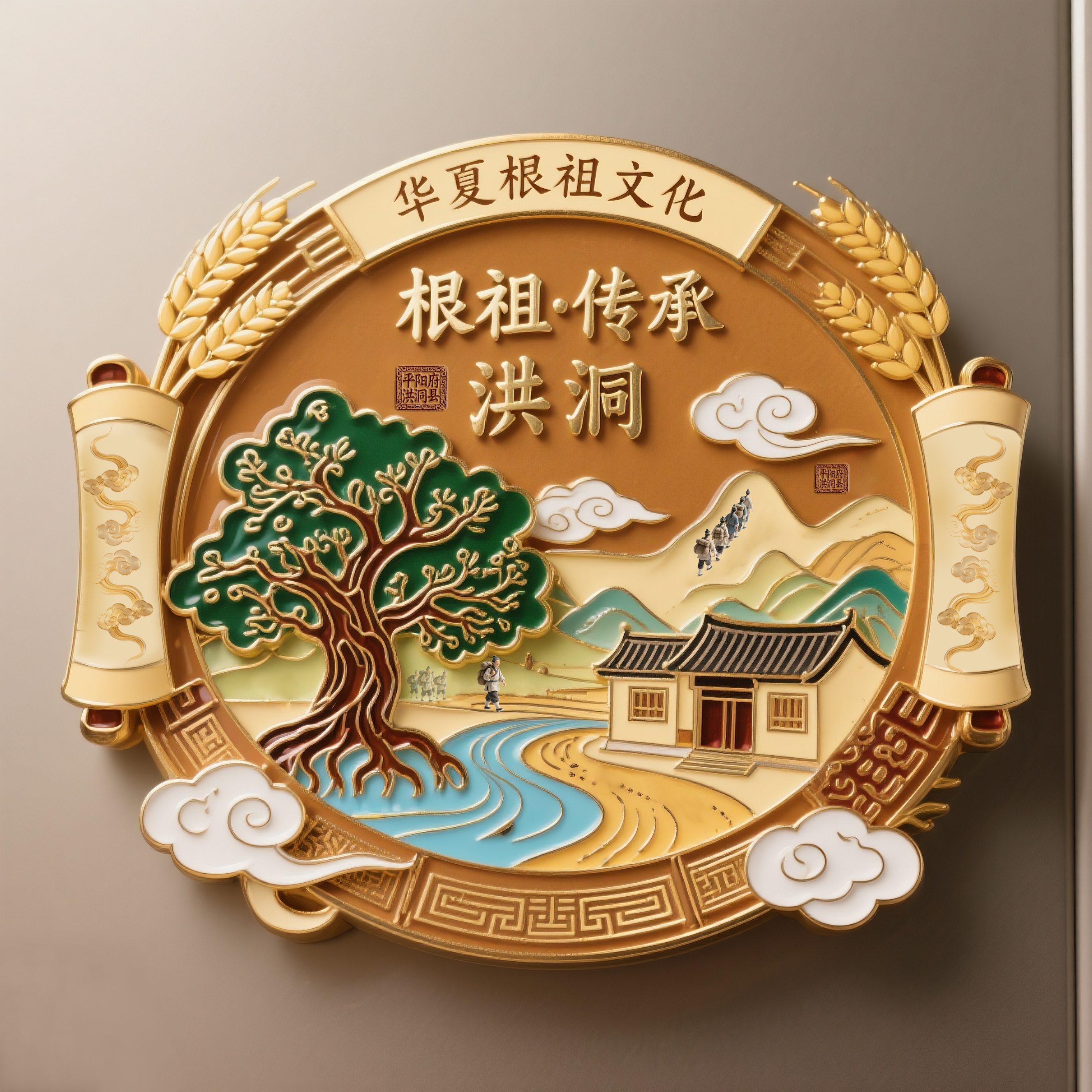 冰箱贴的内容:色彩典雅的珐琅彩琉璃艺术风格,意象化呈现。画面核心展现 “根祖·传承” “洪洞”字样。描绘 洪洞大槐树 作为 华夏根祖文化象征 的意境,融合 苍劲古槐、象征血脉相连的 大槐树根系纹样、代表移民后裔的 远行足迹/地图脉络、体现文化根源的 黄河水波纹 以及 传统民居院落 或 祭祖场景 等核心元素。整体采用 珐琅彩琉璃图案 的古典韵味。暖金色或大地色系背景 上装饰着 麦穗 (象征农耕根基)、祥云 (寓意福泽绵长)、卷轴/族谱纹样 (代表家族传承)等。庄重正面视角 展示。