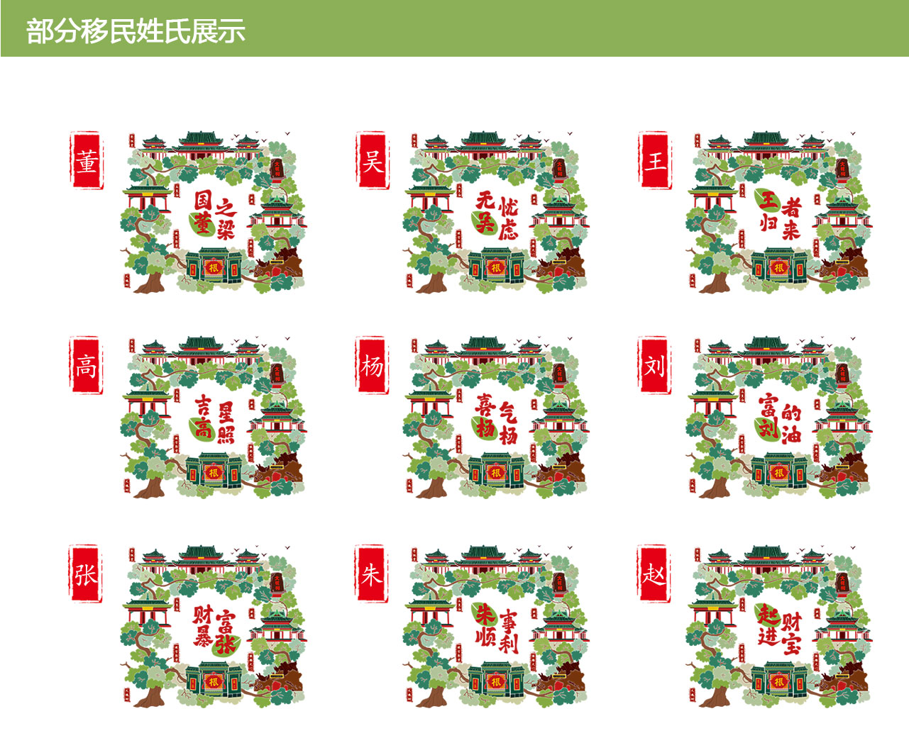此设计把大槐树景点玉皇庙、献殿景、祭祖堂、根字影壁、根雕大门用大槐树的根系来串联起来,包裹着中间部分的姓氏,体现了亿万华人共同的“家”。同时,“姓”氏谐音成语,也体现了山西大槐树对华夏儿女的美好祝福。