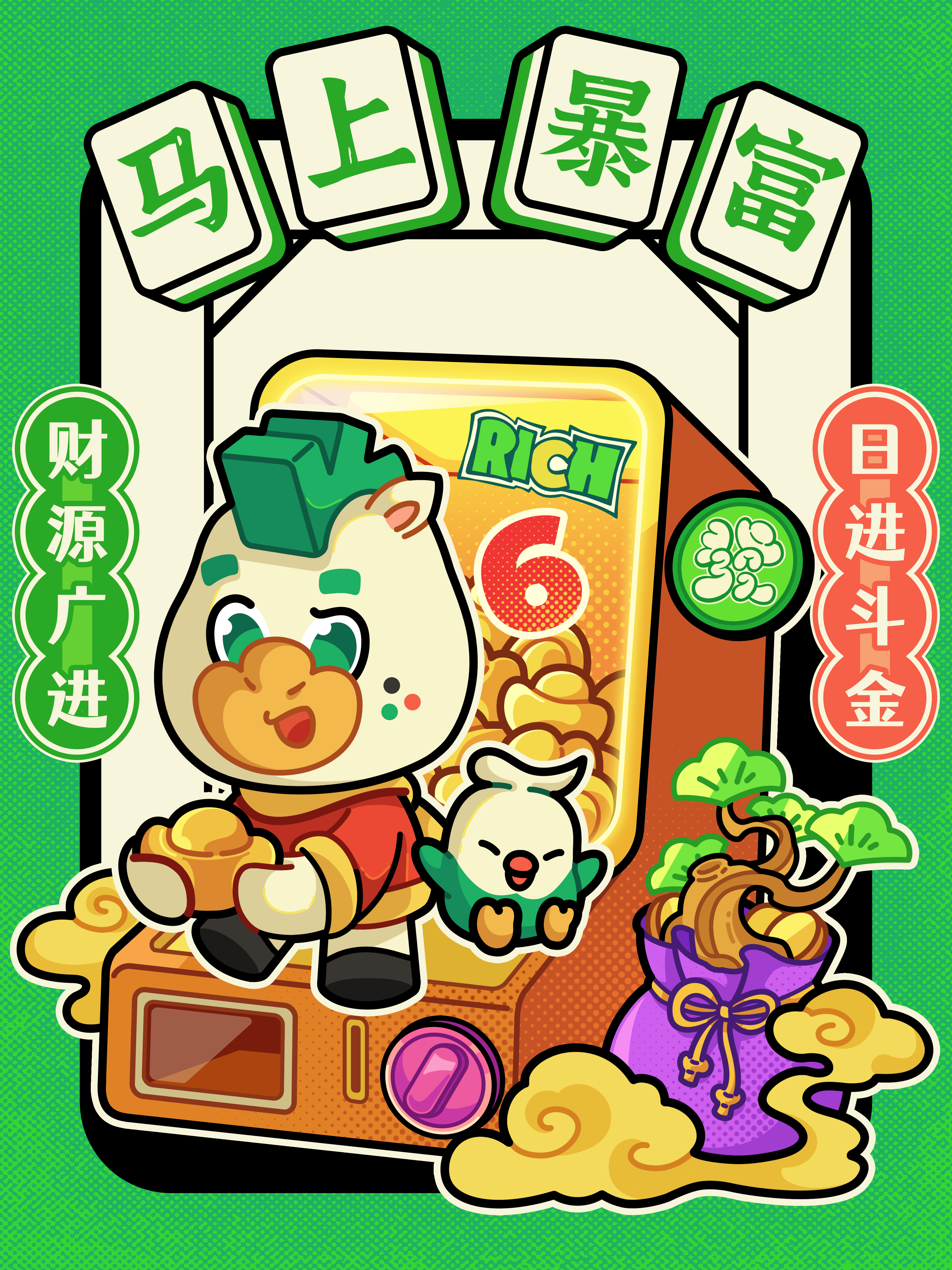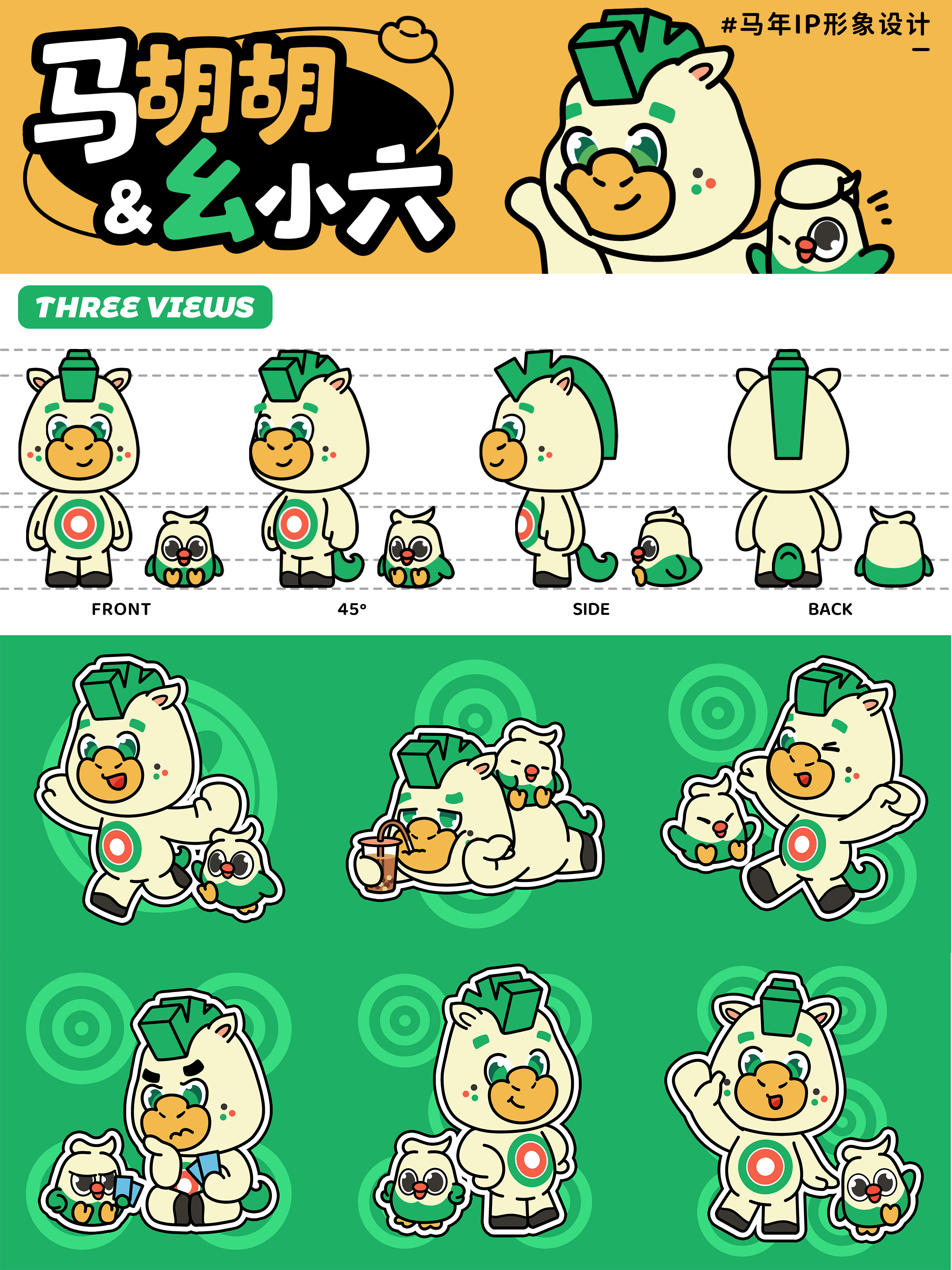 马年IP设计,结合生肖马和麻将元素,创作出了独具特色的马年IP形象马胡胡,寓意着马年一切顺利,一胡到底!还有他的伙伴,由麻将里幺鸡元素延展出的形象幺小六,他们是最佳拍档!