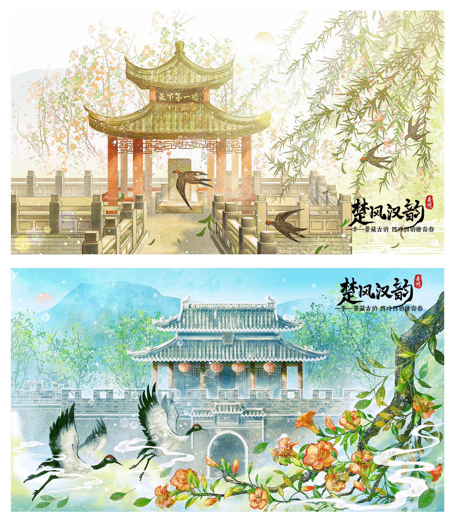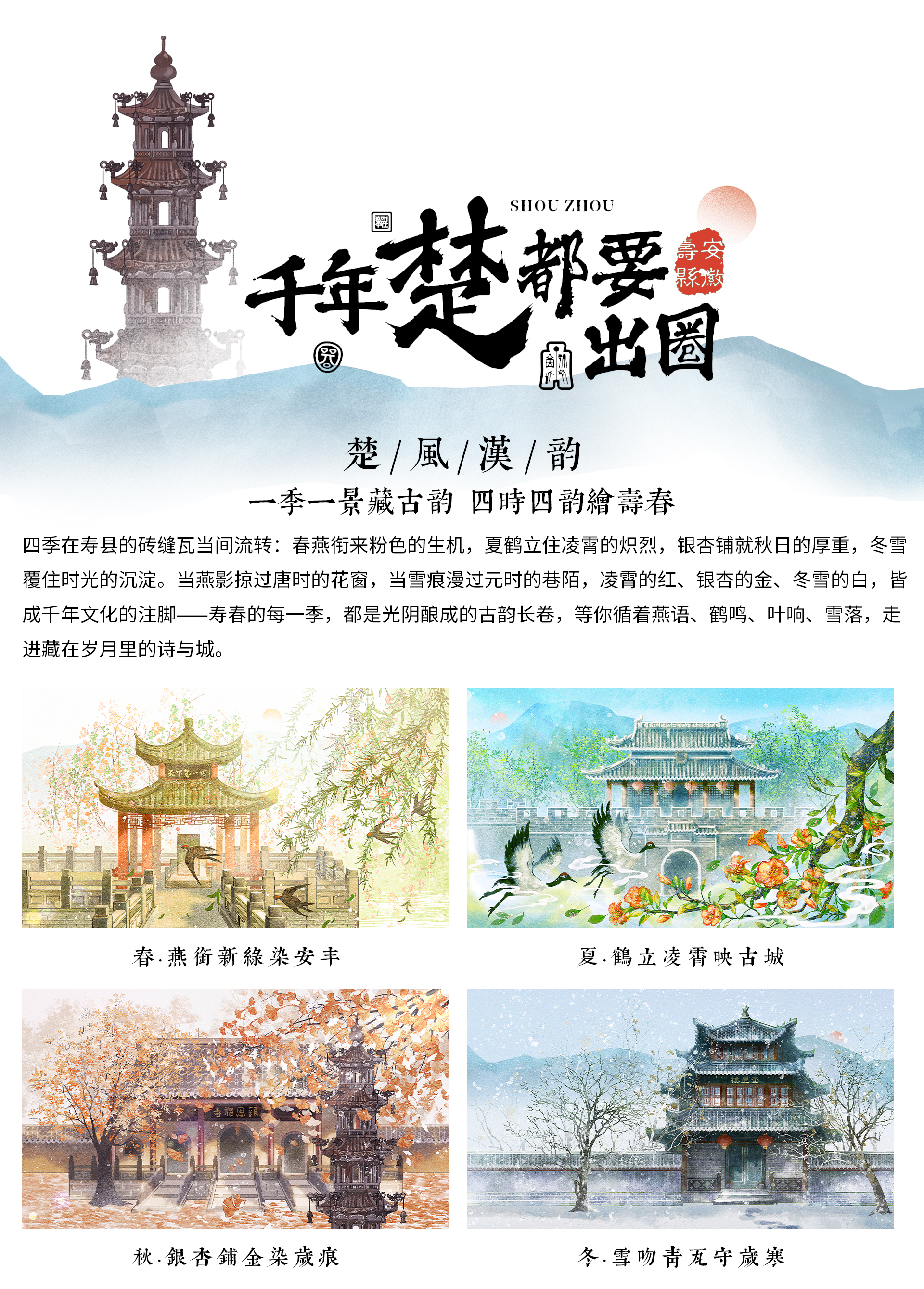 四时四韵绘寿春四季在寿县的砖缝瓦当间流转:春燕衔来粉色的生机,夏鹤立住凌霄的炽烈,银杏铺就秋日的厚重,冬雪覆住时光的沉淀。当燕影掠过唐时的花窗,当雪痕漫过元时的巷陌,凌霄的红、银杏的金、冬雪的白,皆成千年文化的注脚——寿春的每一季,都是光阴酿成的古韵长卷,等你循着燕语、鹤鸣、叶响、雪落,走进藏在岁月里的诗与城。