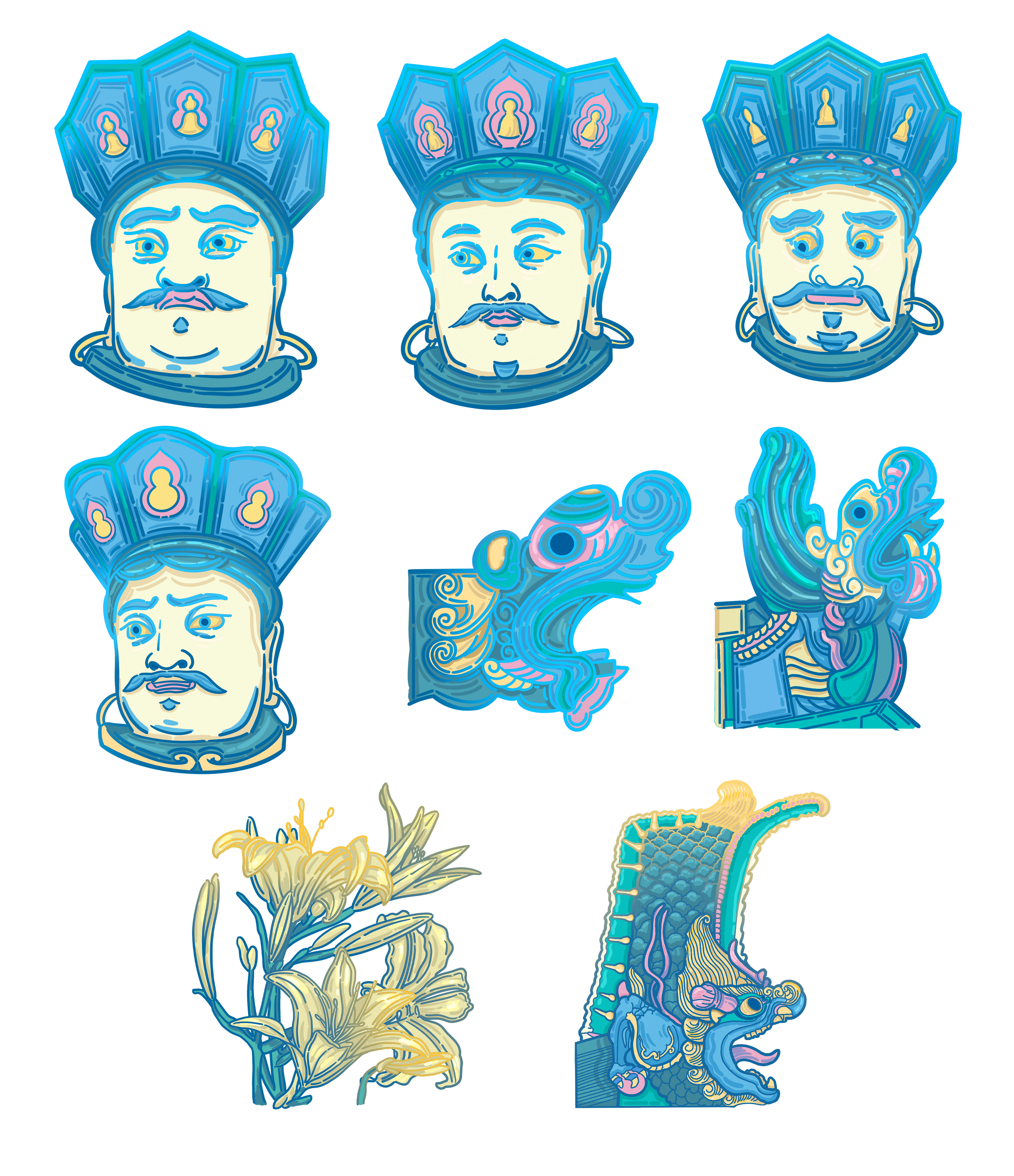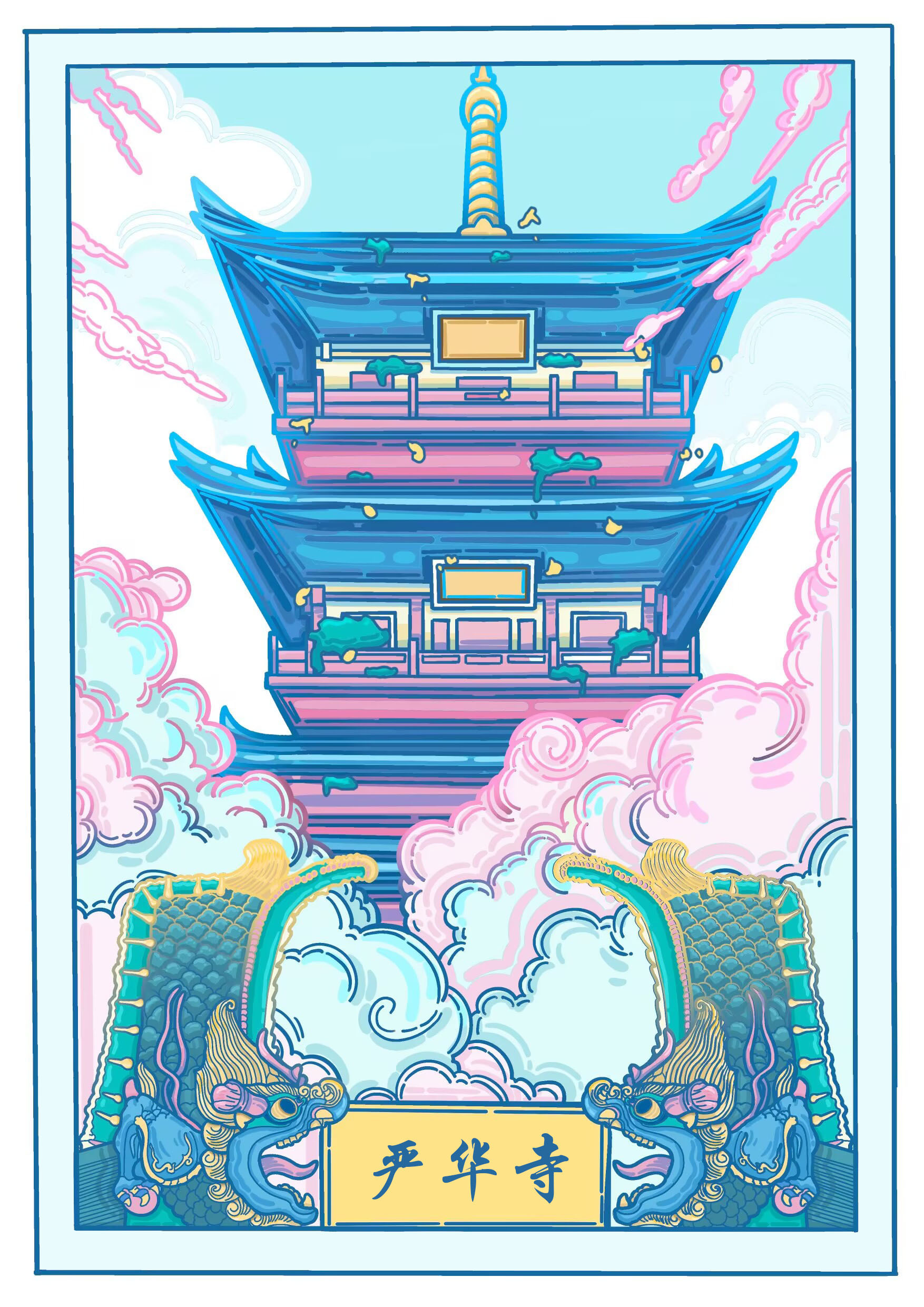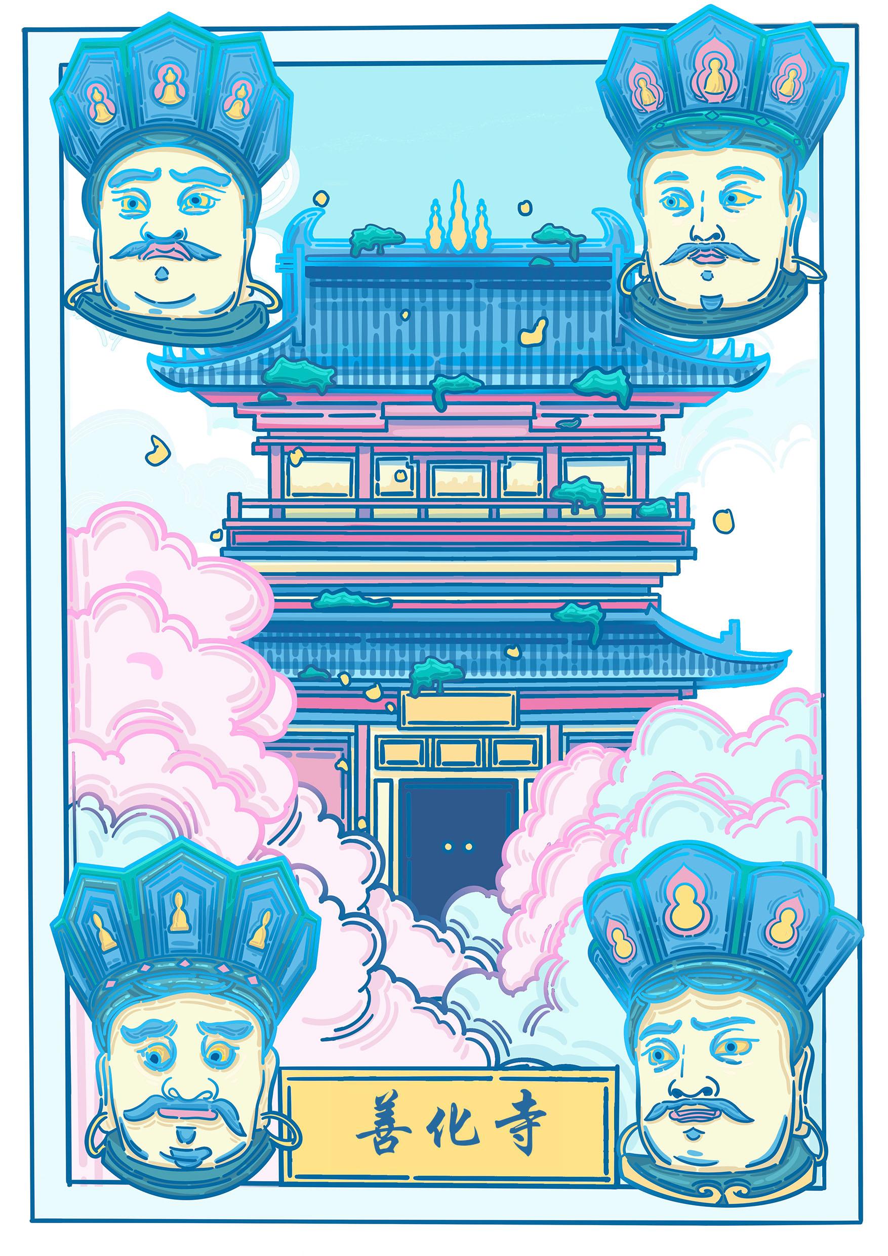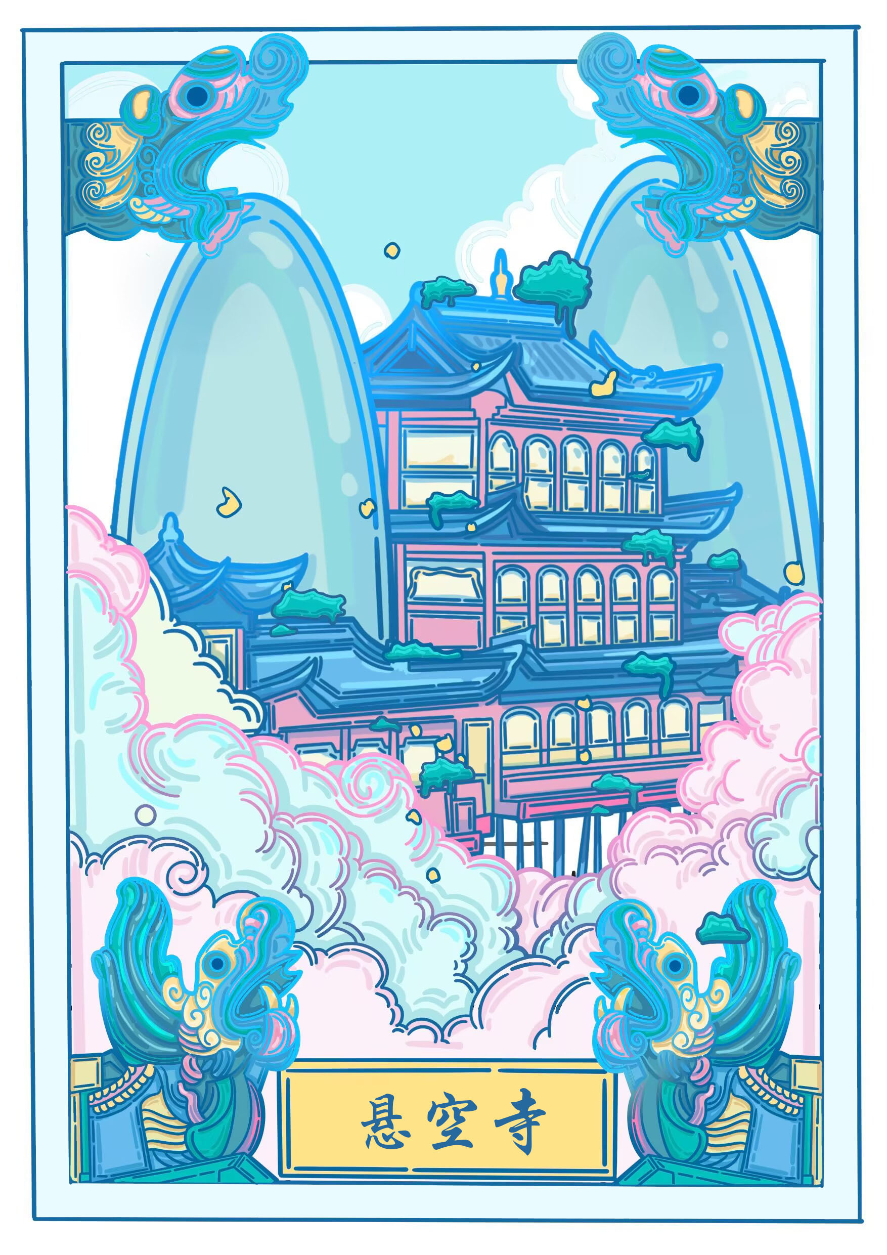 此系列插画以大同中标志性的四个古建筑为主,加以佛像,鸥吻,黄花等元素为辅,运用扁平风格,将古建筑从严肃庄重的氛围变得风趣灵动。色彩以蓝粉为主,明亮的色彩与古建筑本身形成反差,使建筑经历千年依旧看着蓬勃朝气,并符合主题,赋予大同古建筑一个春天。