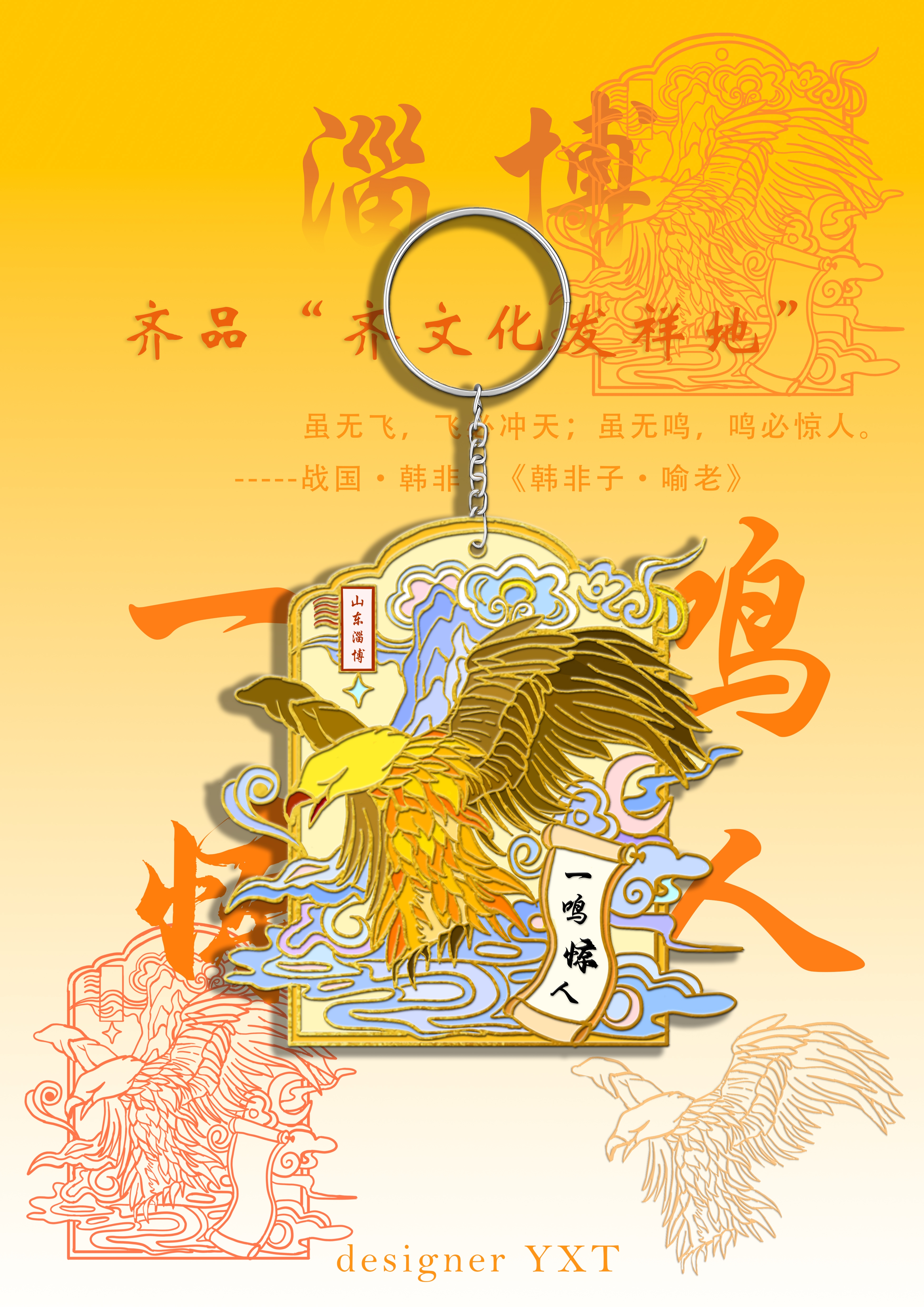 设计灵感溯源:淄博作为齐文化的发源地,承载着厚重的历史底蕴。“一鸣惊人”的故事彰显了齐文化的智慧与豪情,成为本次设计的核心灵感源泉。旨在通过钥匙扣这一日常小物,让齐文化走进大众生活,焕发新的活力。 元素解析:钥匙扣的中心形象是一只展翅的大鸟,它是“一鸣惊人”典故的直观呈现。这只大鸟以齐文化中常见的神鸟形象为蓝本,融合了凤凰与鹰隼的特征。鸟的形态呈振翅高飞之势,寓意着齐威王如这只神鸟般一飞冲天,发出惊人之声,象征着齐国的崛起与辉煌。环绕在大鸟周围的是飘逸的祥云和闪烁的星月。祥云在中国传统文化里代表着吉祥如意,在齐文化中也常作为祥瑞的象征出现。 材料说明:采用珐琅彩工艺上色,色彩鲜艳且持久。通过黄蓝颜色的珐琅彩巧妙搭配,使各个元素层次分明,栩栩如生。扣环部分采用不锈钢材质。 设计价值:这款钥匙扣将齐文化中“一鸣惊人”的精神内涵与现代设计相结合,具有独特的艺术价值和文化意义。作为旅游纪念品,它能让游客感受历史与现代交融的奇妙,助力淄博齐文化在新时代的传承与传播。