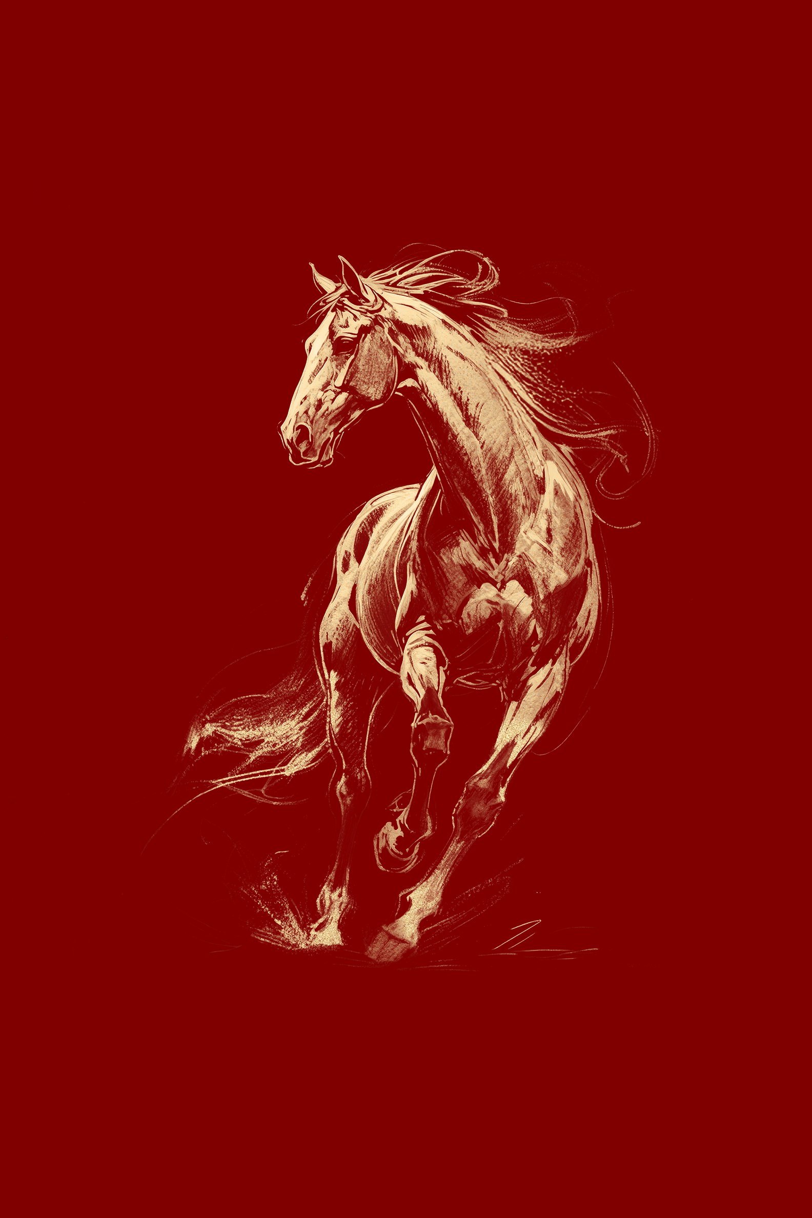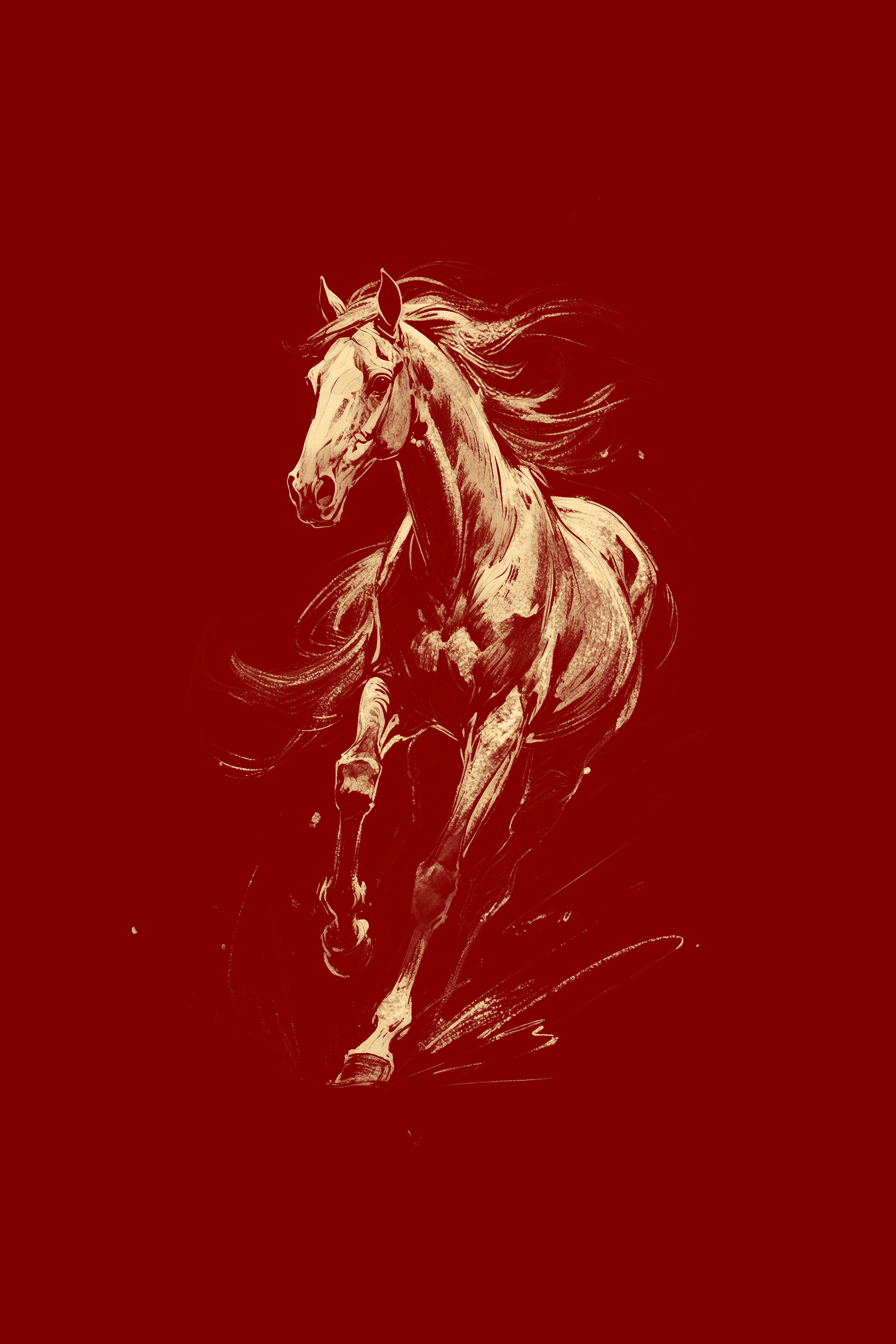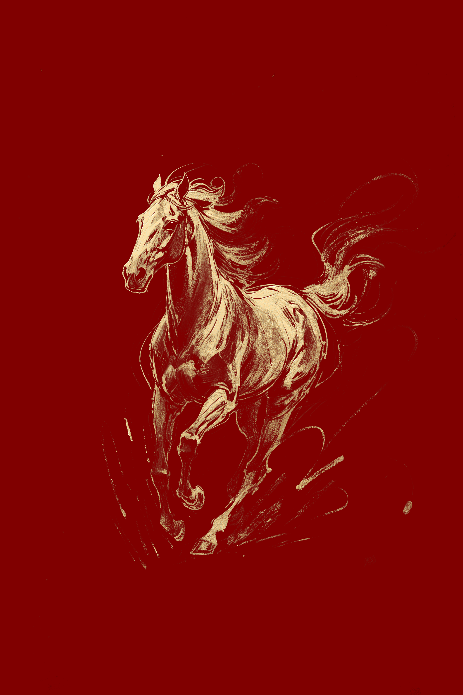 不羁的气质掀开了红底的幕布, 金马从光里飞出。 飞扬鬃毛如流云飘拂, 蹄下带起碎金的雾。 它昂首,肌肉如凝固的风, 每一道线条,都是力量的颂扬, 在红与金的交融处, 踏响不羁的征途 , 奏响大国的神韵。