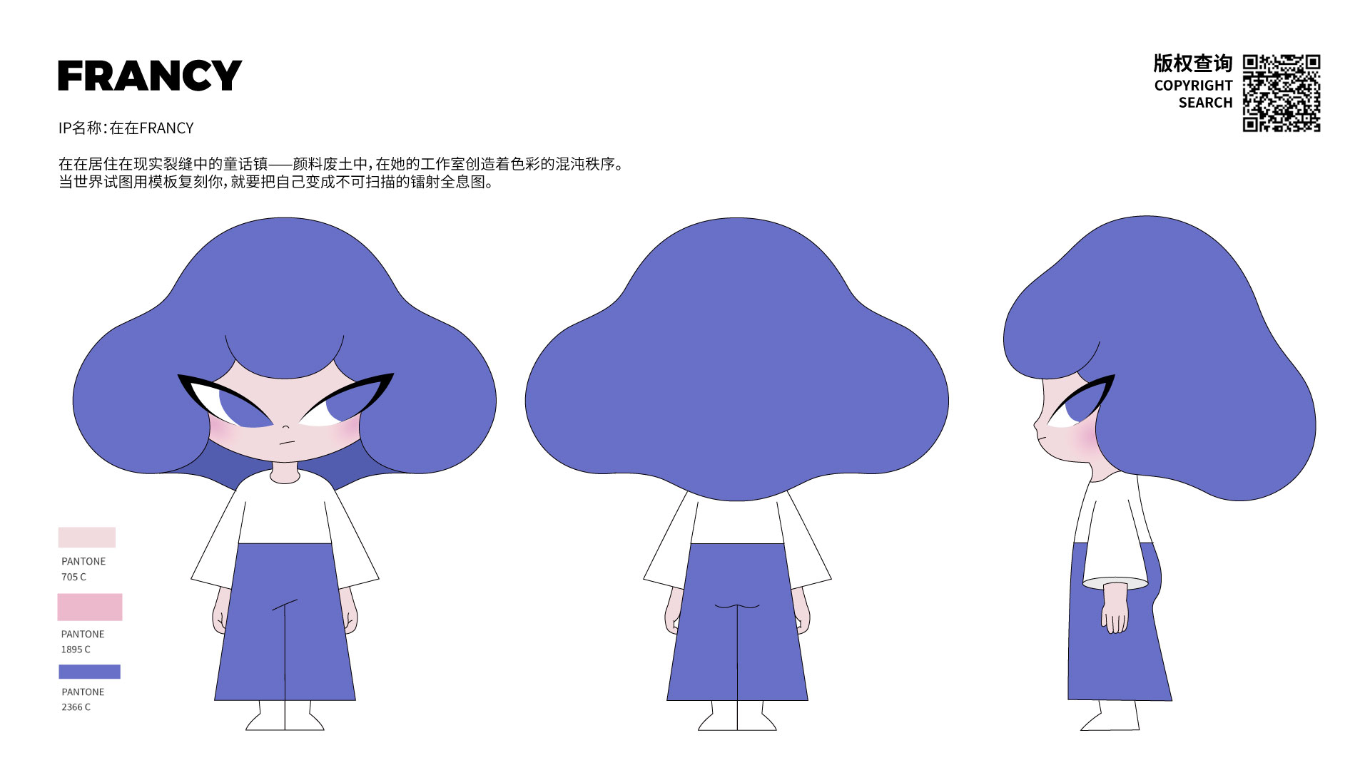 在在居住在现实裂缝中的童话镇——颜料废土中,在她的工作室创造着色彩的混沌秩序。 当世界试图用模板复刻你,就要把自己变成不可扫描的镭射全息图。