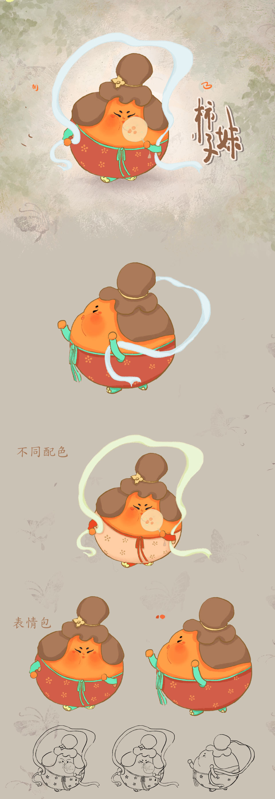 以唐代仕女图的雍容气韵为骨,以柿子的饱满形态为魂,打造兼具古典美与自然意趣的“柿女”IP形象。 形象设计上,将仕女的丰腴体态与柿子的圆润轮廓相融合,头部以带蒂柿子为原型,蒂部化作仕女的云鬓发簪; 气质塑造上,延续唐仕女的端庄华贵,眉眼间保留温婉浅笑,同时融入柿子的清甜灵动感,手持缀有柿子果实的团扇,既体现唐代生活美学,又强化IP的自然属性,让古典仕女形象与柿子的文化符号深度绑定,传递出典雅、吉祥、治愈的核心气质。