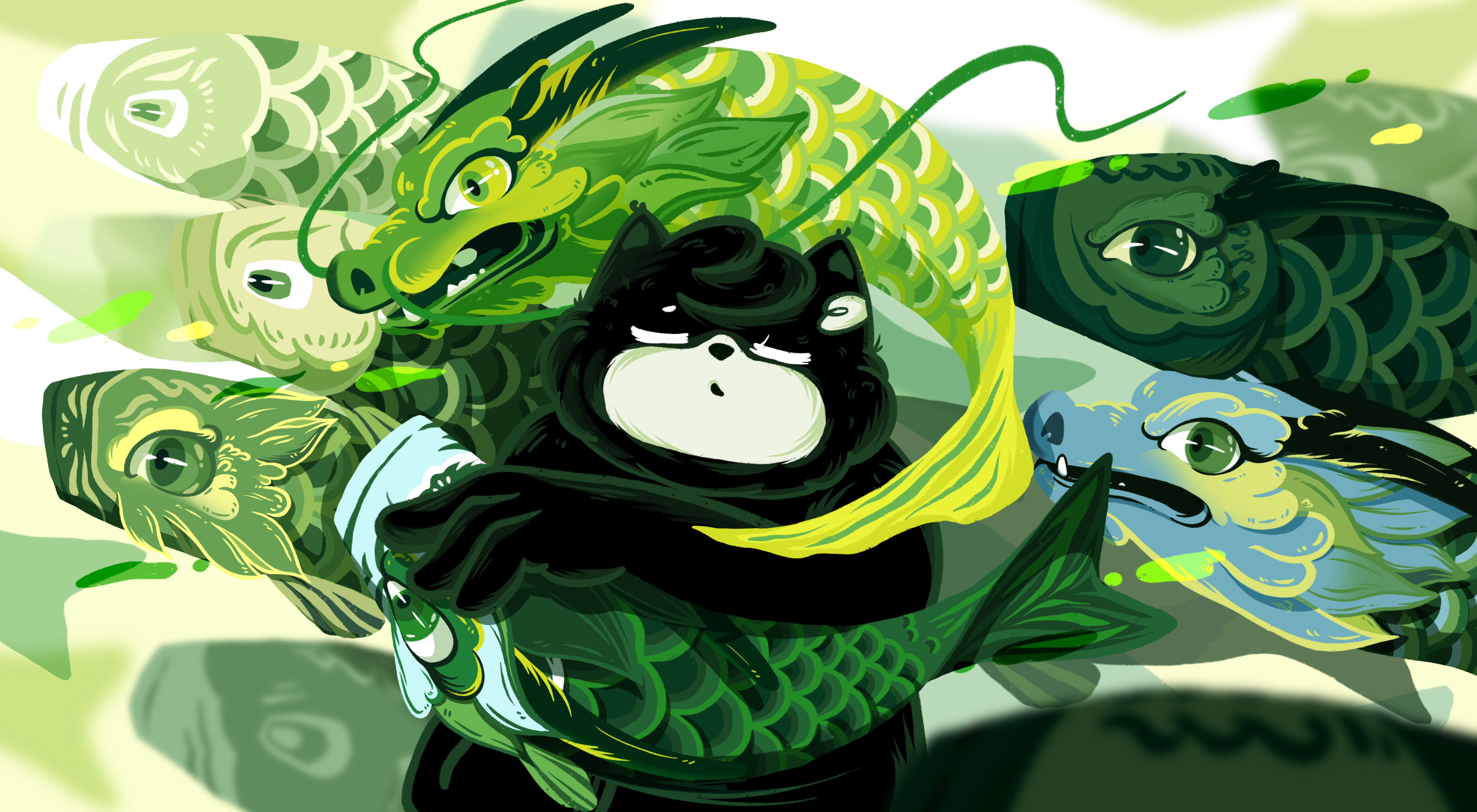 以ip形象为主体,空中有游动的鱼环绕其间。 鱼的造型借鉴中国鱼龙,画面上是鲤鱼蜕变化龙的过程,有鱼跃龙门的美好寓意。