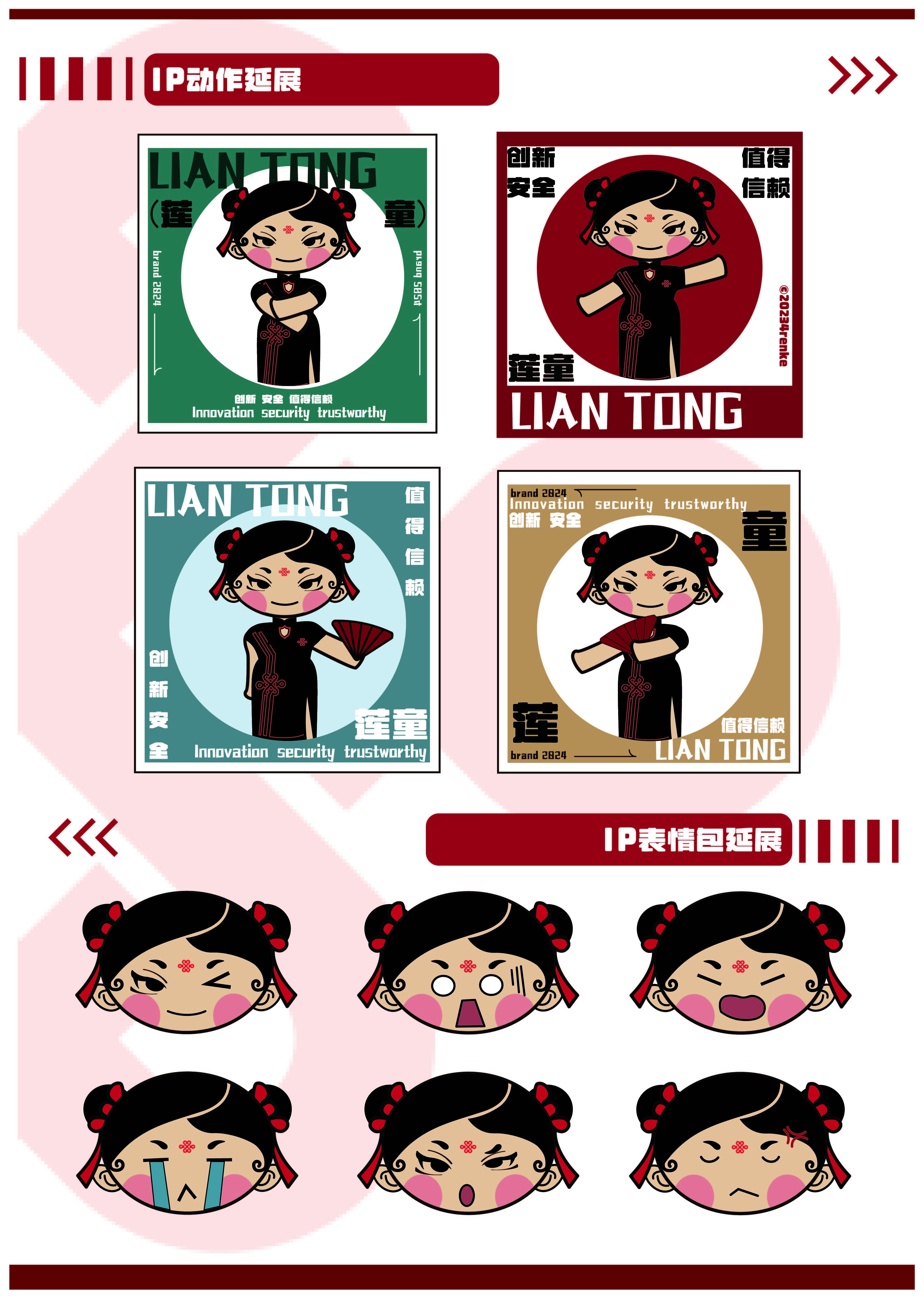 中国联通作为中国通信行业的领军企业,一直致力于传承和弘扬中国传统文化。本次设计的IP形象“中国结”旨在将中国传统文化元素与现代审美相结合,创造一个具有辨识度和亲和力的品牌形象。通过女性人物穿旗袍、扎双丸子头的形象,展现中国古典美与现代活力的完美融合。设计中的女性形象身着经典的中国旗袍,旗袍采用中国红为主色调,辅以金色或黑色的线条装饰,既体现了中国的传统色彩,又不失现代感。旗袍的剪裁合体,展现出女性的曲线美,同时旗袍上的图案可以融入中国结的元素,如盘扣、衣襟等部位巧妙地运用中国结的设计,增强文化内涵。色彩上,以中国红为主色调,象征着喜庆、热情和活力。金色作为辅助色,代表财富和尊贵,黑色则用于线条勾勒,增加整体的稳重感。色彩搭配和谐统一,既符合中国传统美学,又能吸引现代消费者的目光。该IP形象可广泛应用于中国联通的品牌宣传、广告推广、产品包装、企业文化展示等多个方面。例如,在宣传海报、视频广告中,可以通过动态展示女性形象的优雅姿态和中国结的灵动飘逸,传递出中国联通的品牌精神和文化底蕴。
