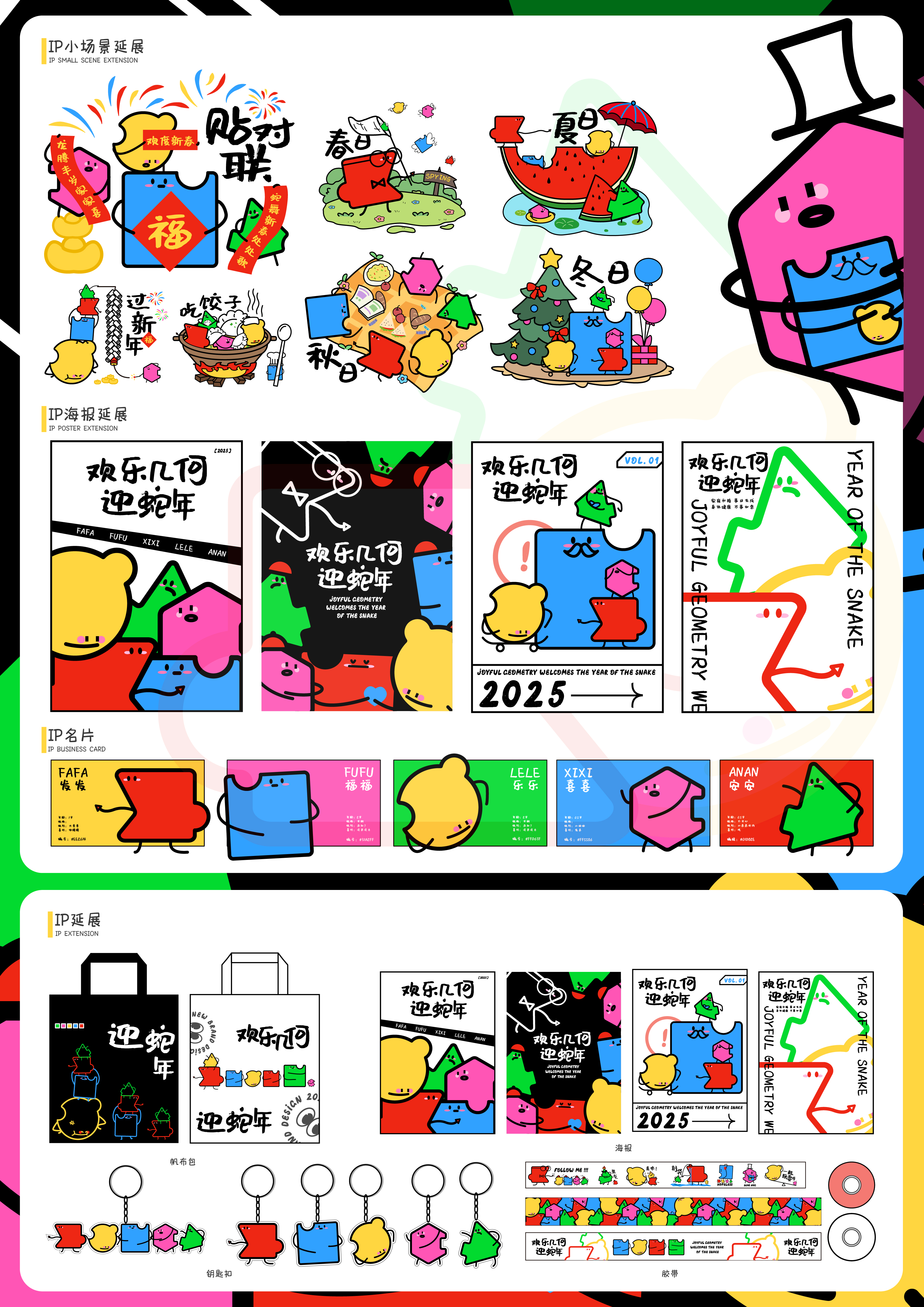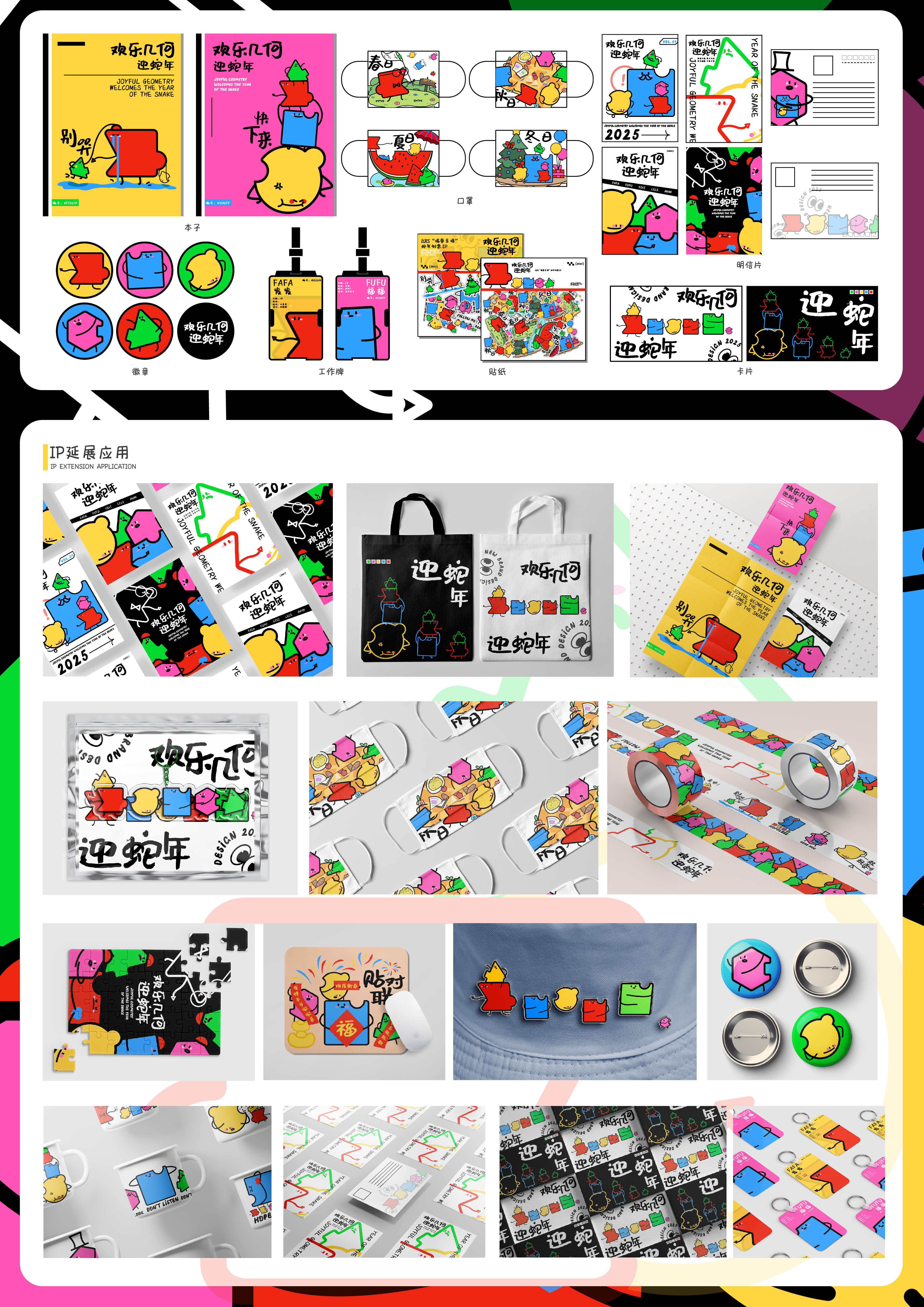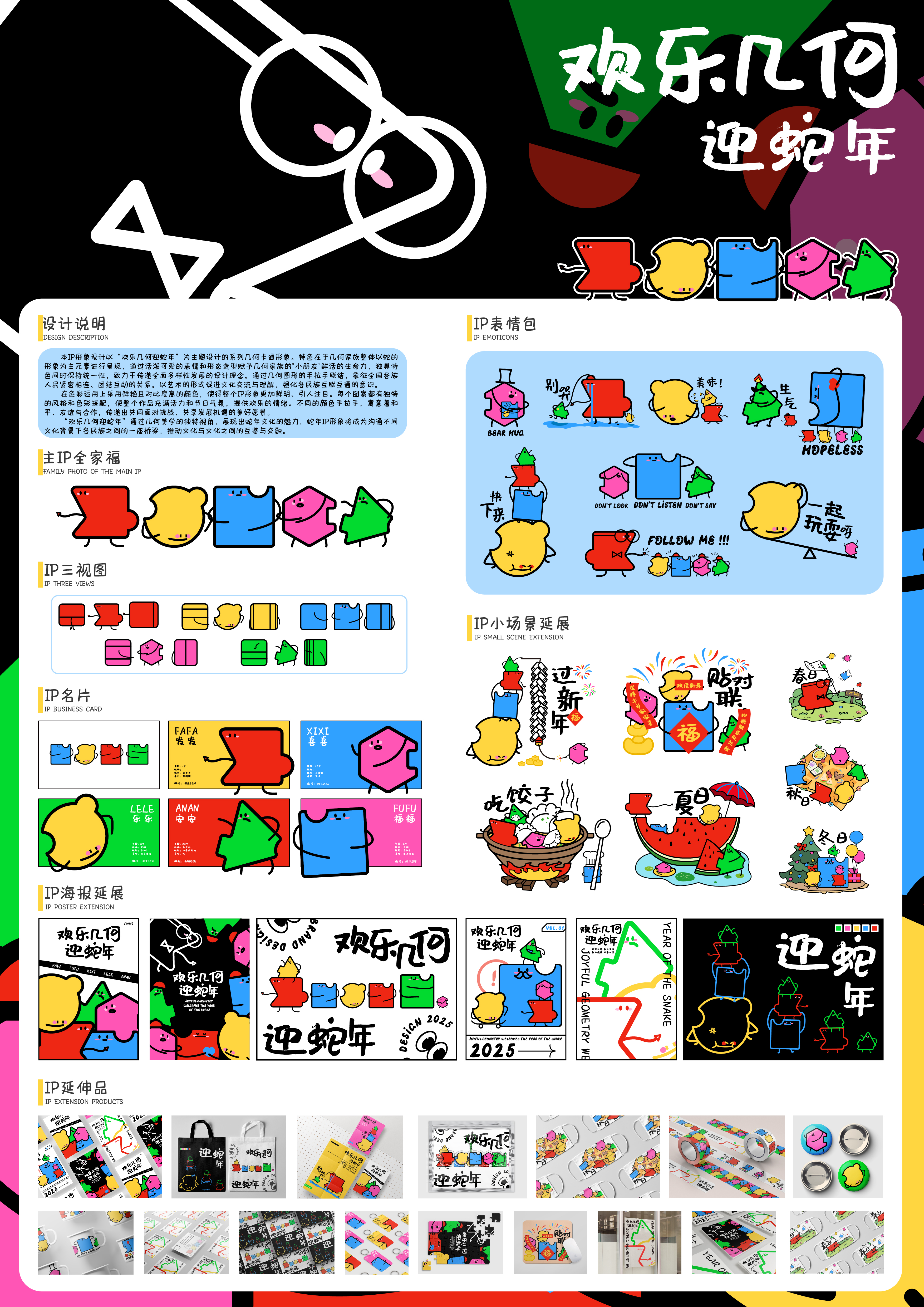IP形象设计以“欢乐几何迎蛇年”为主题设计的系列几何卡通形象。特色在于几何家族整体以蛇的形象为主元素进行呈现,通过活泼可爱的表情和形态造型赋予几何家族的"小朋友"鲜活的生命力,独具特色同时保持统一性,致力于传递全面多样性发展的设计理念。通过几何图形的手拉手联结,象征全国各族人民紧密相连、团结互助的关系。以艺术的形式促进文化交流与理解,强化各民族互联互通的意识。 在色彩运用上采用鲜艳且对比度高的颜色,使得整个IP形象更加鲜明、引人注目。每个图案都有独特的风格和色彩搭配,使整个作品充满活力和节日气氛,提供欢乐的情绪。不同的颜色手拉手,寓意着和平、友谊与合作,传递出共同面对挑战、共享发展机遇的美好愿景。 “欢乐几何迎蛇年”通过几何美学的独特视角,展现出蛇年文化的魅力,蛇年IP形象将成为沟通不同文化背景下各民族之间的一座桥梁,推动文化与文化之间的互鉴与交融。