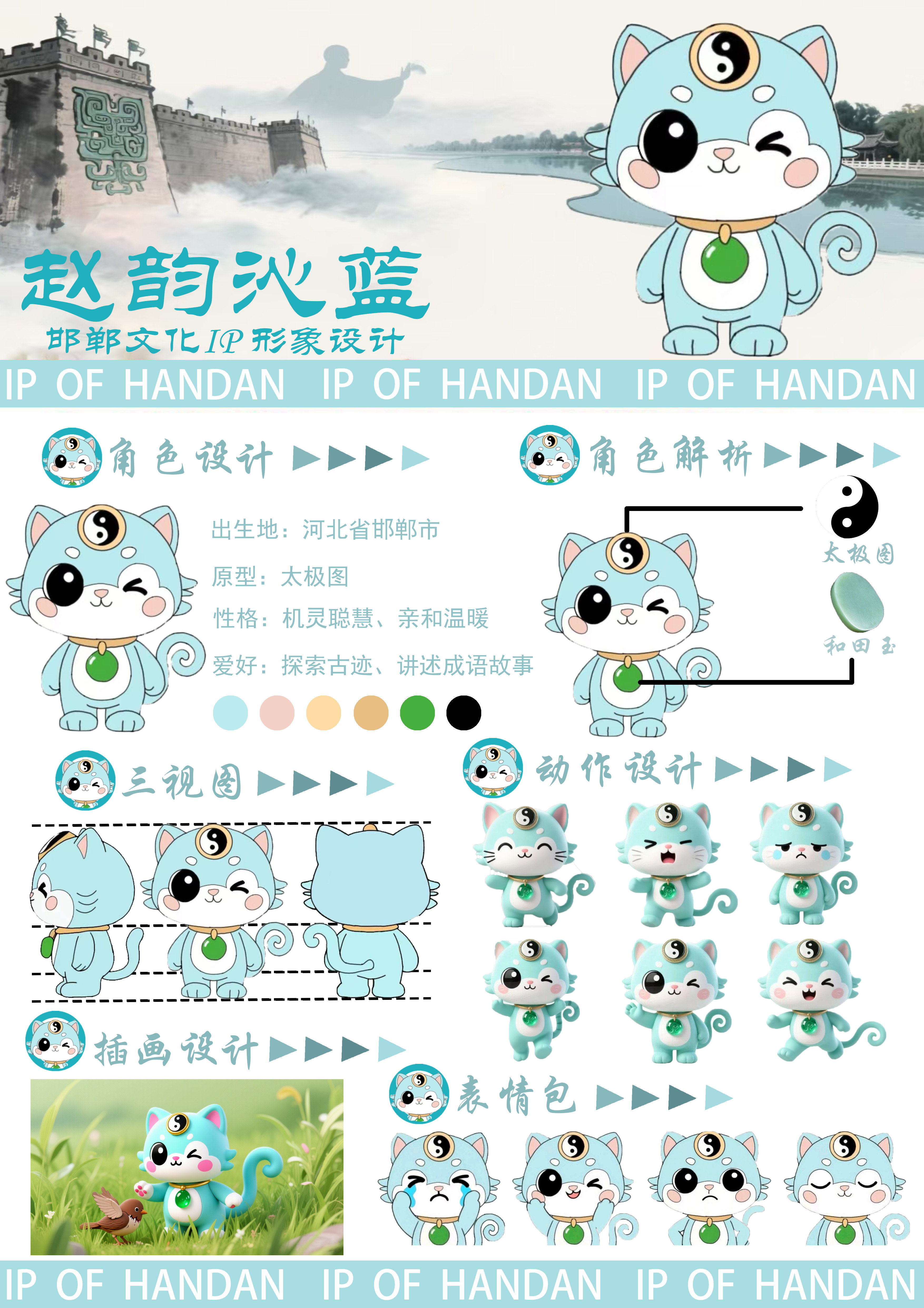 “赵韵沁蓝”是邯郸文化IP形象,原型为太极图,出生地为河北省邯郸市,性格机灵聪慧、亲和温暖,爱好探索古迹、讲述成语故事。设计融入太极图、和氏玉等元素,还有三视图、多样动作、场景插画及表情包等多维度拓展,助力邯郸文化传播。