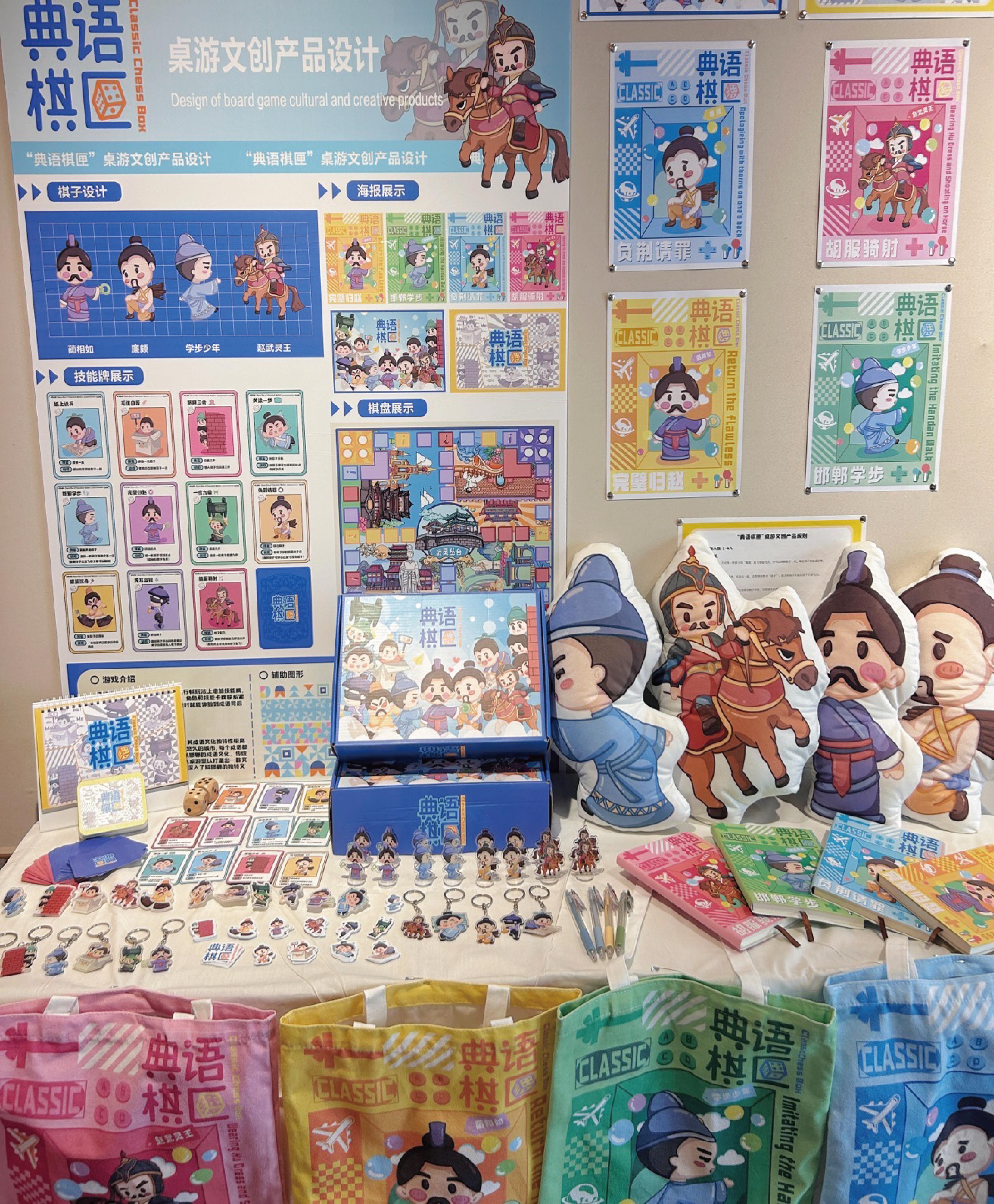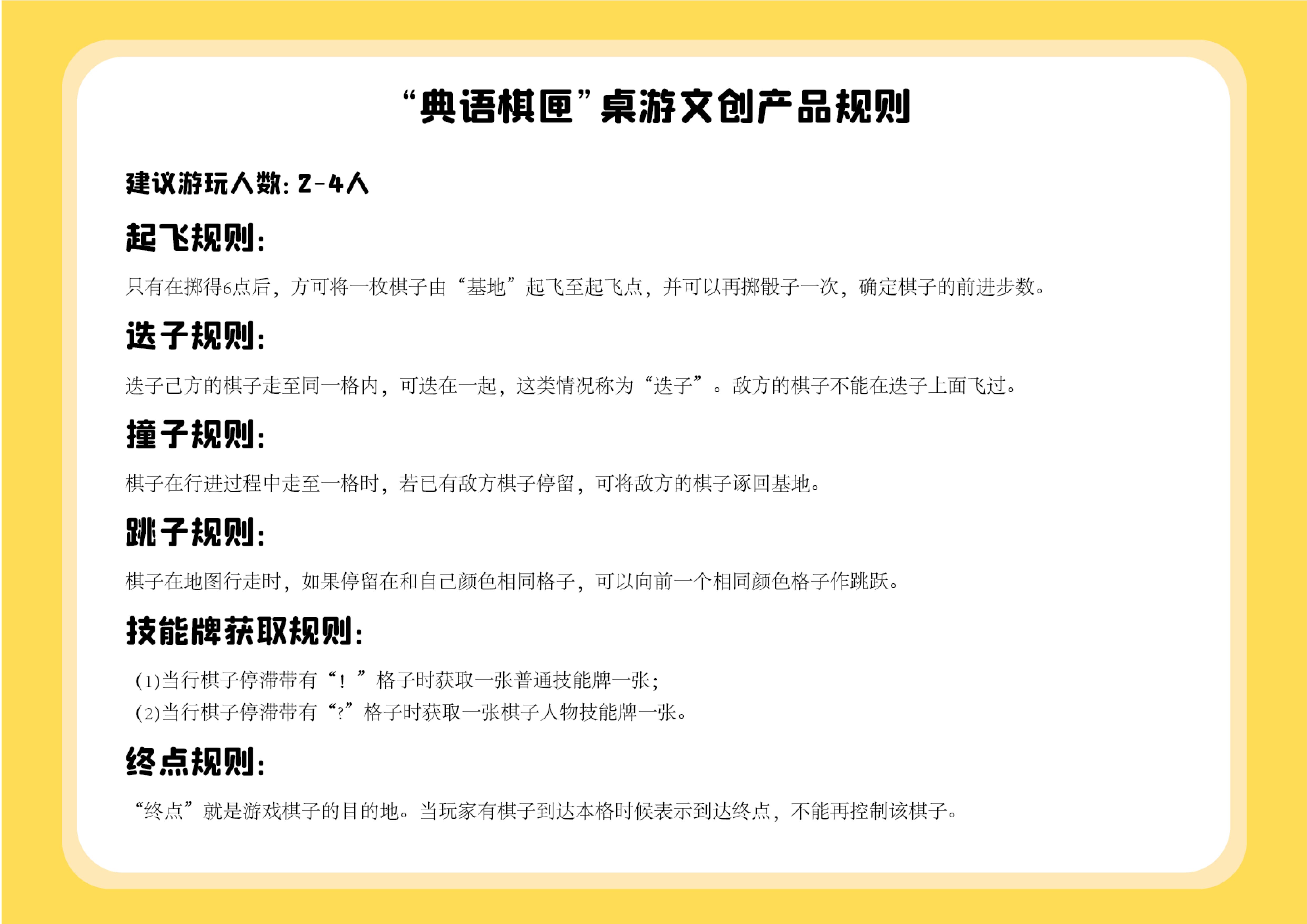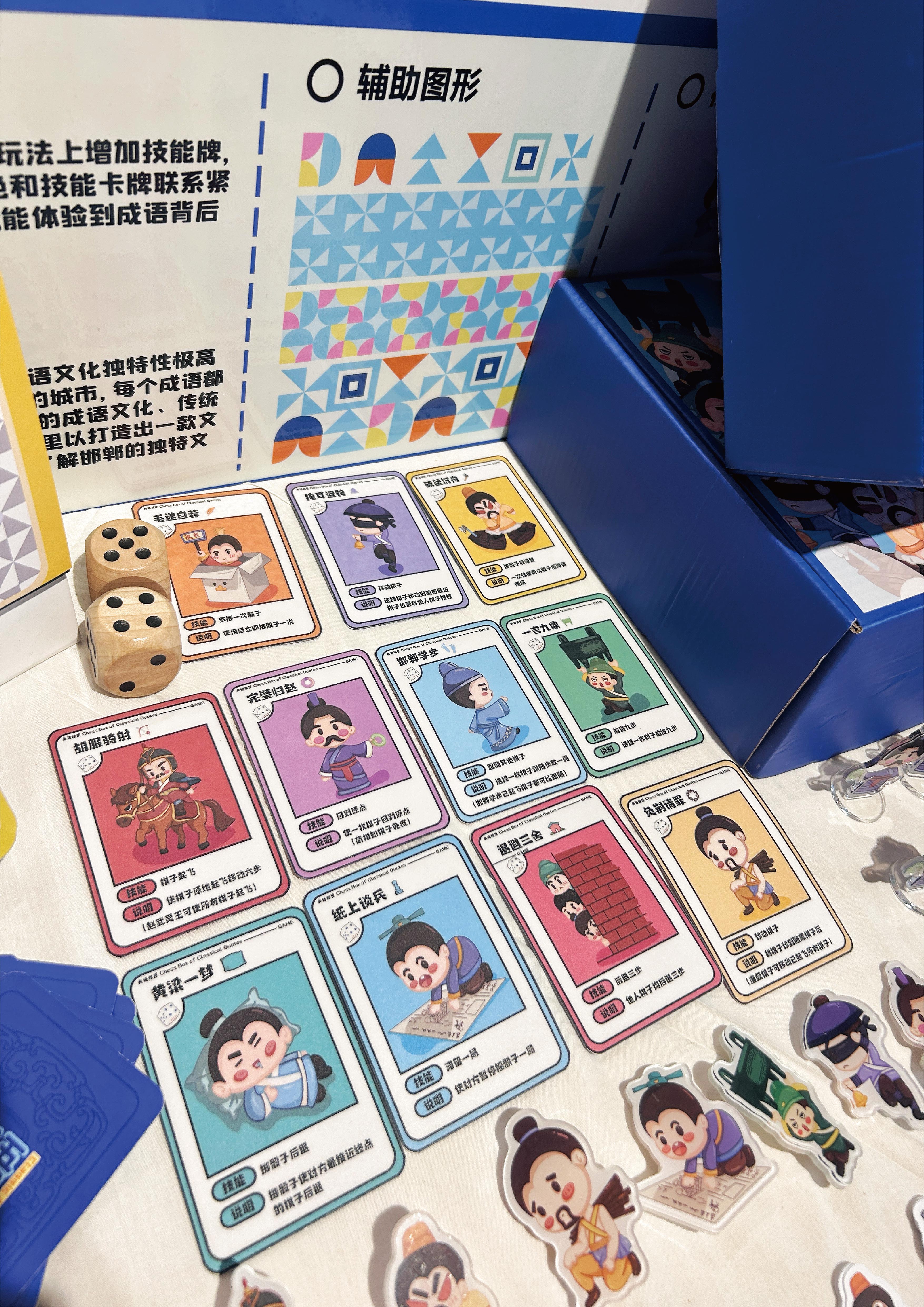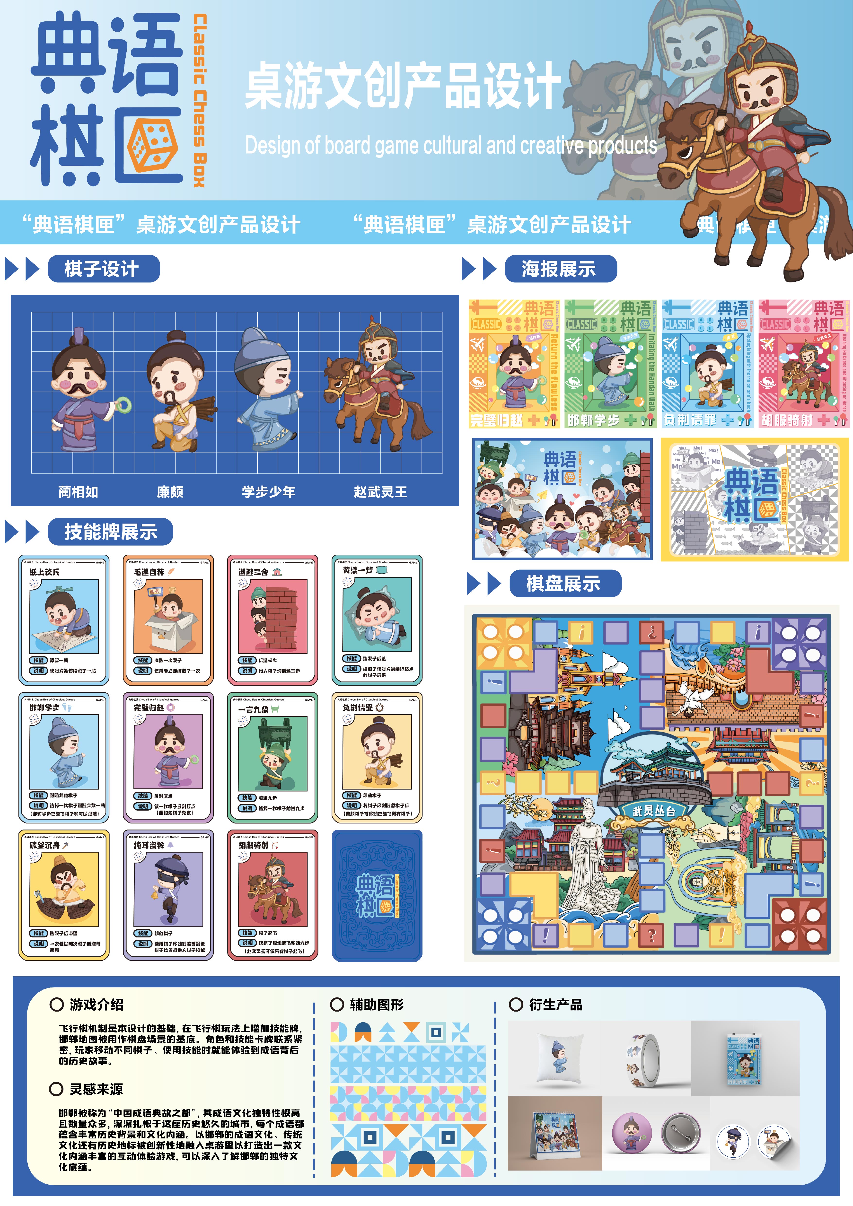 “典语棋匣”是一款创新游戏,主要灵感来源与河北省邯郸市,其中棋盘设计以经典的飞行棋框架为基础,巧妙构建出“一局游遍邯郸”文化体验之旅。棋子选取邯郸最具特色成语故事人物设计而成,卡牌选取邯郸成语进行创意设计,成语内容与棋盘游戏结合创新玩法。整体设计风格卡通可爱简单易懂,游戏内容丰富多彩独具地域特色。