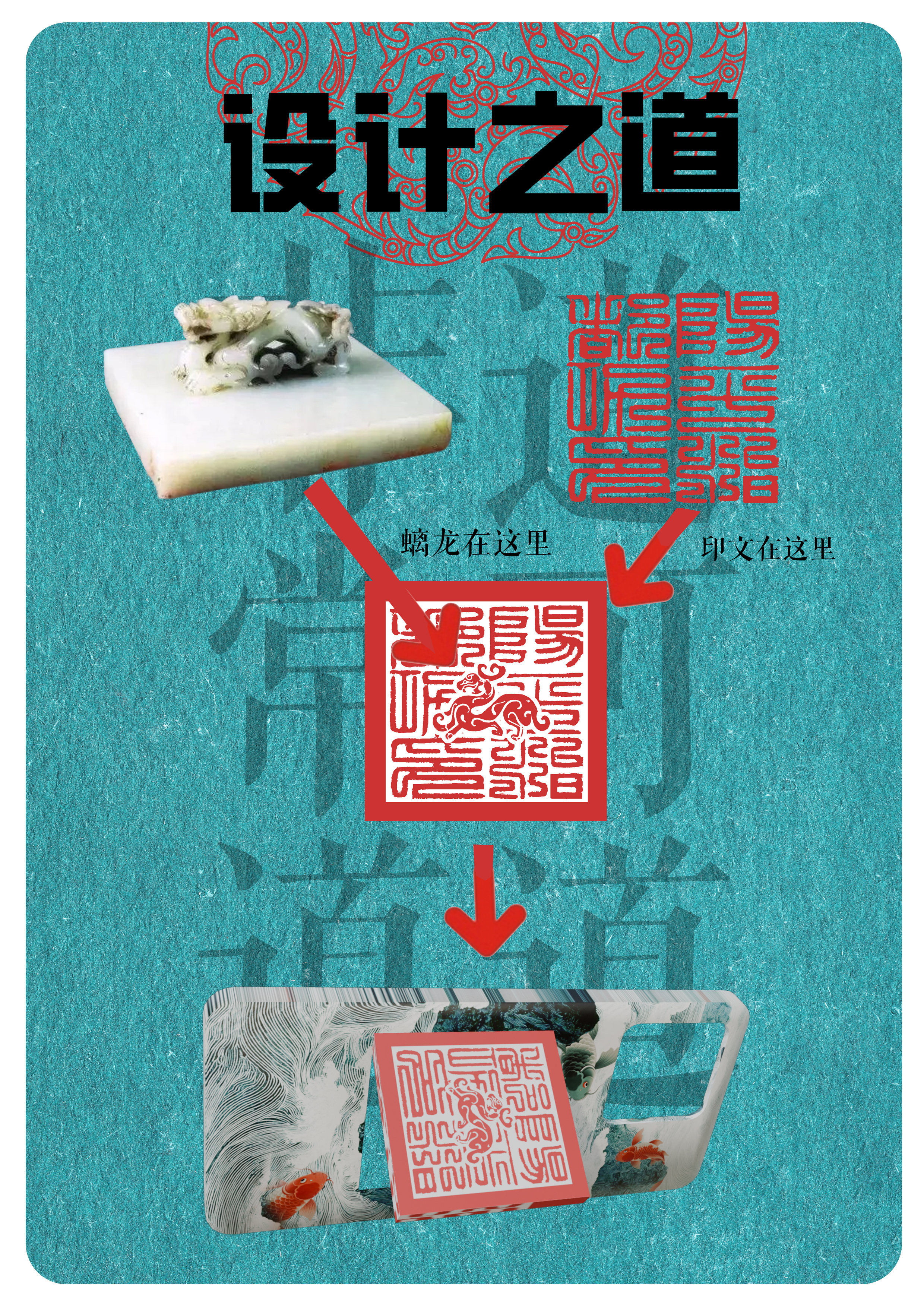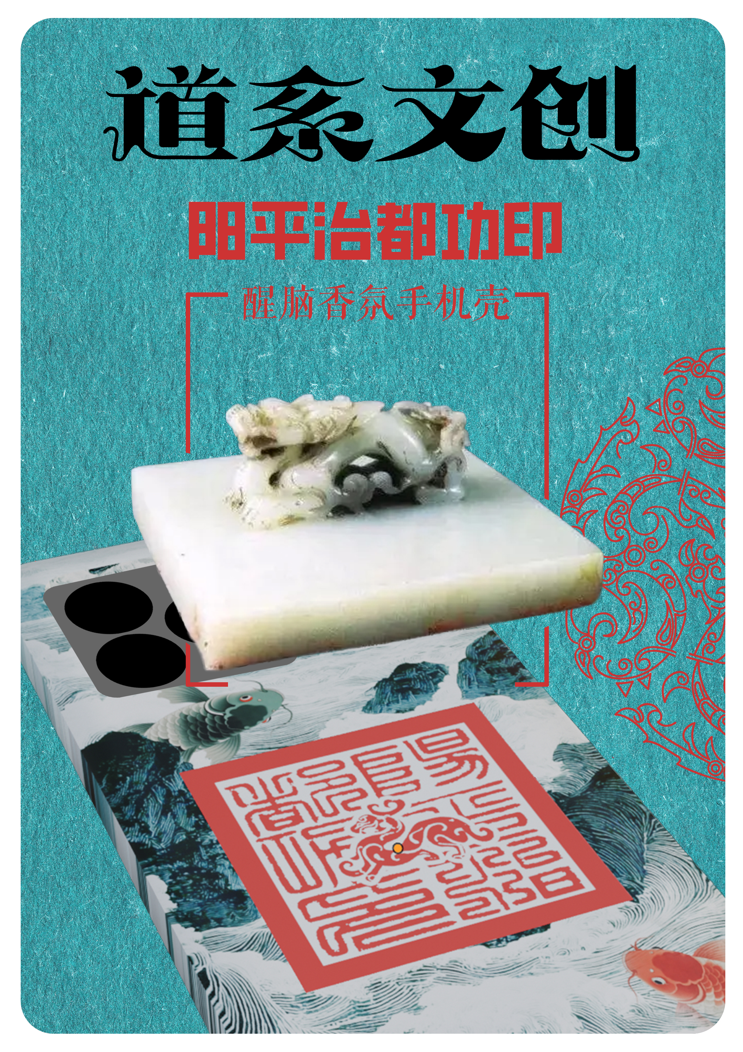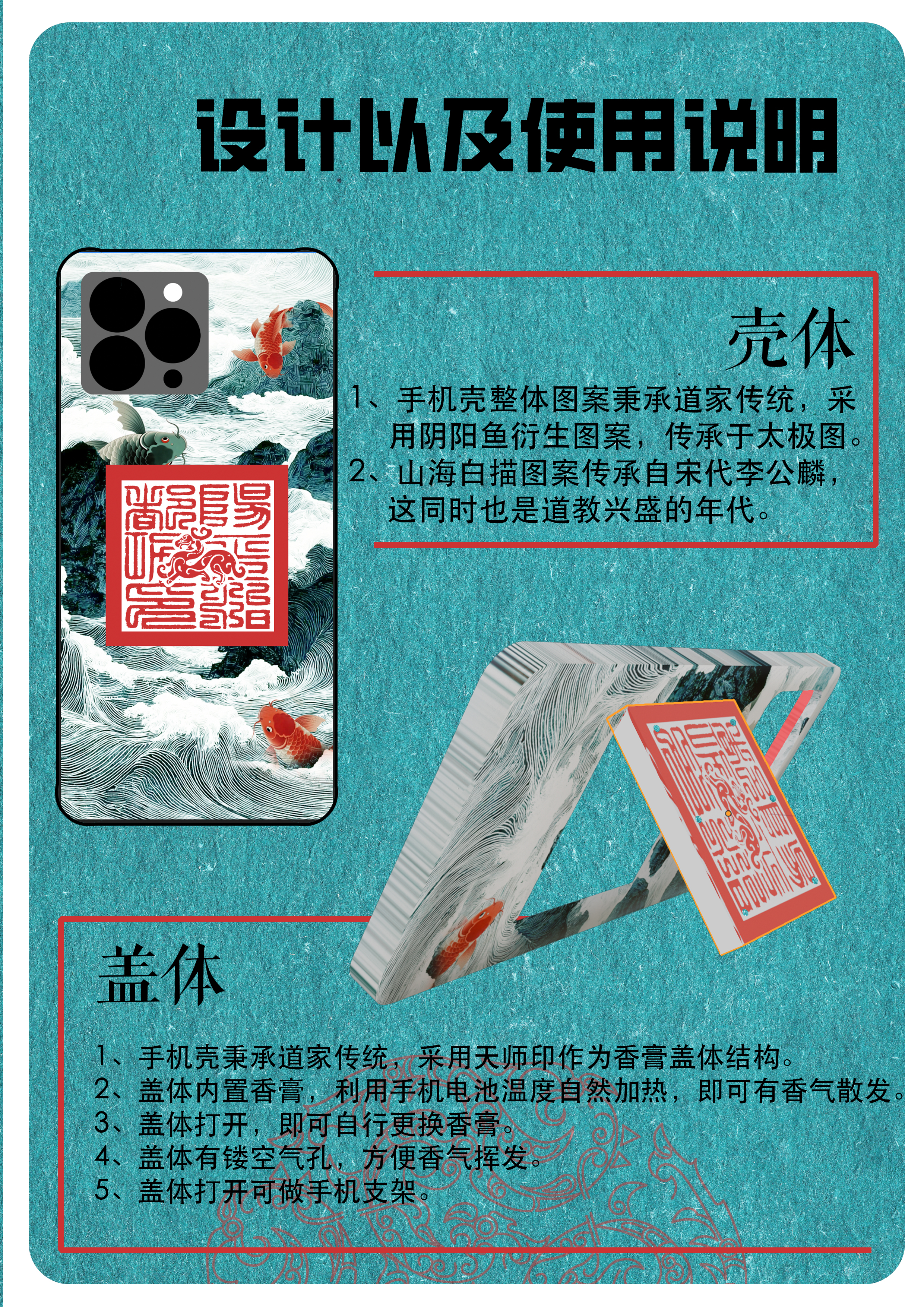 -1- 运用道系元素创作:/阴阳鱼/ /天师印/ /山海经/ -2- 古典文化印章与现代生活相结合,应到手机壳的设计上,以生活细微之处传承东方文化。 -3- 壳体山海图为ai生成,仿照宋朝名家李公麟白描图画而来。 -4- 手机壳内置香膏,行走动静,香氛暗绕;香气可持续一个月,之后膏体可自行更换。 -5- 膏体配方为提神醒脑合香珠古方。