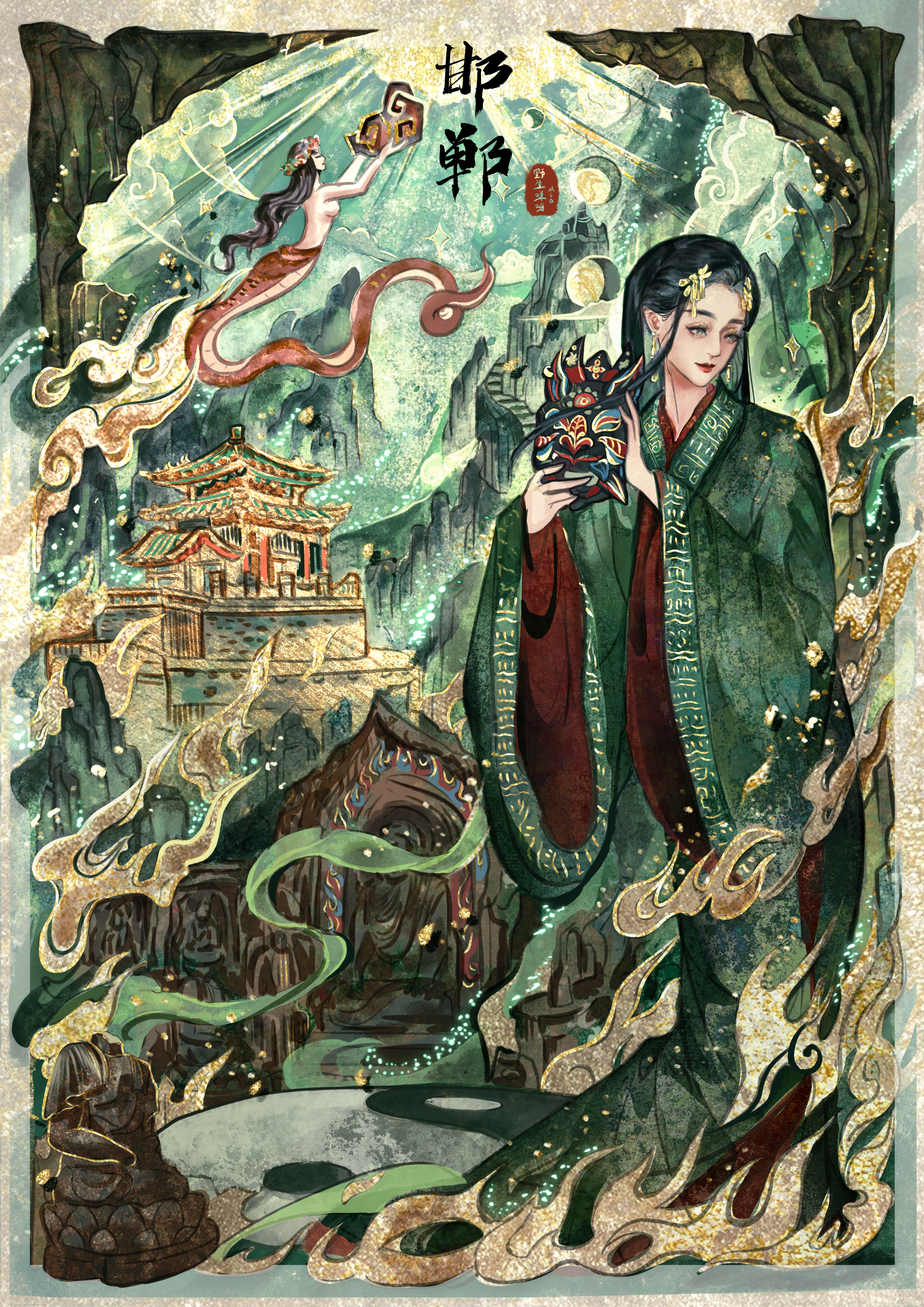 城市插画系列-邯郸,其中包含东太行,丹霞地貌,丛台公园,南响堂山石窟等自然风景,融入太极和传说女娲补天元素,傩文化和战国文化也有体现