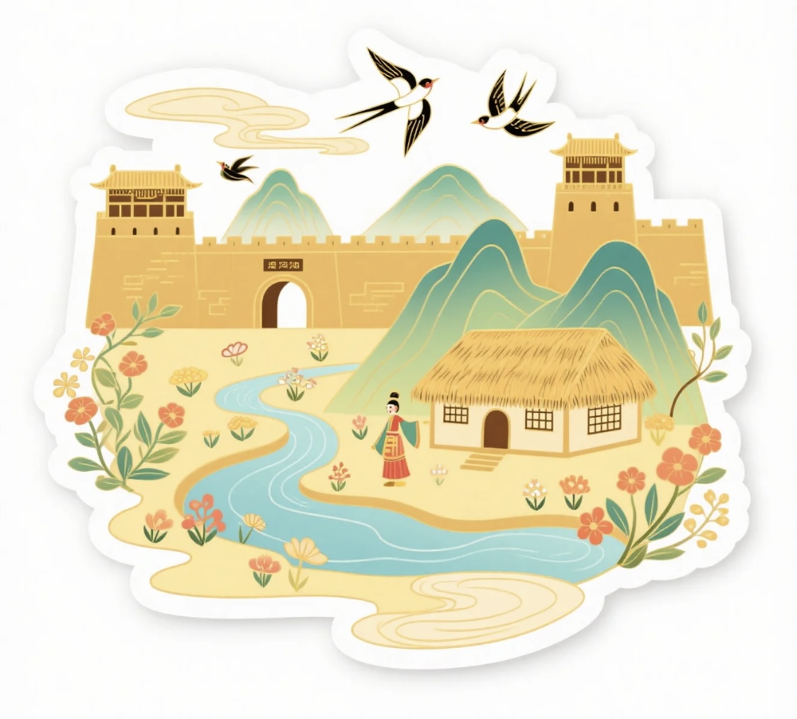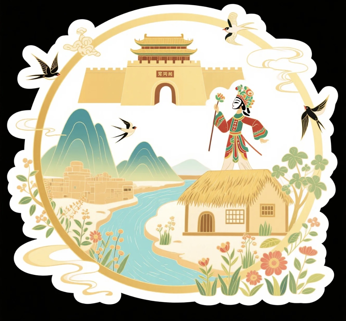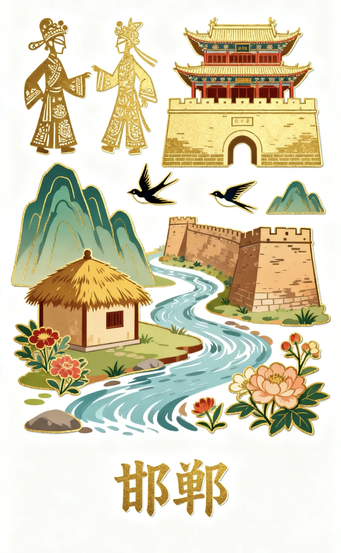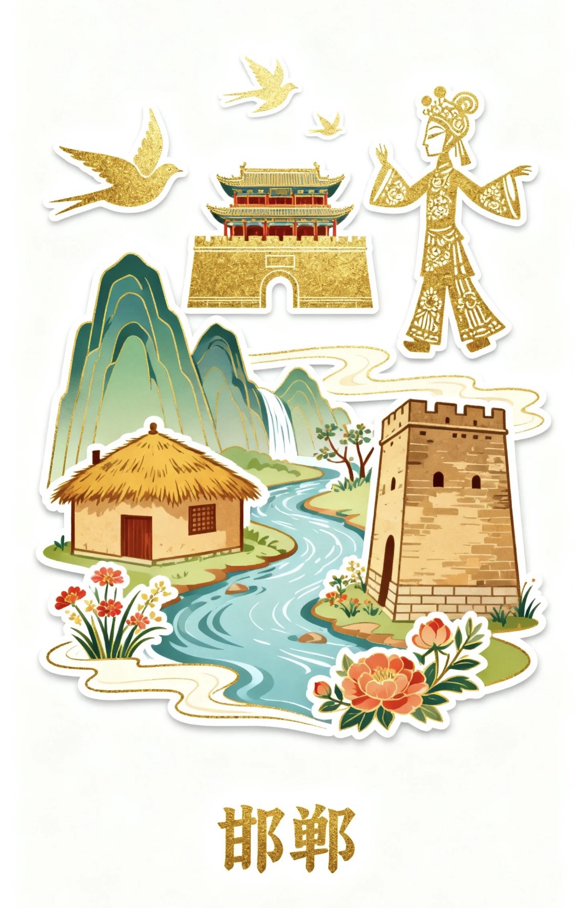设计说明 作品围绕邯郸展开创作,融入了诸多极具邯郸特色的元素。画面中的古建筑,展现出邯郸作为历史文化名城的厚重底蕴,承载着千年岁月的记忆;皮影元素是邯郸文化艺术的代表之一,彰显出独特的民间艺术魅力;山水、茅屋、溪流等元素,勾勒出邯郸秀美的自然风光与田园意趣,体现出这座城市在自然与人文融合下的独特气质。整体设计以新颖的绘画风格,将邯郸的古韵与新时代的审美相融合,旨在呈现出邯郸既有着深厚历史积淀,又充满生机与活力的文化风貌,让人们能从作品中感受到邯郸文化的多元与精彩。