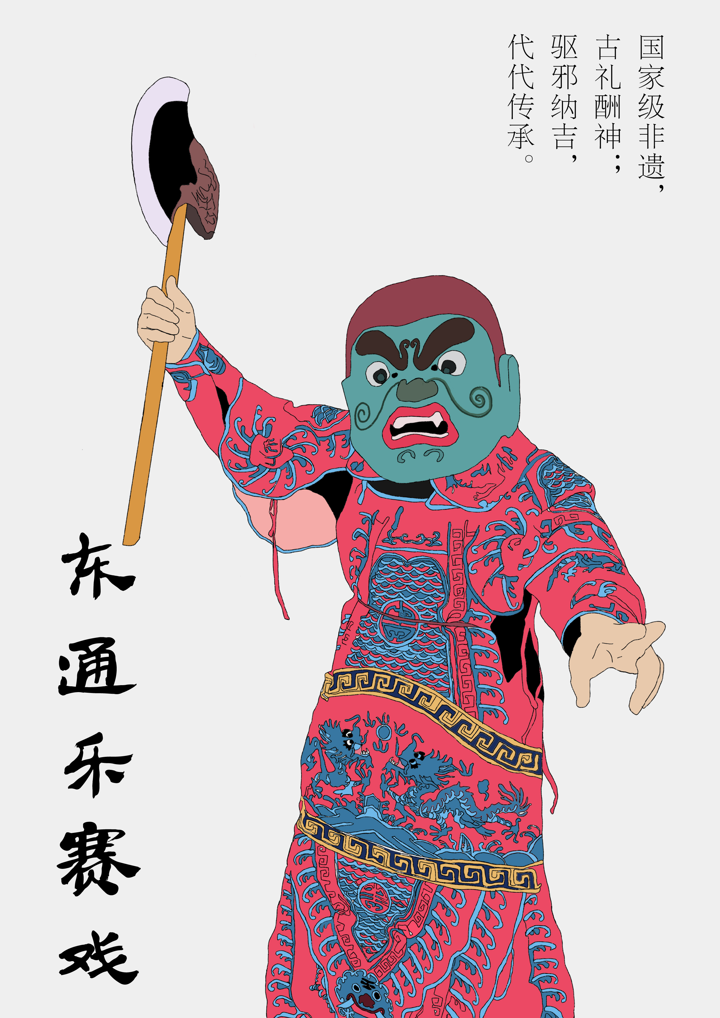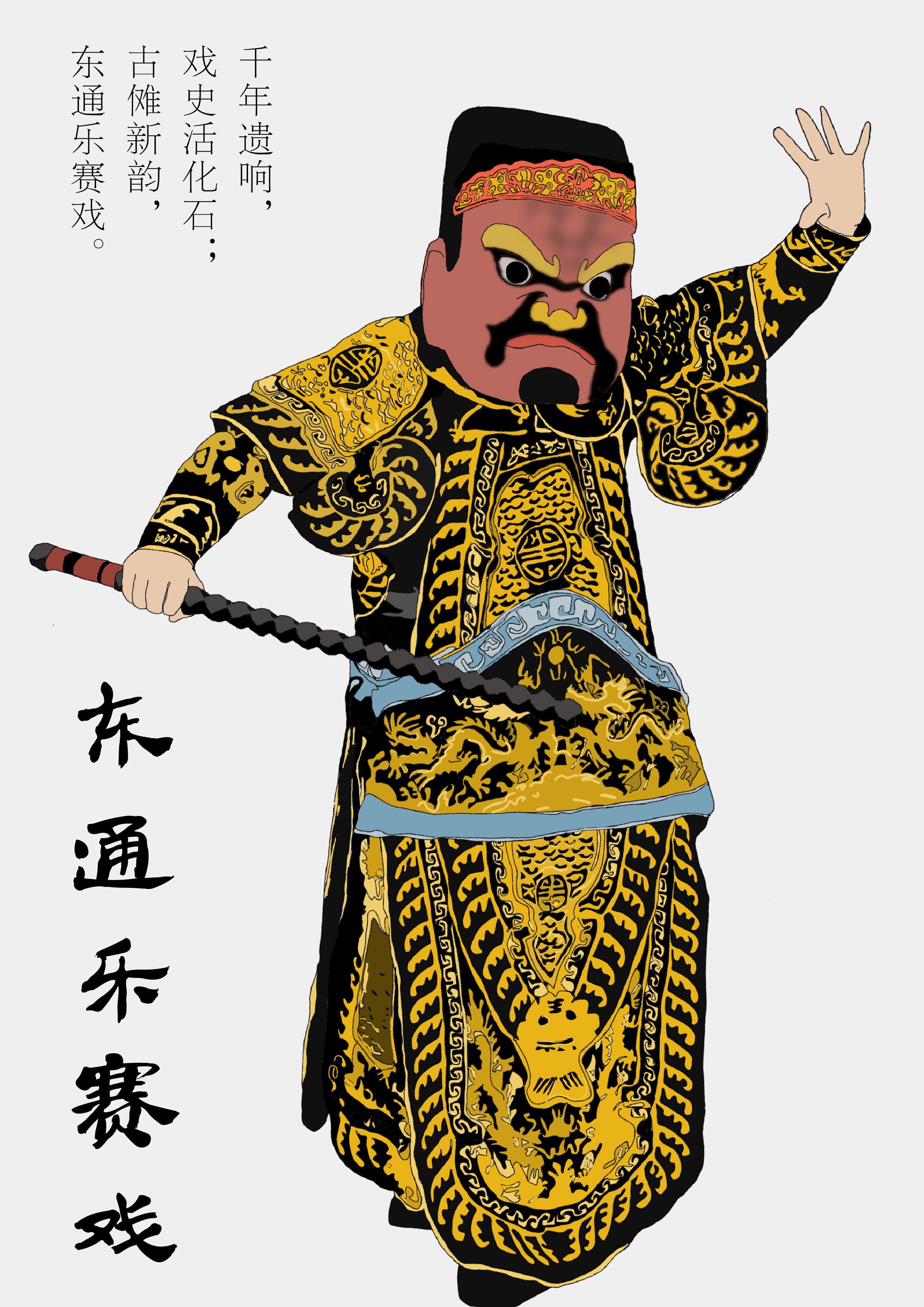 主画面提取邯郸武安东通乐赛戏,人物造型提取传统扮相,夸张脸谱搭配华丽服饰(以金黄、大红为主 色调,饰有龙纹等吉祥纹样),色彩浓烈、纹样精美,尽显古朴威严的仪式感,契合“驱魔辟邪”的 民俗功能。文字采用古朴书法字体,与赛戏的历史厚重感相衬,“百年赛戏 驱魔辟邪”凸显其文化 价值,“东通乐赛戏”强化地域与非遗标识,整体设计融合传统美学与民俗内涵,助力非遗文化传播。