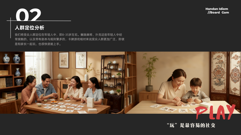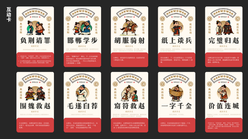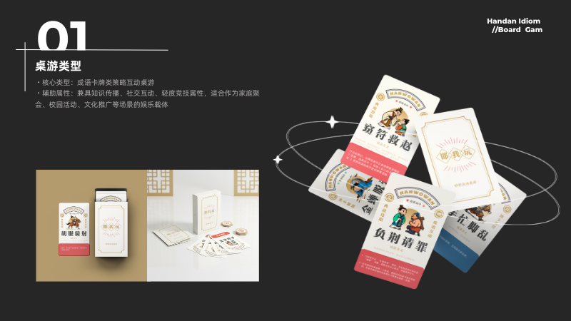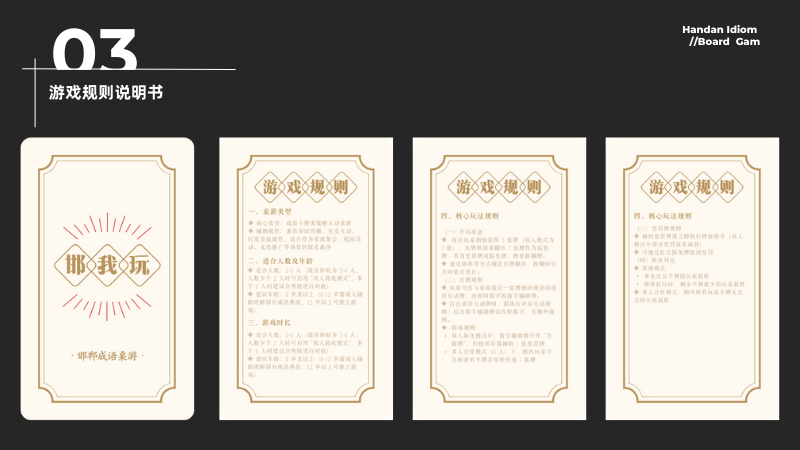 本桌游以邯郸成语为核心的卡牌类策略互动桌游,旨在通过趣味游戏形式传播邯郸成语文化,兼具知识传递、社交互动与轻度竞技属性,适用于家庭聚会、校园活动、文化推广等多场景。