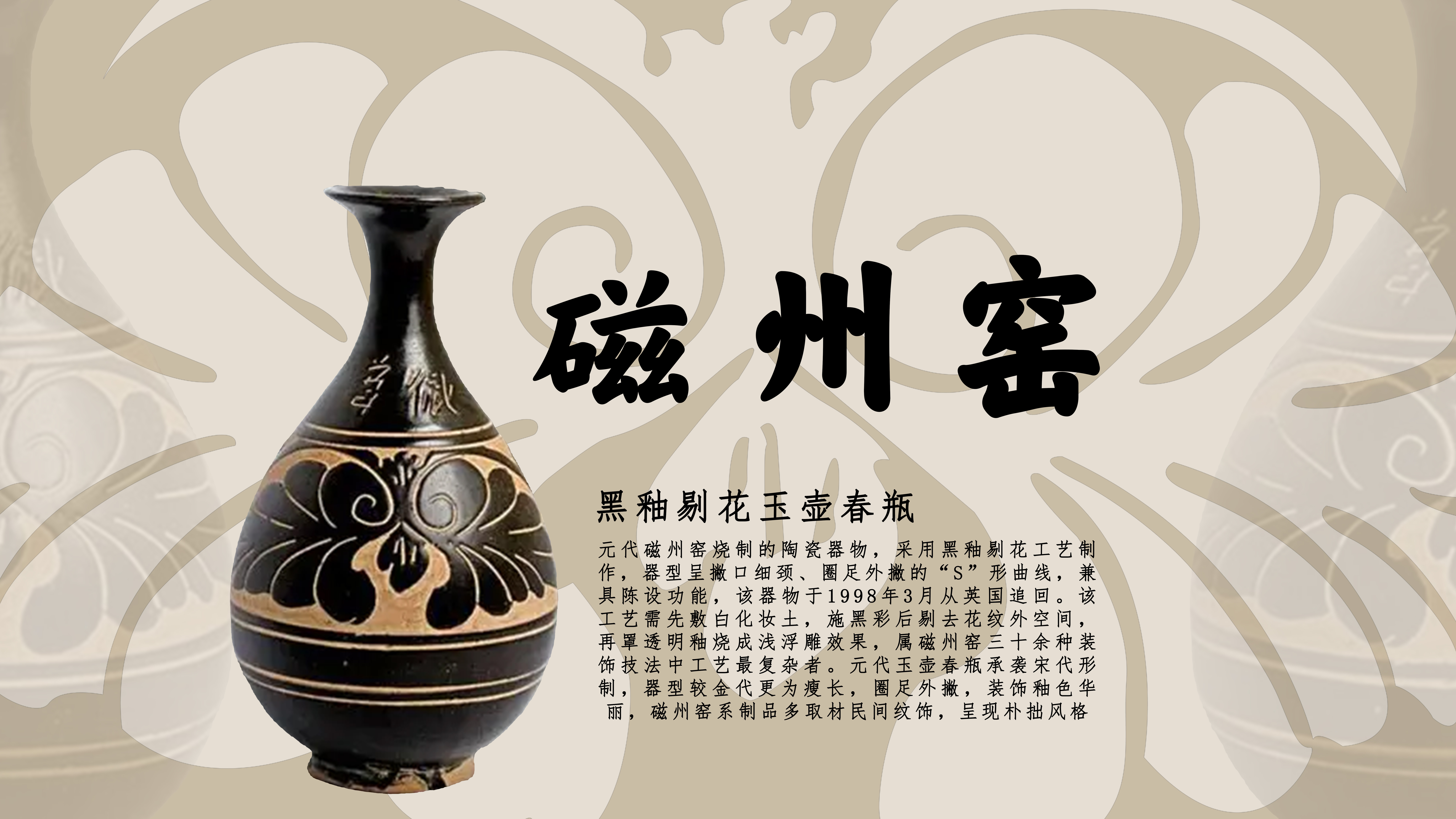 先引用磁州窑工艺(先敷白化妆土,施黑彩后剔去花纹外空间,再罩透明釉,成浅浮雕效果),在使用瓶身花纹与瓶身本体结合。