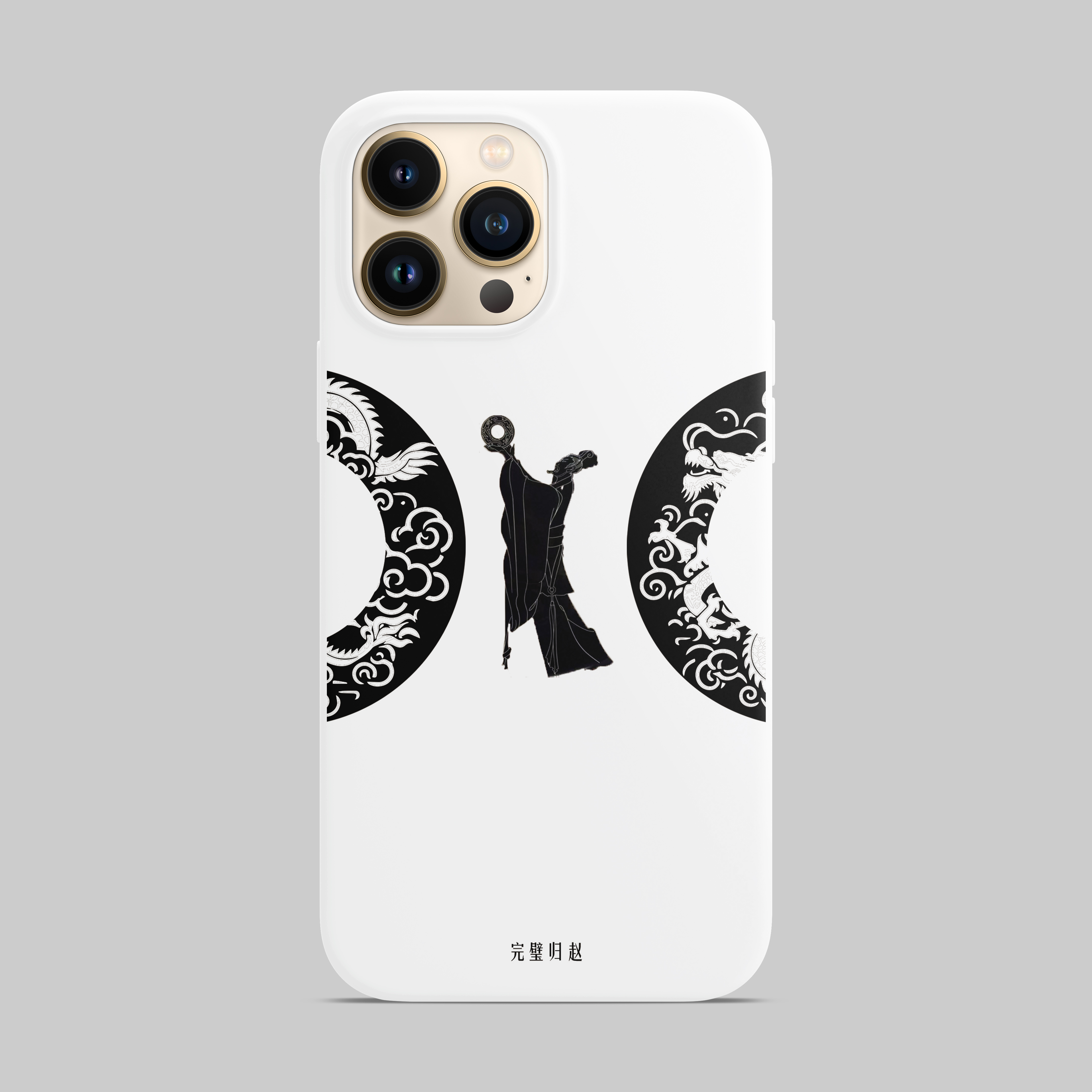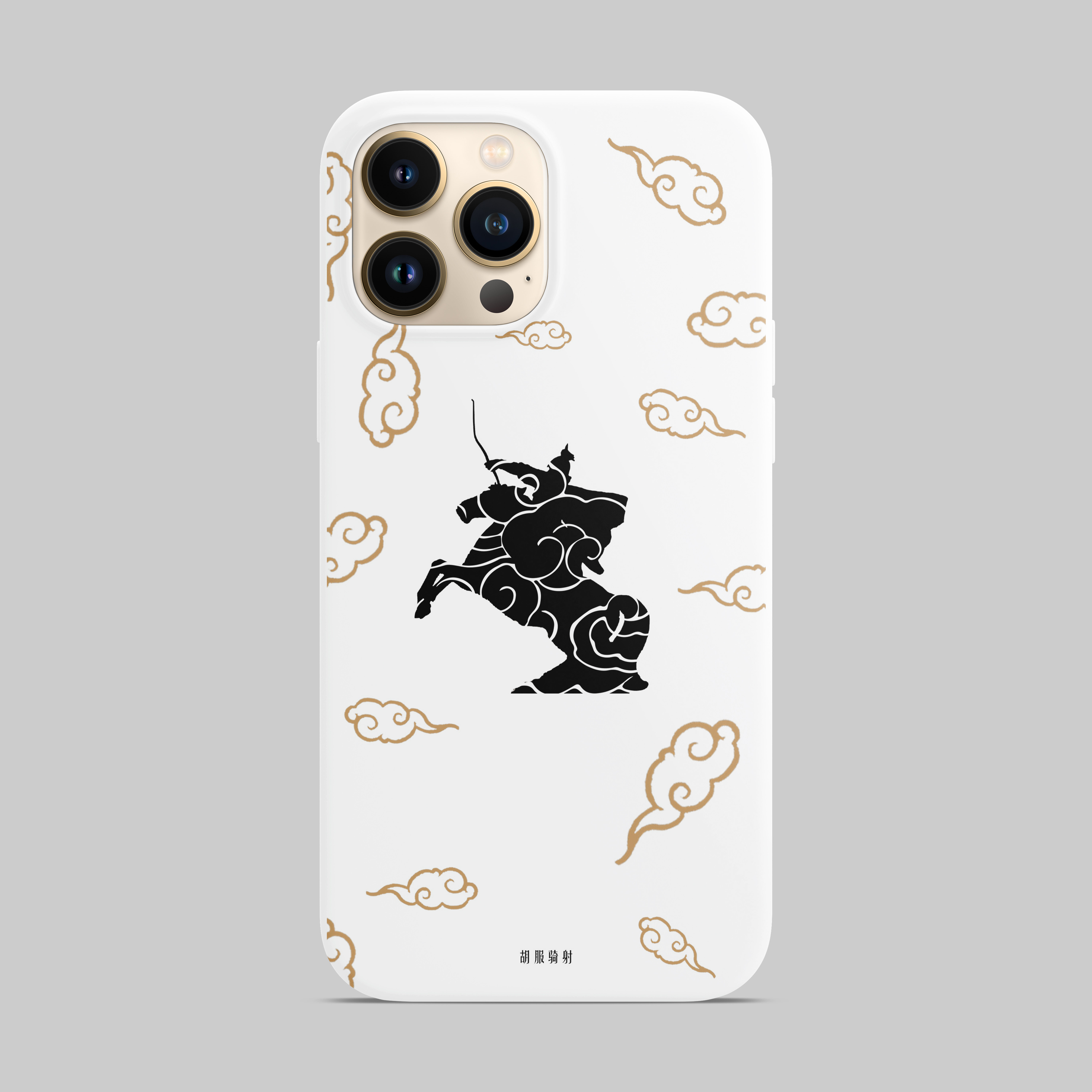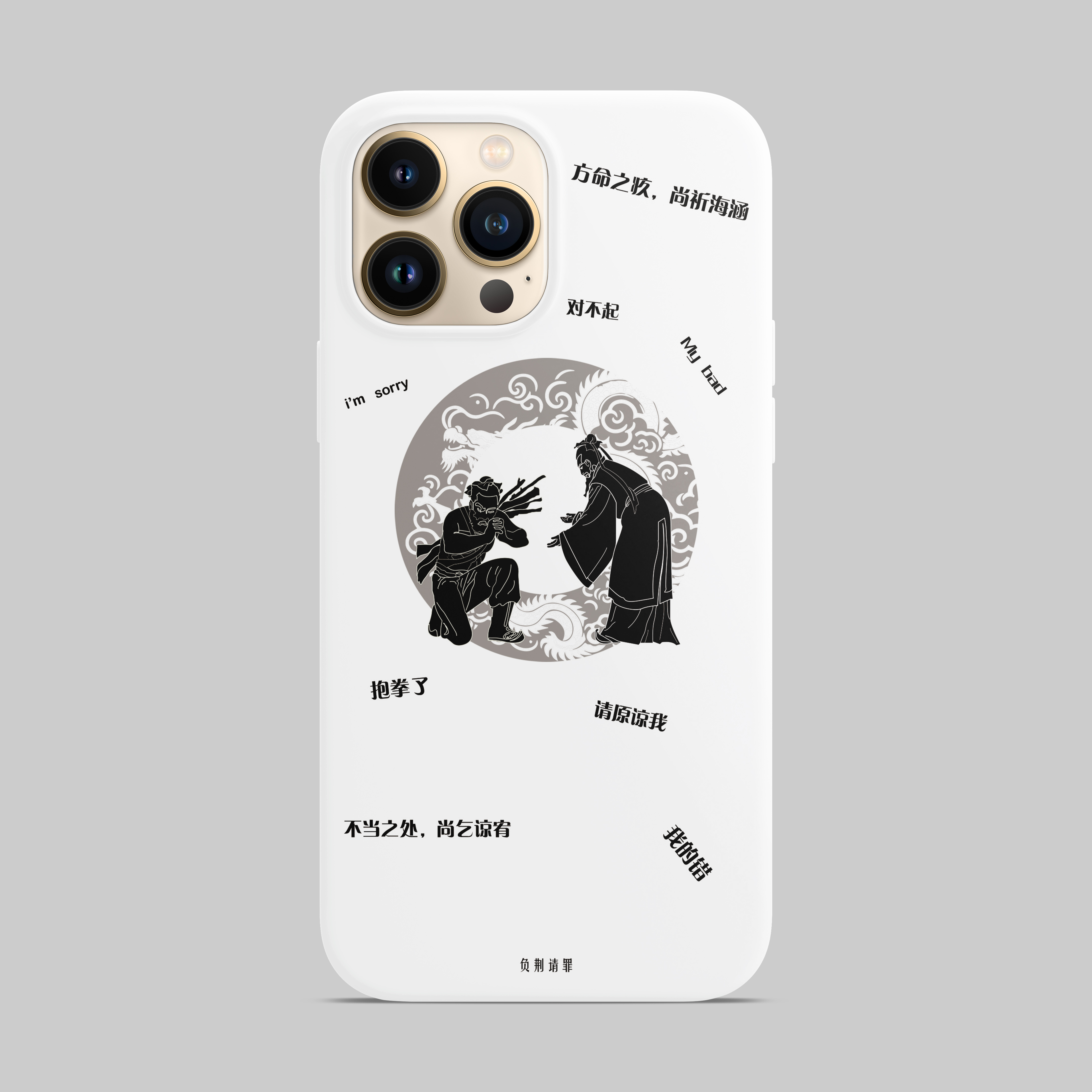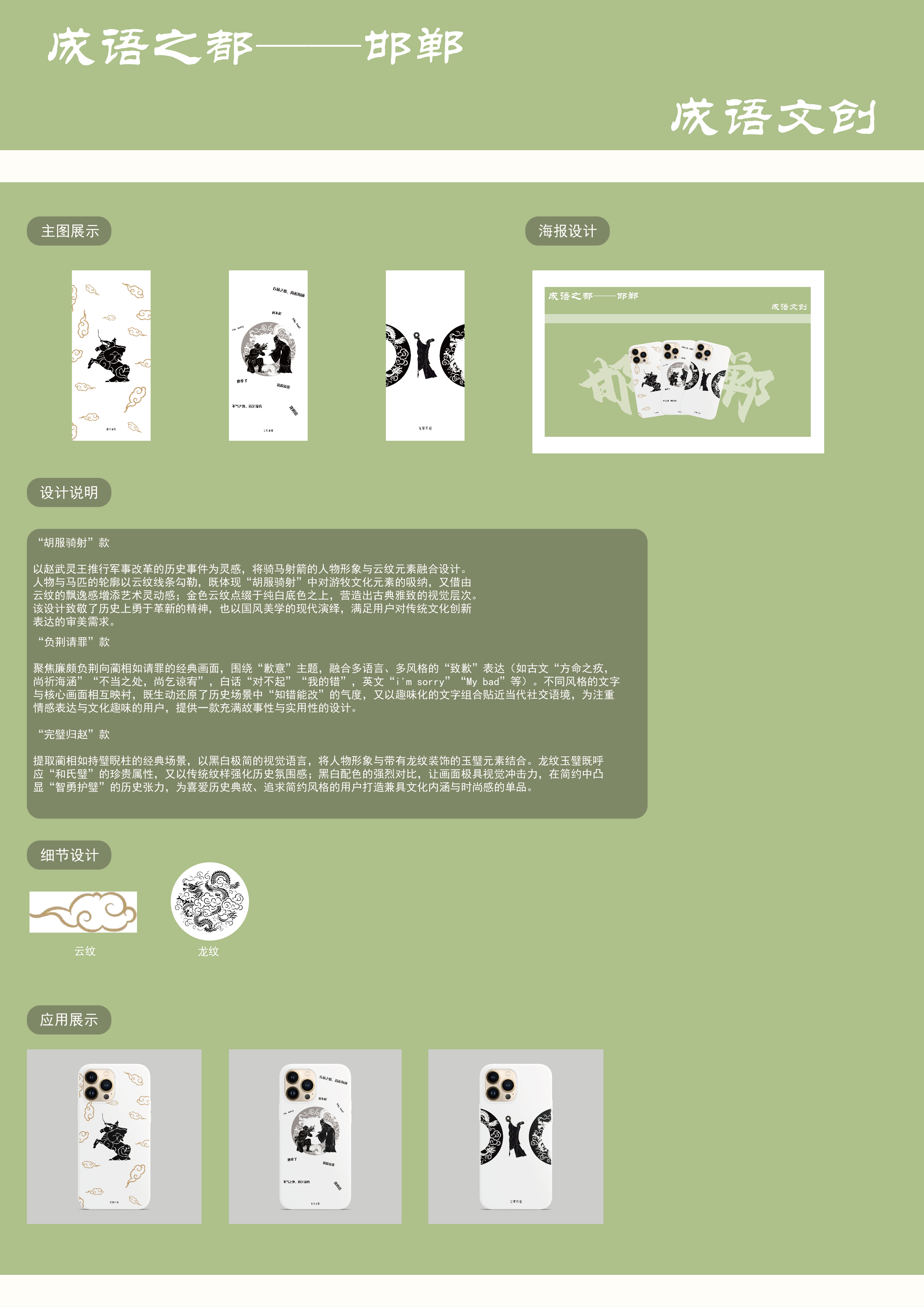 “完璧归赵”款 提取蔺相如持璧睨柱的经典场景,以黑白极简的视觉语言,将人物形象与带有龙纹装饰的玉璧元素结合。龙纹玉璧既呼应“和氏璧”的珍贵属性,又以传统纹样强化历史氛围感;黑白配色的强烈对比,让画面极具视觉冲击力,在简约中凸显“智勇护璧”的历史张力,为喜爱历史典故、追求简约风格的用户打造兼具文化内涵与时尚感的单品。 “负荆请罪”款 聚焦廉颇负荆向蔺相如请罪的经典画面,围绕“歉意”主题,融合多语言、多风格的“致歉”表达(如古文“方命之疚,尚祈海涵”“不当之处,尚乞谅宥”,白话“对不起”“我的错”,英文“i'm sorry”“My bad”等)。不同风格的文字与核心画面相互映衬,既生动还原了历史场景中“知错能改”的气度,又以趣味化的文字组合贴近当代社交语境,为注重情感表达与文化趣味的用户,提供一款充满故事性与实用性的设计。 “胡服骑射”款 以赵武灵王推行军事改革的历史事件为灵感,将骑马射箭的人物形象与云纹元素融合设计。人物与马匹的轮廓以云纹线条勾勒,既体现“胡服骑射”中对游牧文化元素的吸纳,又借由云纹的飘逸感增添艺术灵动感;金色云纹点缀于纯白底色之上,营造出古典雅致的视觉层