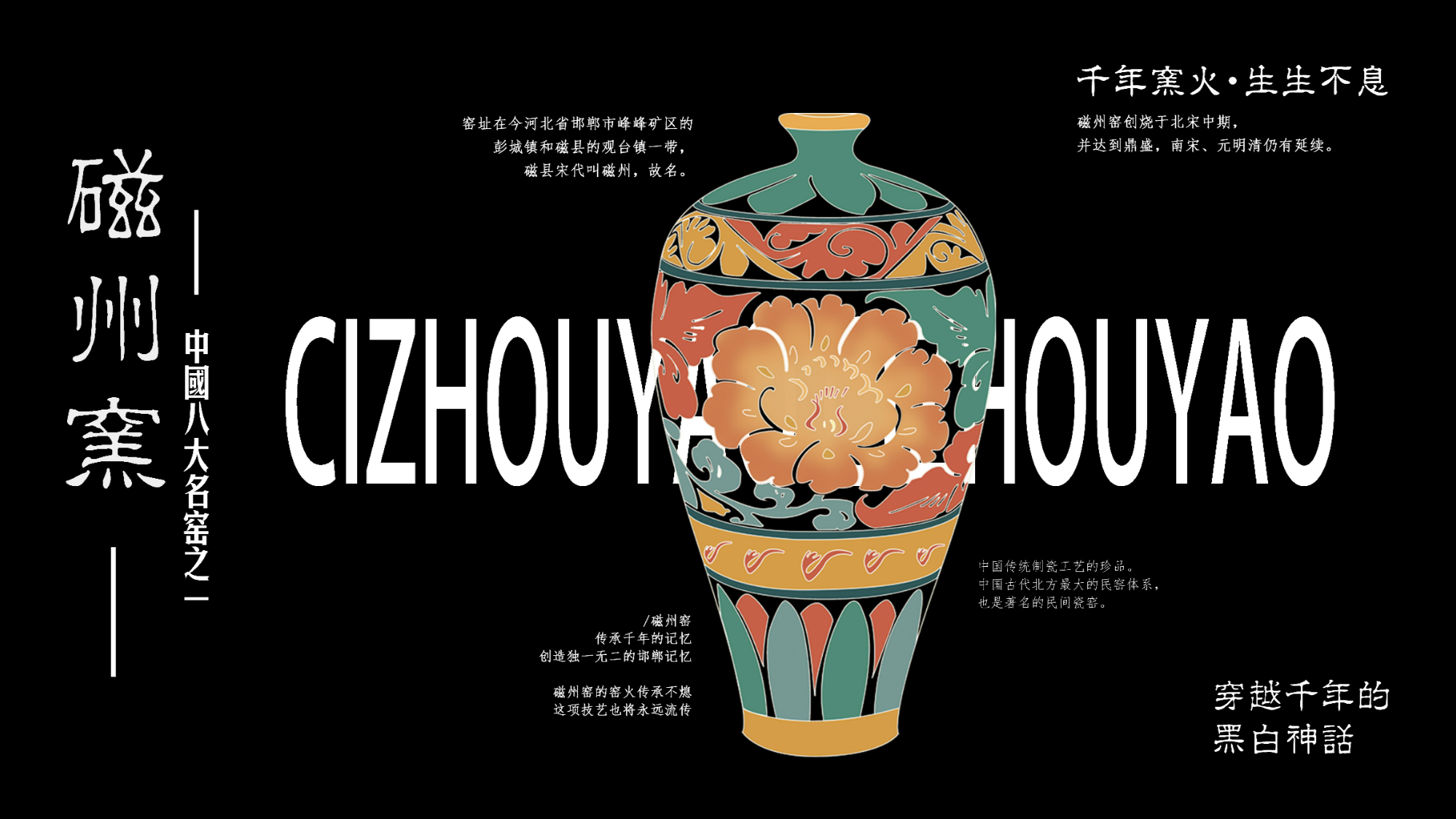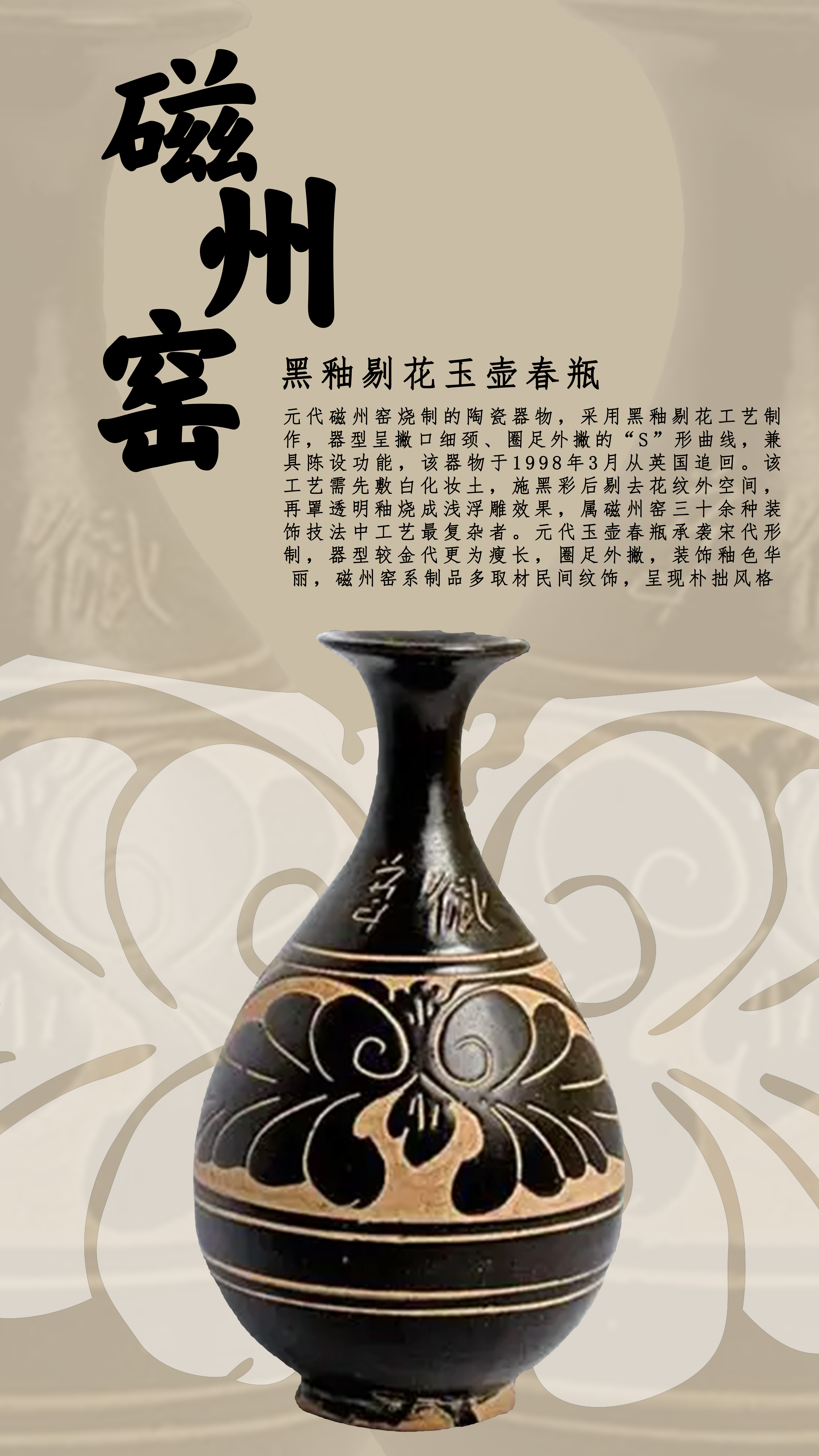 此设计围绕磁州窑经典器物黑釉剔花玉壶春瓶展开,提取其撇口细颈、圈足外撇的优美“S”形器型,以及先敷白化妆土、施黑彩再剔花的独特工艺和朴拙民间纹饰,旨在展现传统陶瓷艺术魅力与文化价值,可用于文化展示、文创开发等领域。