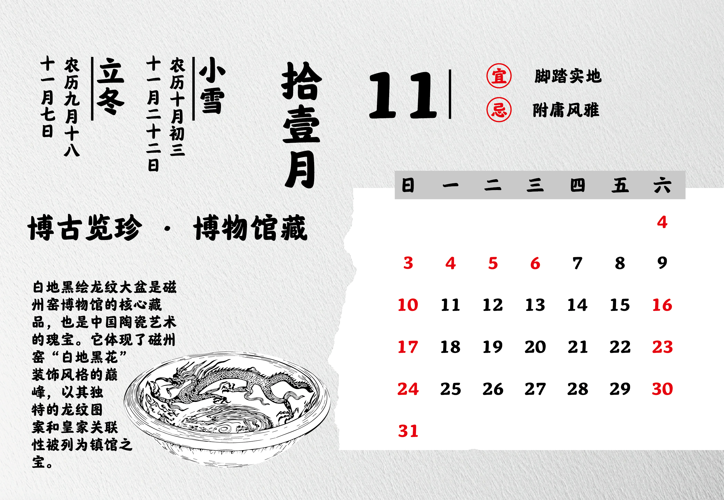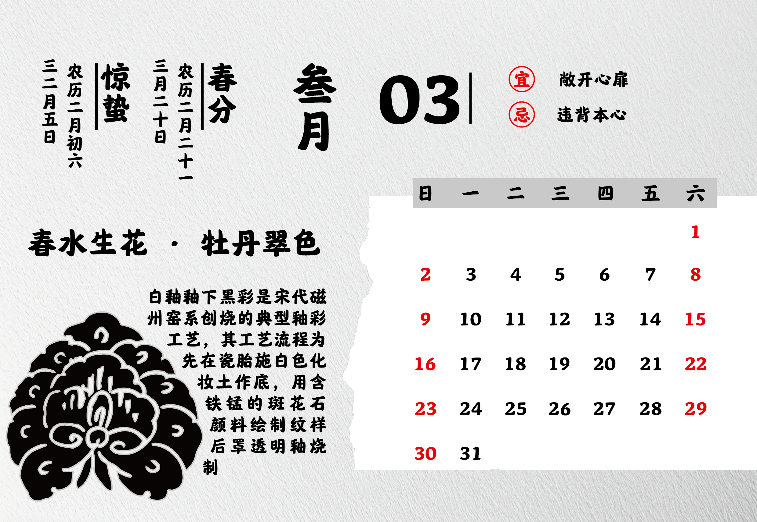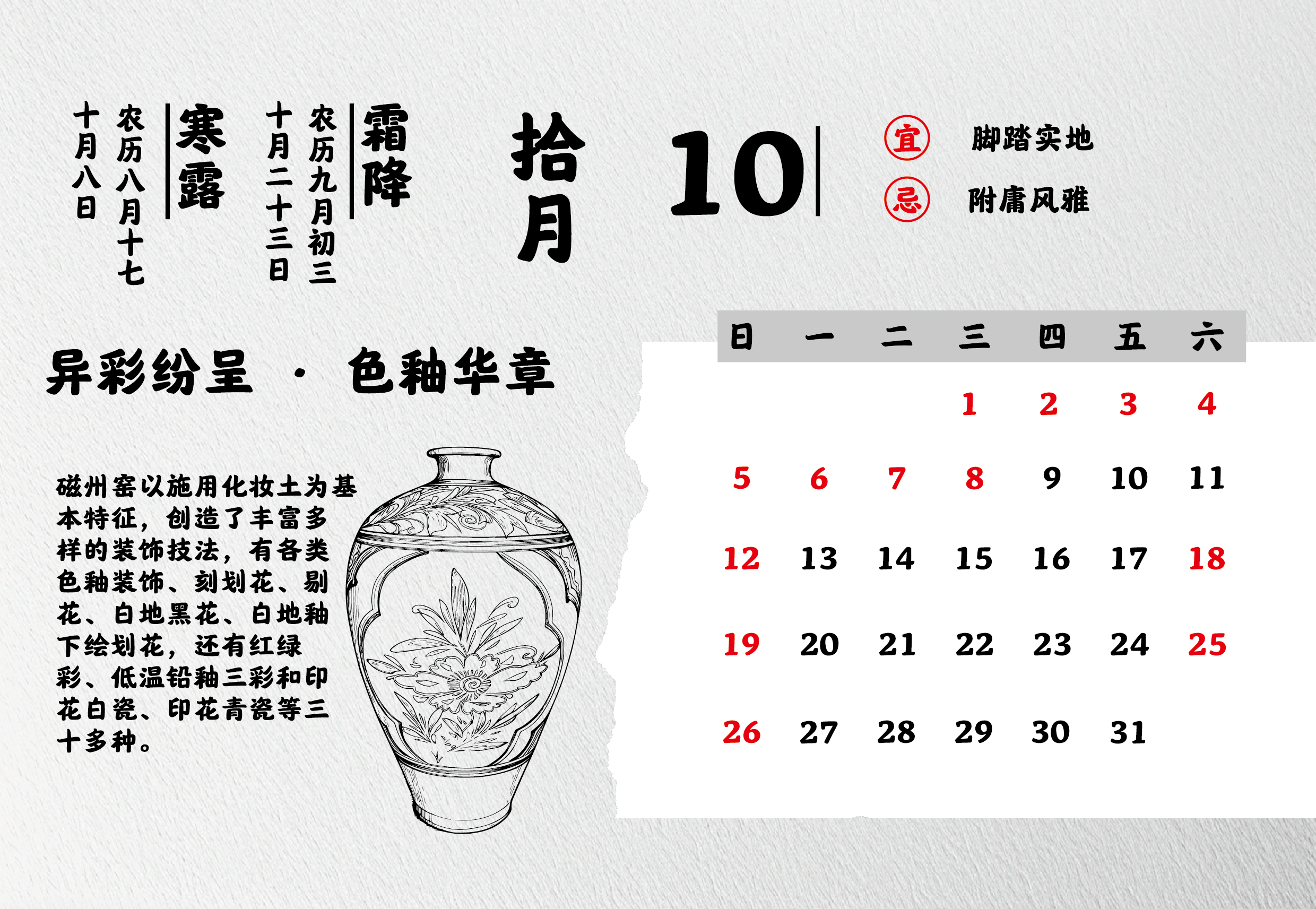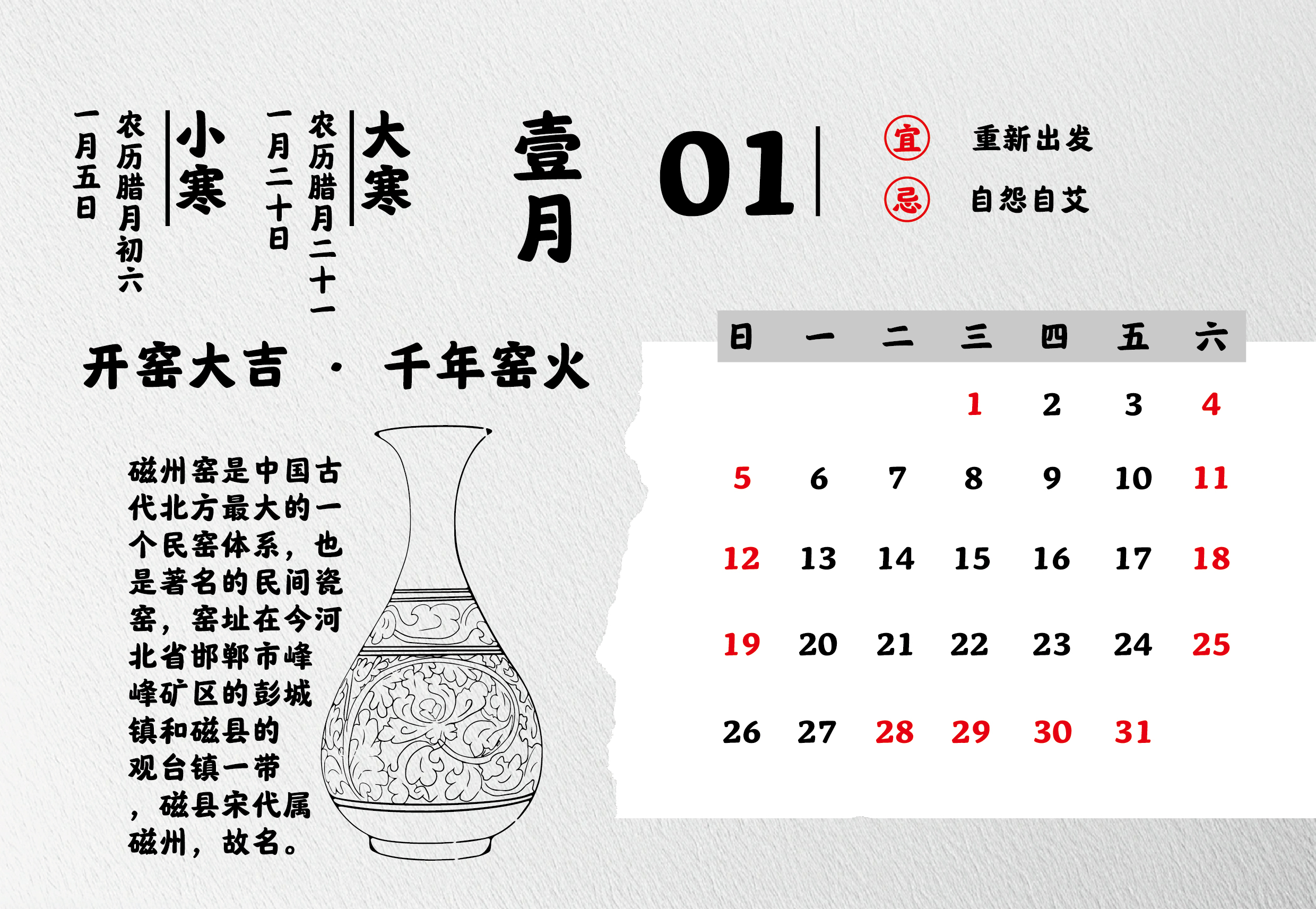 以磁州窑为核心主题,聚焦磁州窑这一中国古代北方著名民窑体系,将传统陶瓷文化与日历载体结合,兼具知识传播与日常使用价值。 采用黑白为主的简约配色,辅以红色标注日期与宜忌,既凸显传统文化的古朴质感,又通过红色增强信息辨识度。左侧融入磁州窑典型器物的线稿,直观展现磁州窑的工艺美学;文字排版兼顾传统竖排与现代横排,实现古今视觉语言的平衡。 整合公历日期、农历节气,满足不同时间认知习惯的需求。通过文字板块详细介绍磁州窑的历史地位、窑址位置与命名渊源,将日历升级为微型文化科普载体。设置“宜重新出发,忌自怨自艾”的宜忌提示,为用户提供日常行为参考,增加日历的生活指导性。 通过“传统工艺+时间工具+生活提示”的多维融合,让用户在查看日期的同时,潜移默化地感受磁州窑的千年窑火魅力,实现实用功能与文化传播的双重价值,唤醒大众对中国传统民窑文化的关注与认同