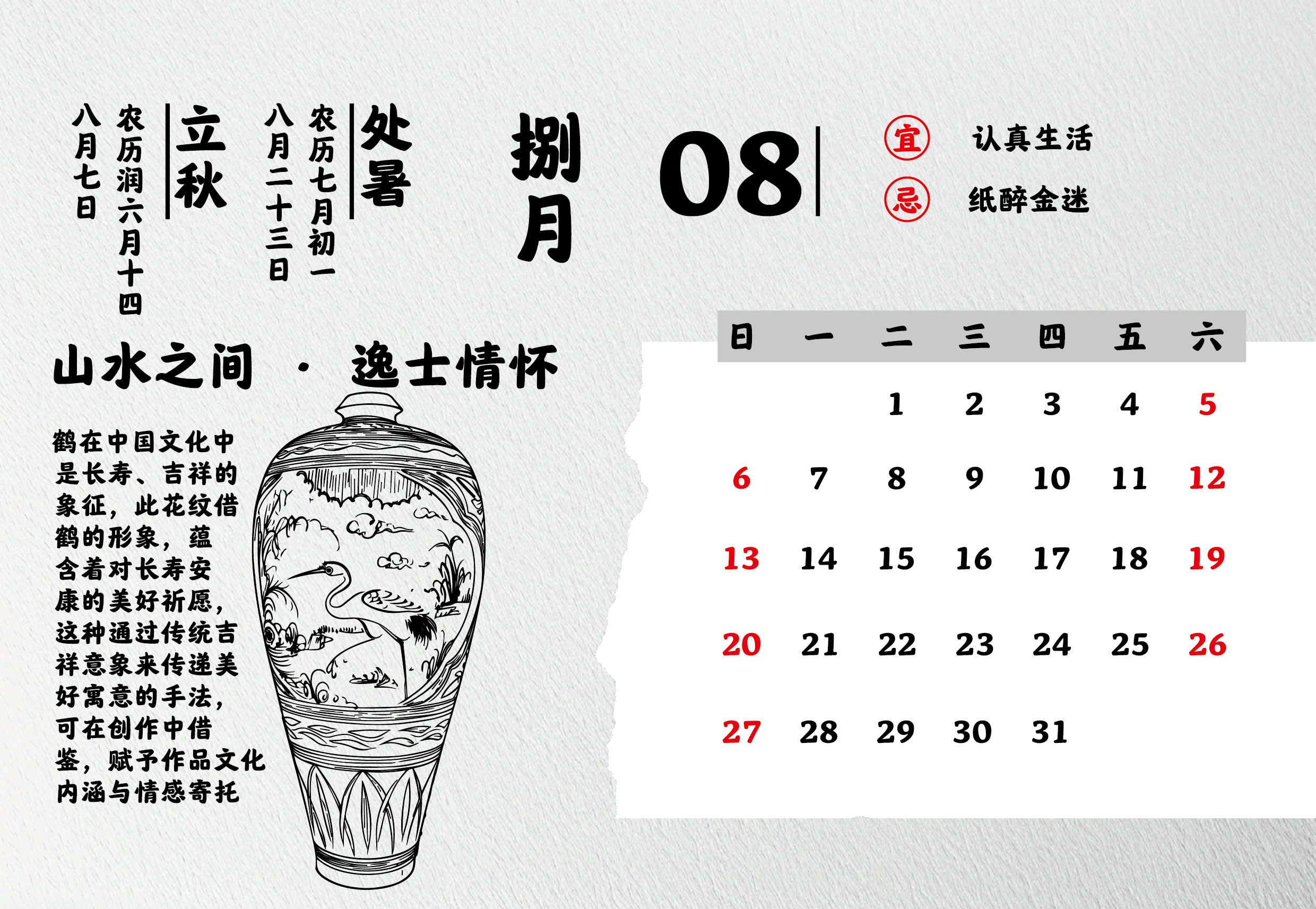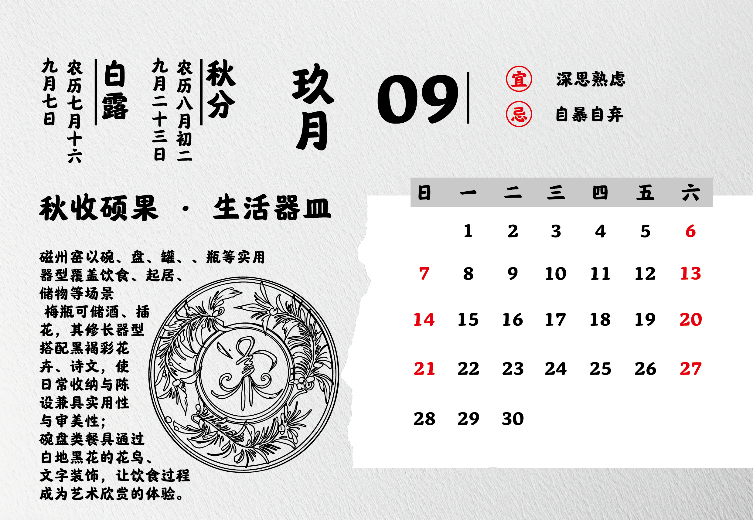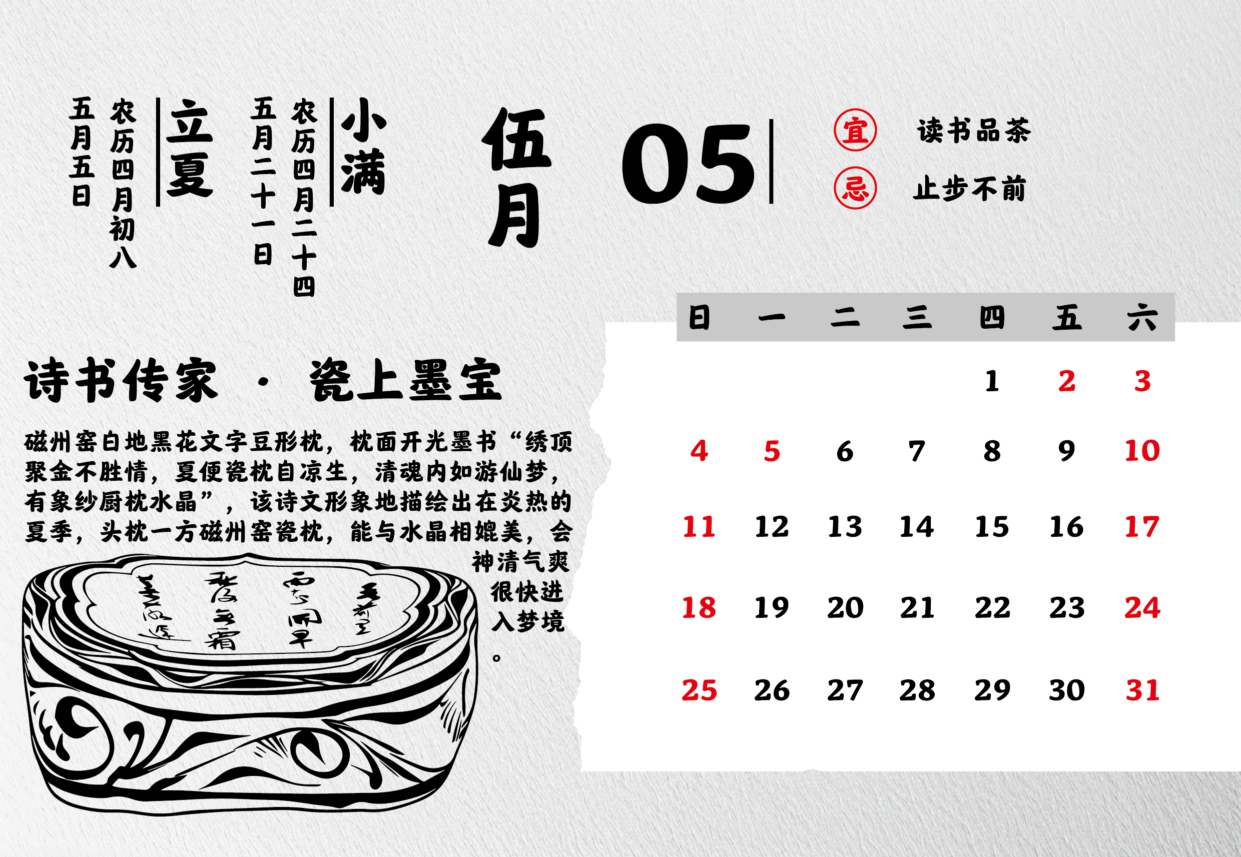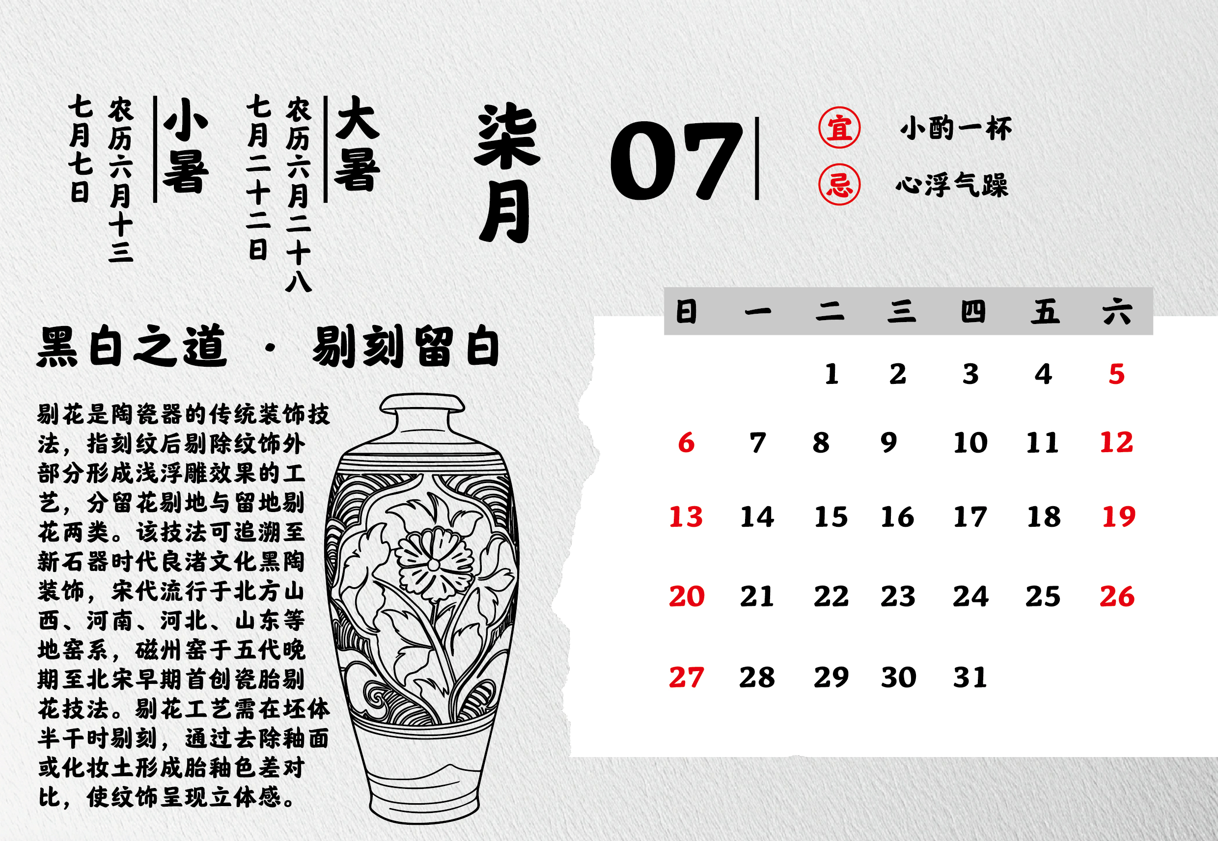 以磁州窑为核心主题,聚焦磁州窑这一中国古代北方著名民窑体系,将传统陶瓷文化与日历载体结合,兼具知识传播与日常使用价值。 采用黑白为主的简约配色,辅以红色标注日期与宜忌,既凸显传统文化的古朴质感,又通过红色增强信息辨识度。左侧融入磁州窑典型器物的线稿,直观展现磁州窑的工艺美学;文字排版兼顾传统竖排与现代横排,实现古今视觉语言的平衡。 整合公历日期、农历节气,满足不同时间认知习惯的需求。通过文字板块详细介绍磁州窑的历史地位、窑址位置与命名渊源,将日历升级为微型文化科普载体。设置“宜重新出发,忌自怨自艾”的宜忌提示,为用户提供日常行为参考,增加日历的生活指导性。 通过“传统工艺+时间工具+生活提示”的多维融合,让用户在查看日期的同时,潜移默化地感受磁州窑的千年窑火魅力,实现实用功能与文化传播的双重价值,唤醒大众对中国传统民窑文化的关注与认同