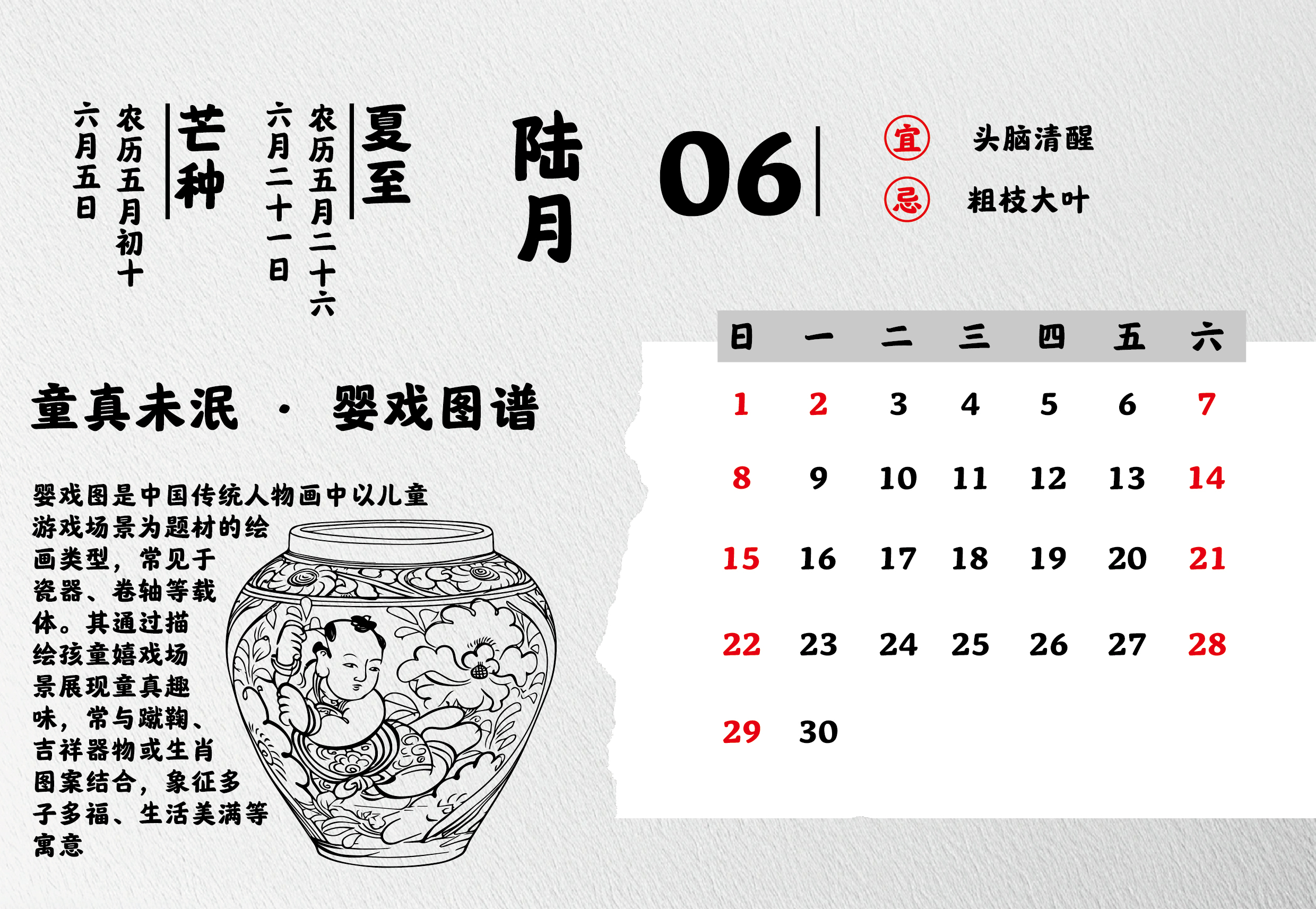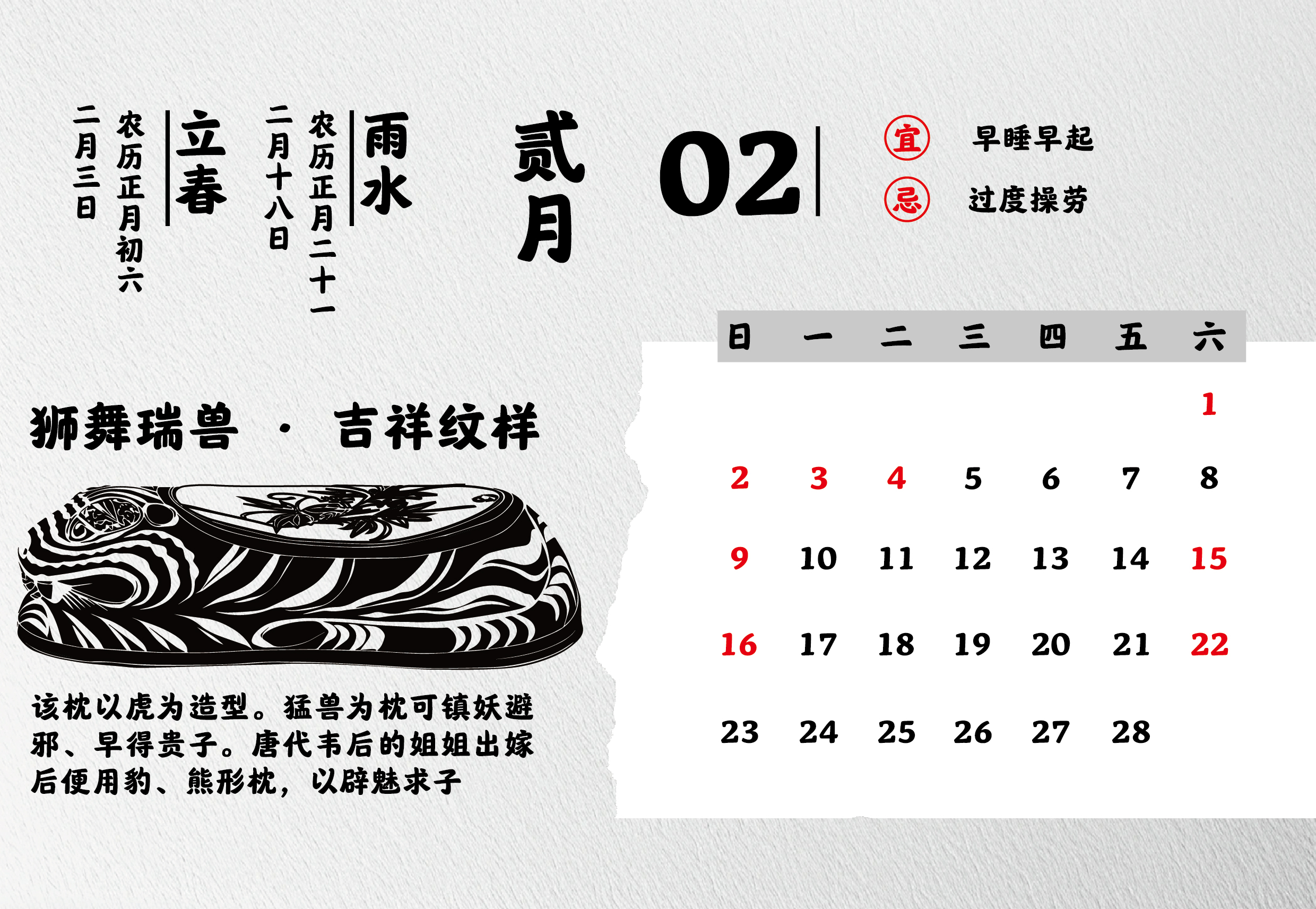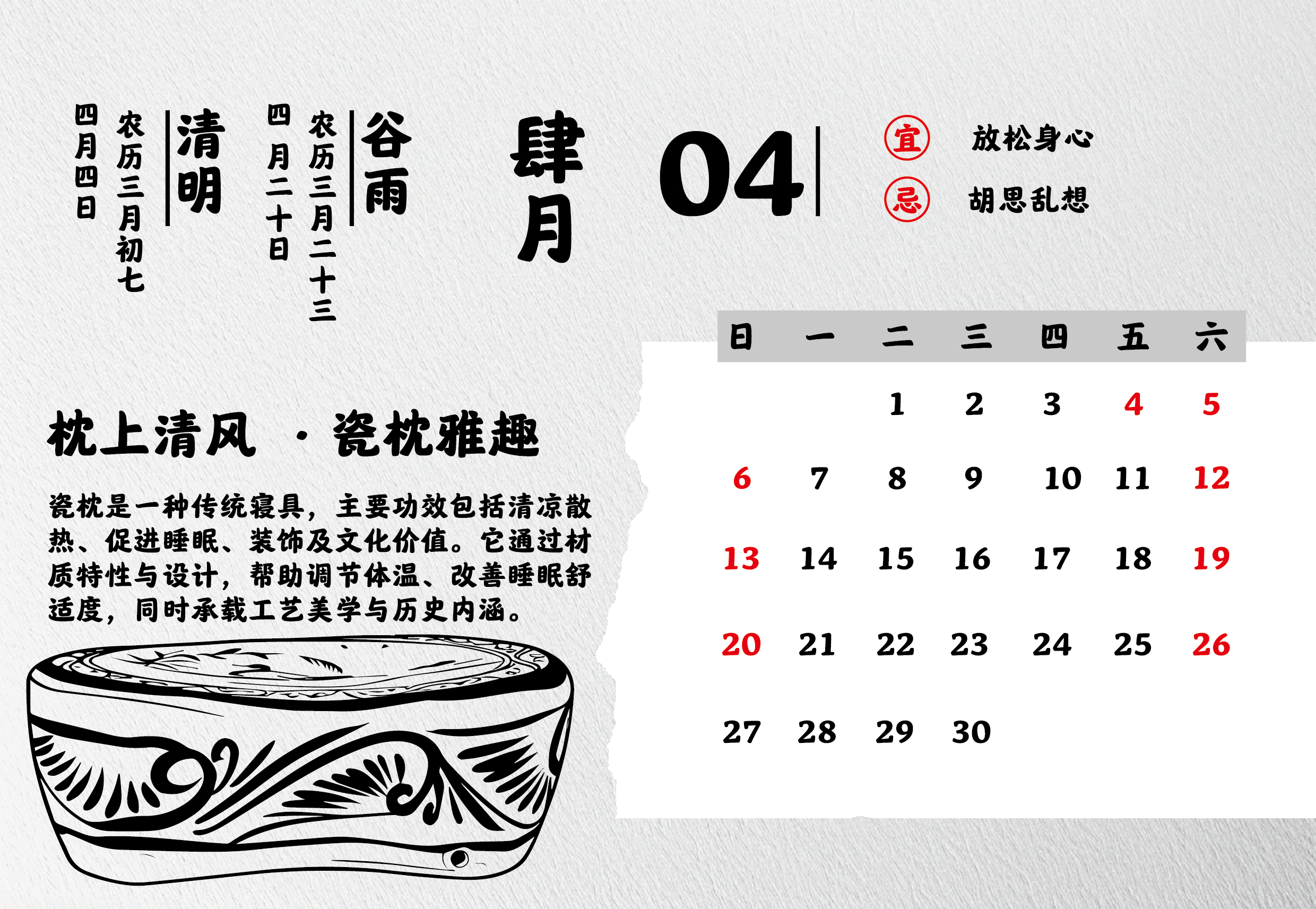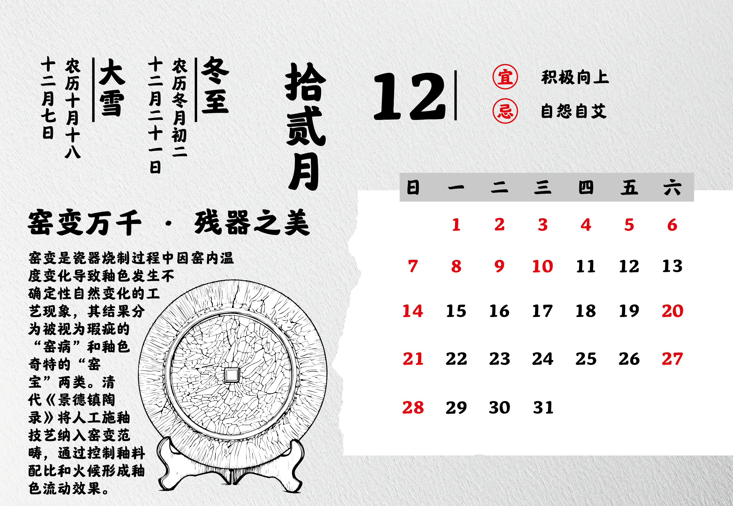 以磁州窑为核心主题,聚焦磁州窑这一中国古代北方著名民窑体系,将传统陶瓷文化与日历载体结合,兼具知识传播与日常使用价值。 采用黑白为主的简约配色,辅以红色标注日期与宜忌,既凸显传统文化的古朴质感,又通过红色增强信息辨识度。左侧融入磁州窑典型器物的线稿,直观展现磁州窑的工艺美学;文字排版兼顾传统竖排与现代横排,实现古今视觉语言的平衡。 整合公历日期、农历节气,满足不同时间认知习惯的需求。通过文字板块详细介绍磁州窑的历史地位、窑址位置与命名渊源,将日历升级为微型文化科普载体。设置“宜重新出发,忌自怨自艾”的宜忌提示,为用户提供日常行为参考,增加日历的生活指导性。 通过“传统工艺+时间工具+生活提示”的多维融合,让用户在查看日期的同时,潜移默化地感受磁州窑的千年窑火魅力,实现实用功能与文化传播的双重价值,唤醒大众对中国传统民窑文化的关注与认同