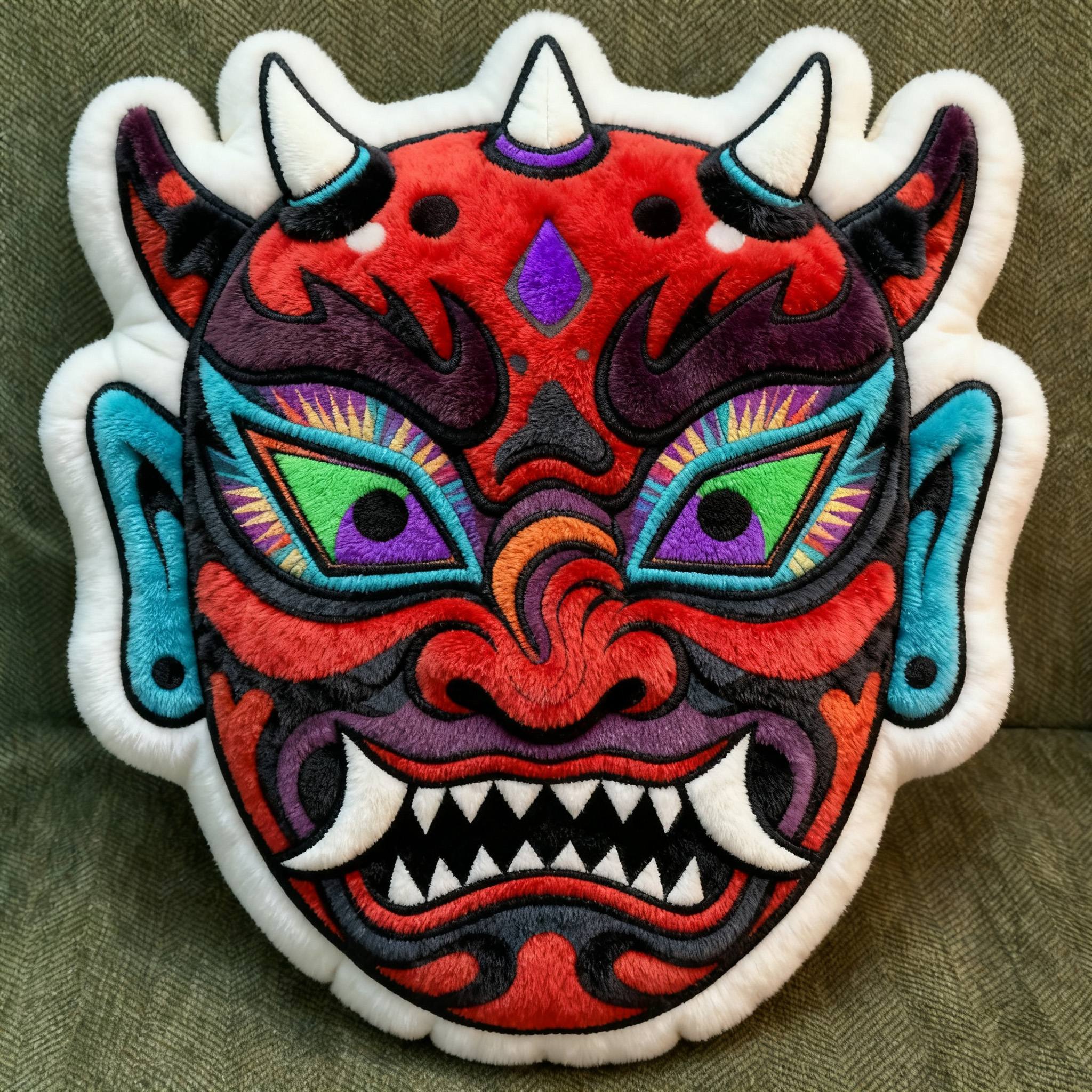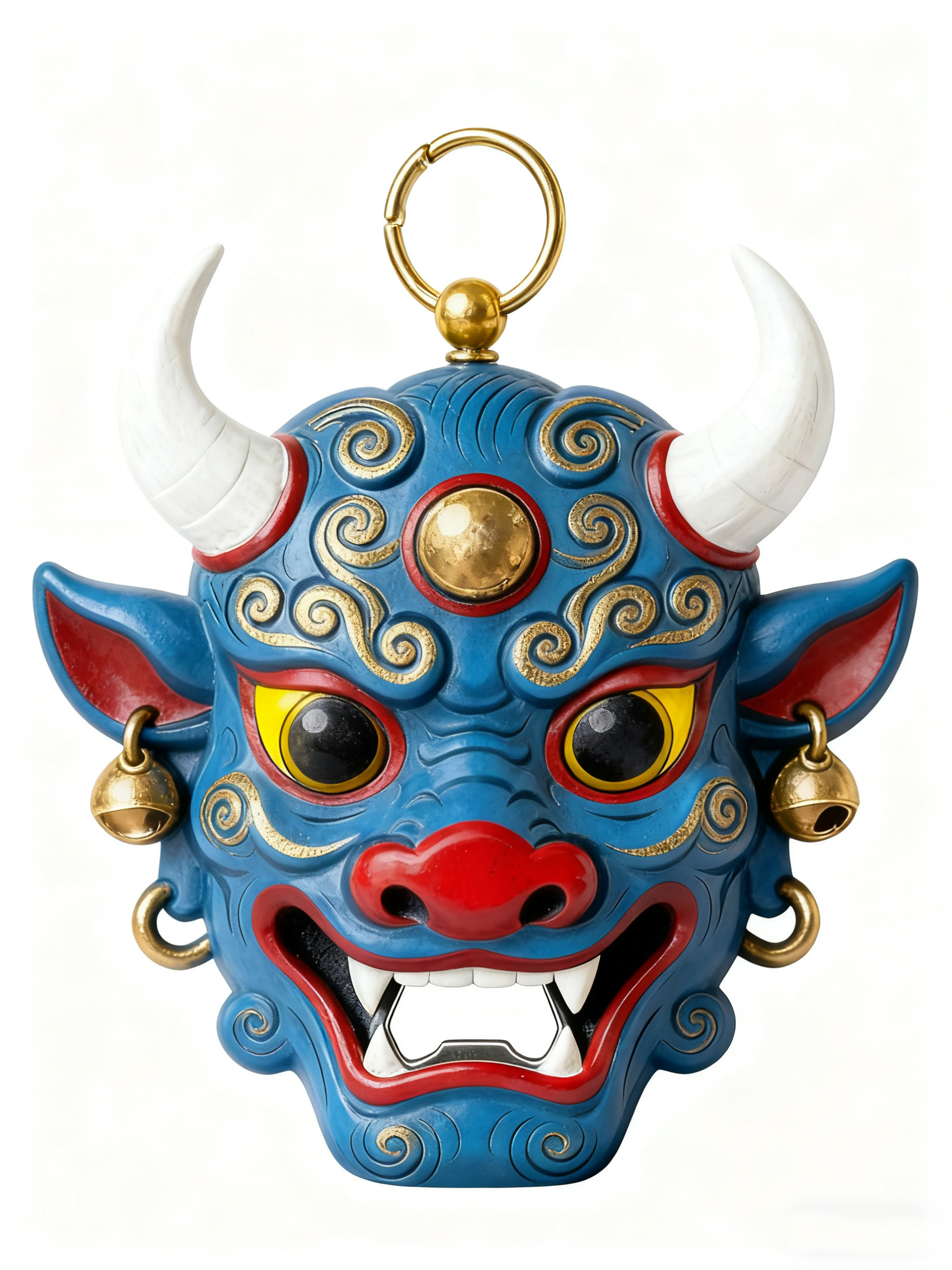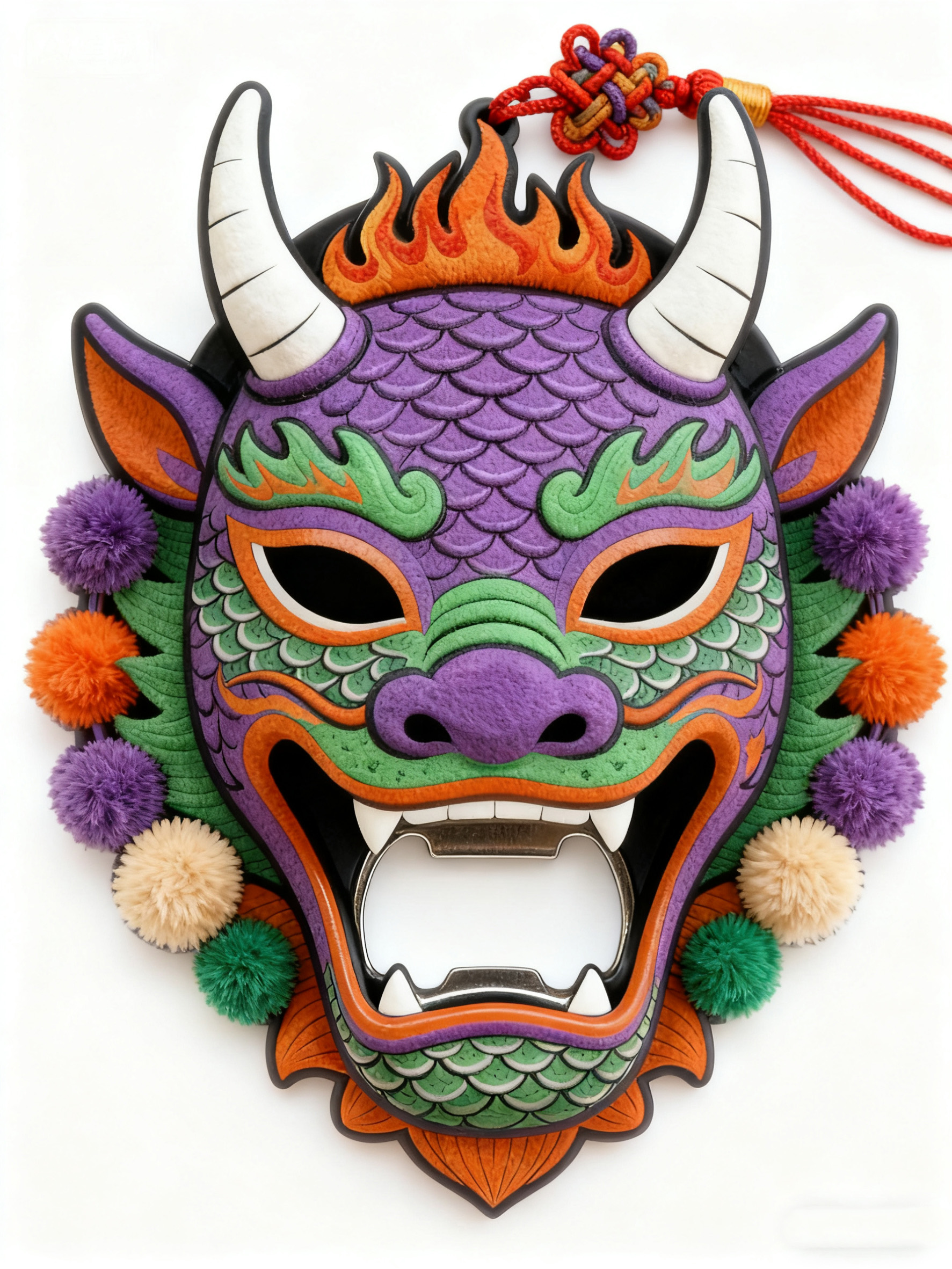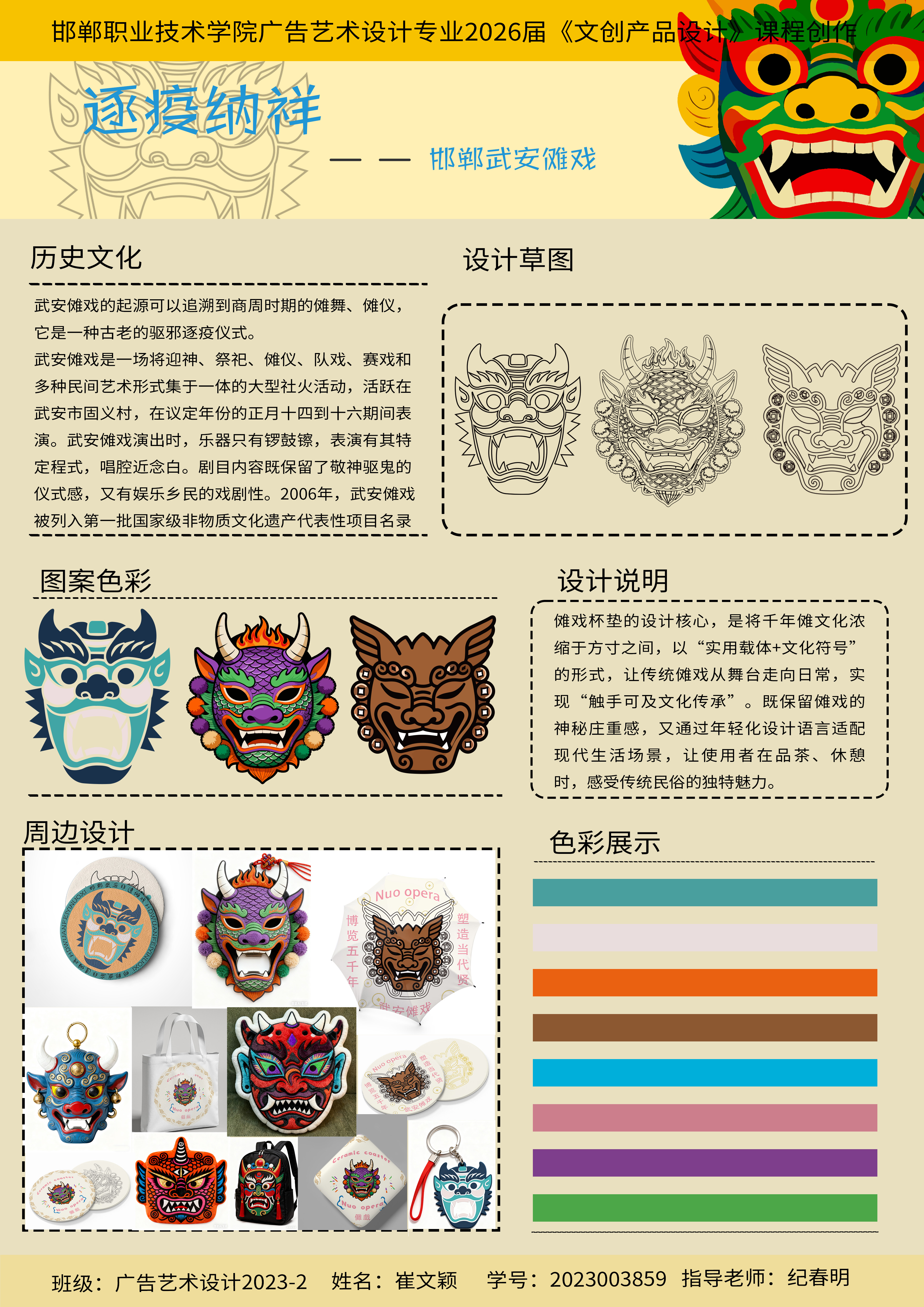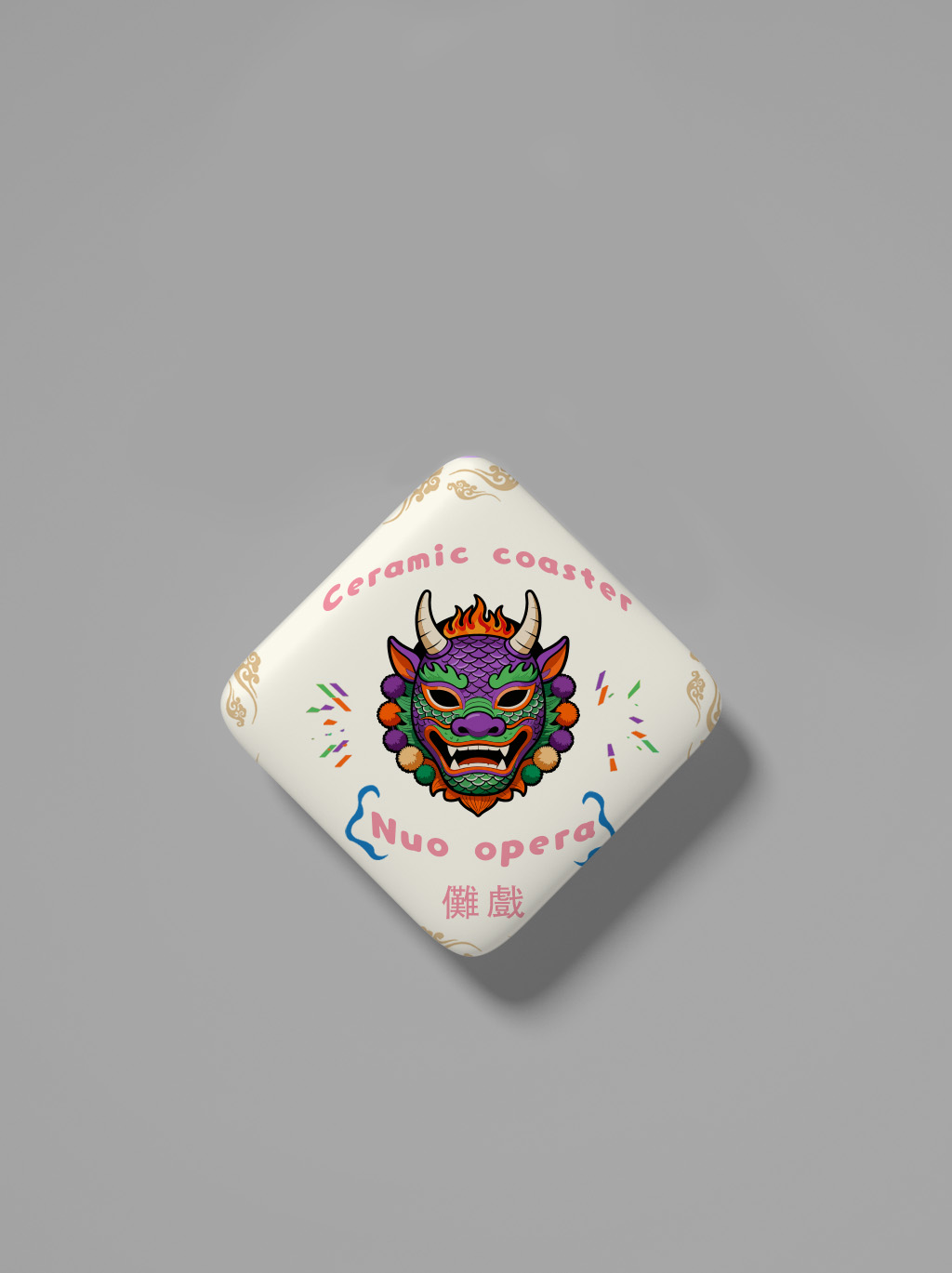 武安傩戏面具是傩戏文化的视觉灵魂,设计提取其夸张的面部结构、富有张力的色彩搭配(如紫、绿、红的撞色) 以及 “驱邪纳福” 的精神寓意,将这一非遗符号从民俗舞台迁移至日常器物,让用户在使用中直观感知傩戏的文化内涵。