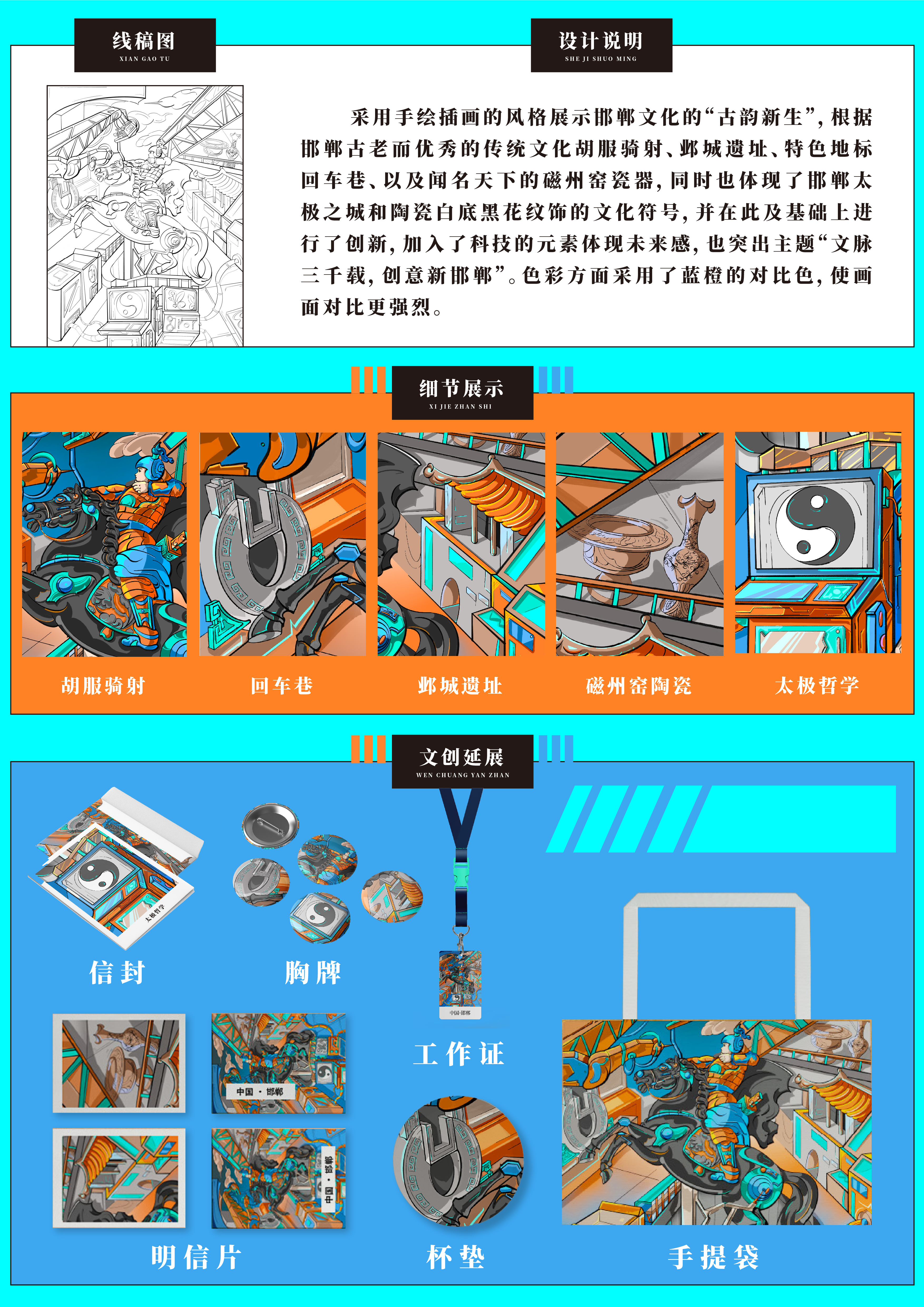 本作品名为邯郸文化·古韵新生插画文创设计,采用手绘插画的风格展示邯郸文化的“古韵新生”,根据邯郸古老而优秀的传统文化胡服骑射、邺城遗址、特色地标回车巷、以及闻名天下的磁州窑瓷器,同时也体现了邯郸太极之城和陶瓷白底黑花纹饰的文化符号,并在此优秀传统文化的基础上进行了创新,加入了科技的元素体现未来感,体现不断通过新技术、高科技来让传统文化焕发新的光彩,也突出主题“文脉三千载,创意新邯郸”。色彩方面采用了蓝橙的对比色,使画面对比更强烈。