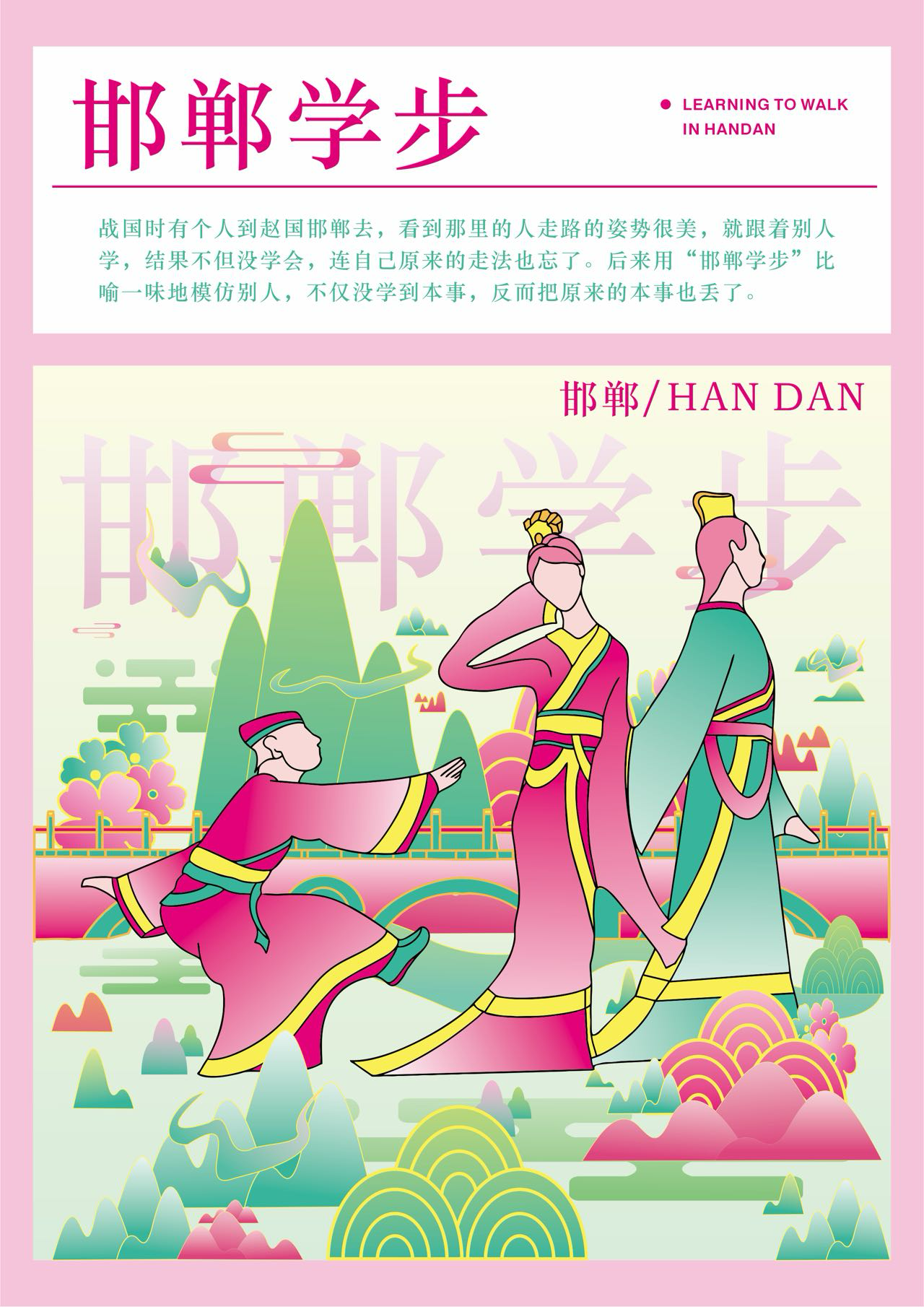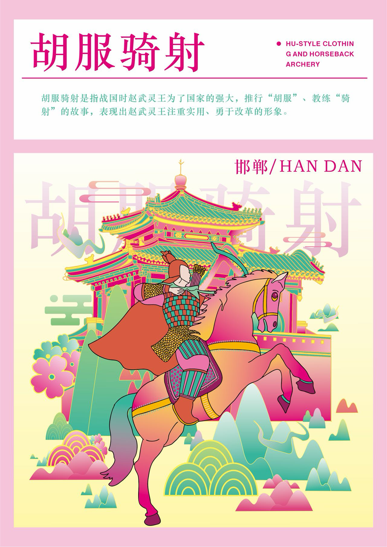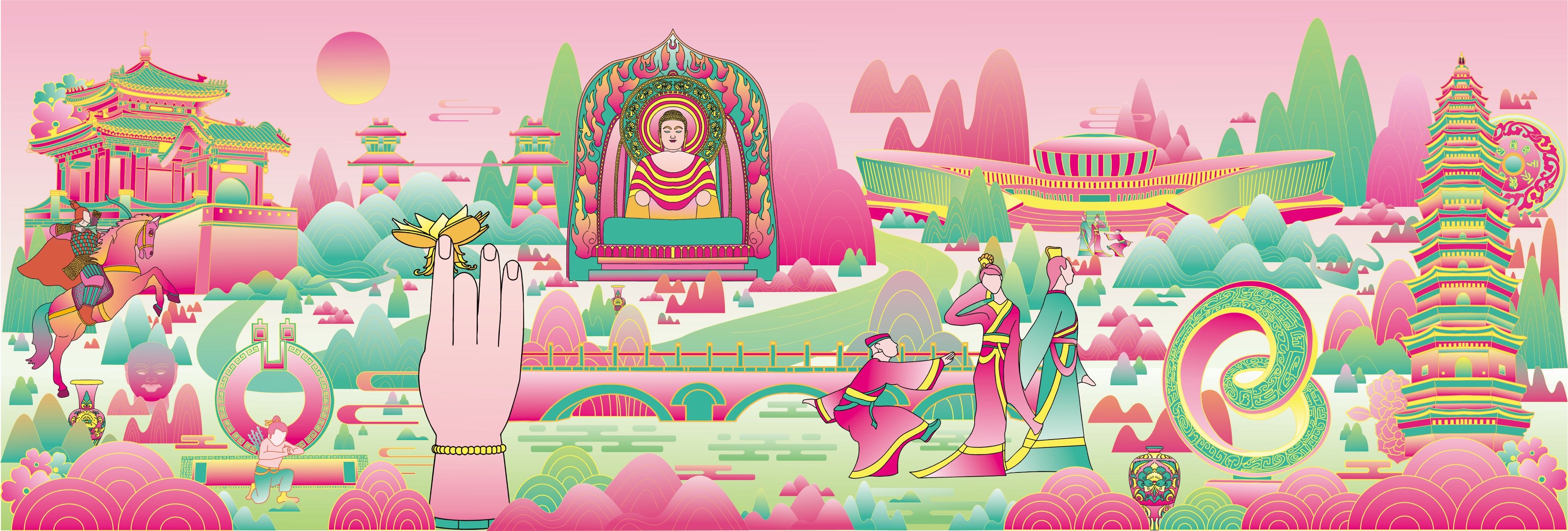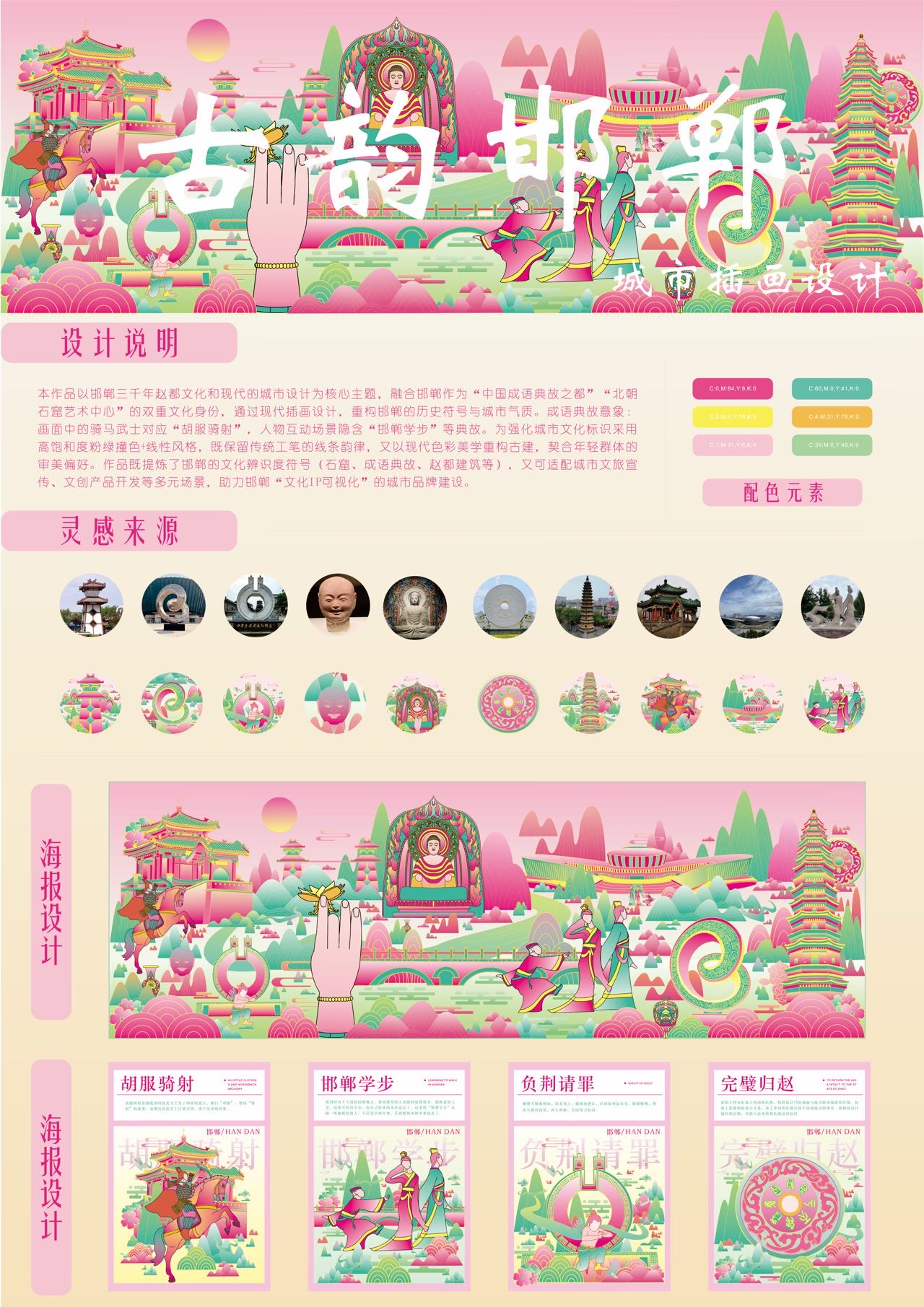 本作品以邯郸三千年赵都文化和现代的城市设计为核心主题,融合邯郸作为“中国成语典故之都”“北朝石窟艺术中心”的双重文化身份,通过现代插画设计,重构邯郸的历史符号与城市气质。成语典故意象:画面中的骑马武士对应“胡服骑射”,人物互动场景隐含“邯郸学步”等典故。为强化城市文化标识采用高饱和度粉绿撞色+线性风格,既保留传统工笔的线条韵律,又以现代色彩美学重构古建,契合年轻群体的审美偏好。作品既提炼了邯郸的文化辨识度符号(石窟、成语典故、赵都建筑等),又可适配城市文旅宣传、文创产品开发等多元场景,助力邯郸“文化IP可视化”的城市品牌建设。