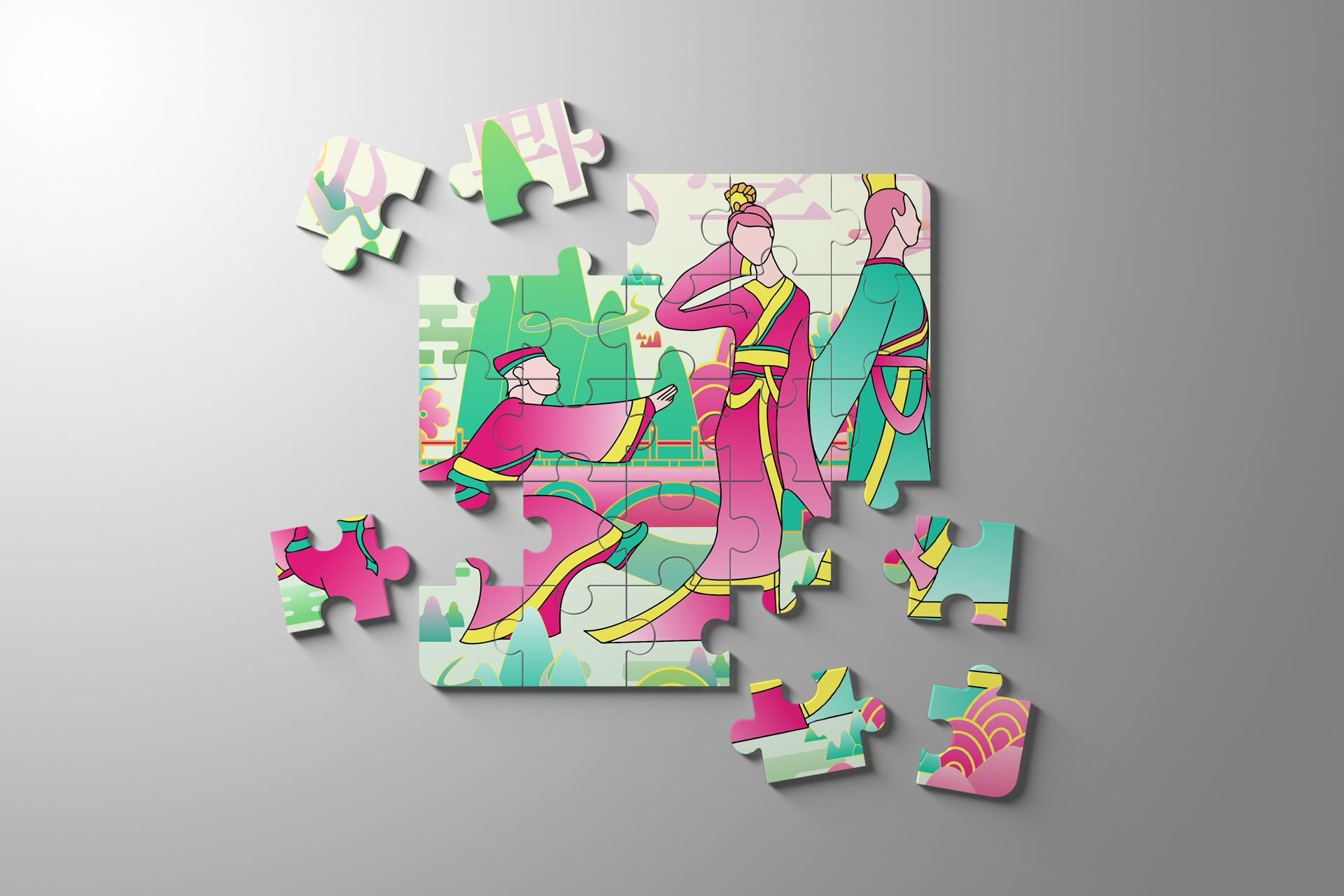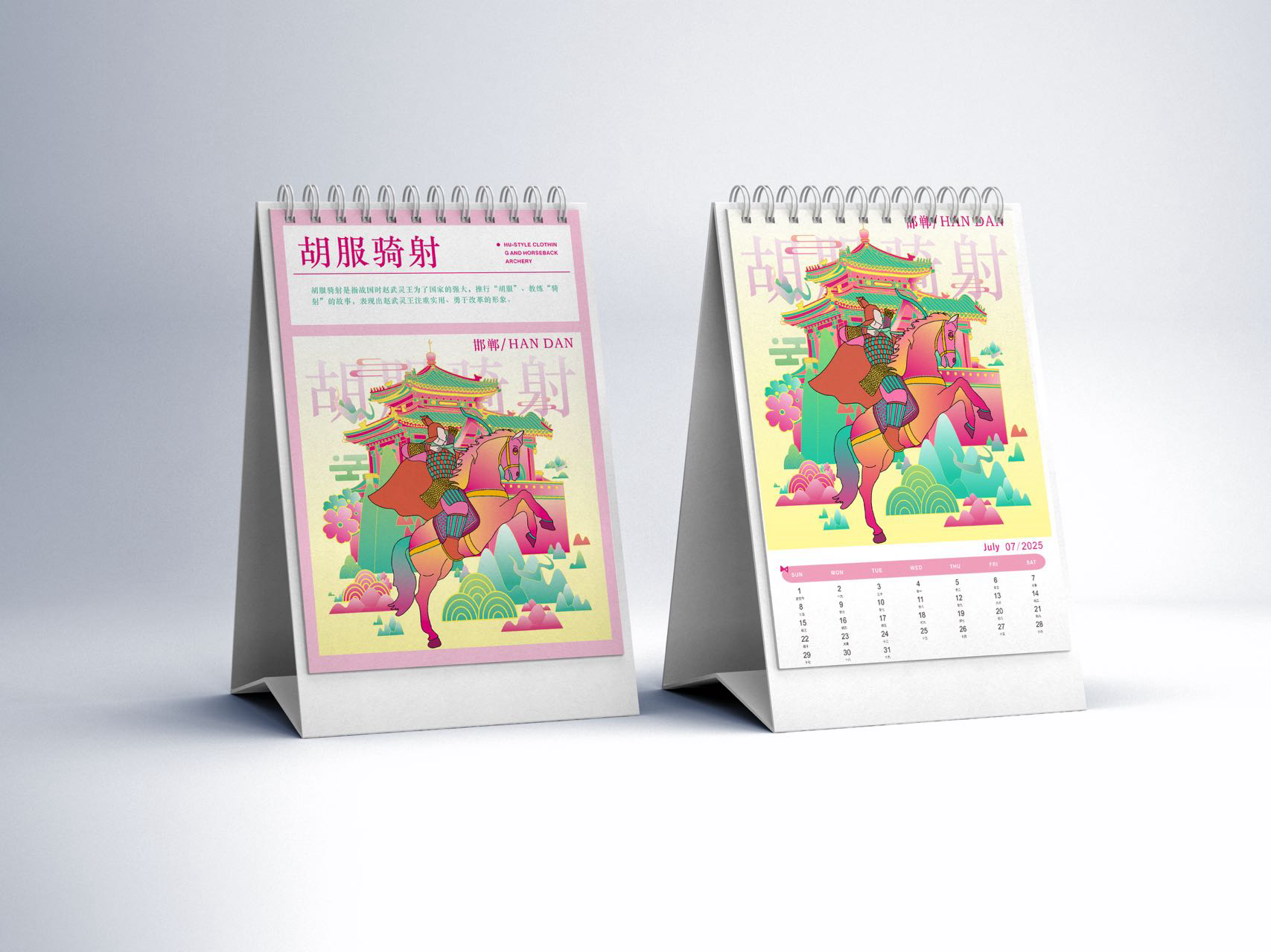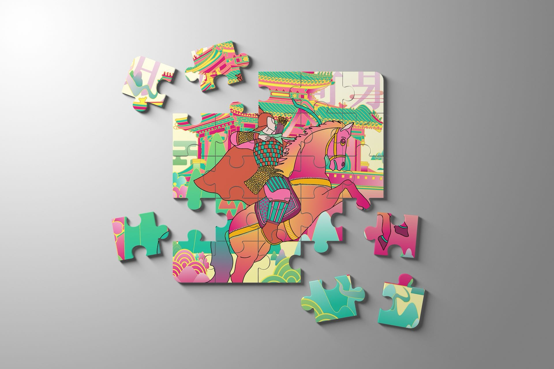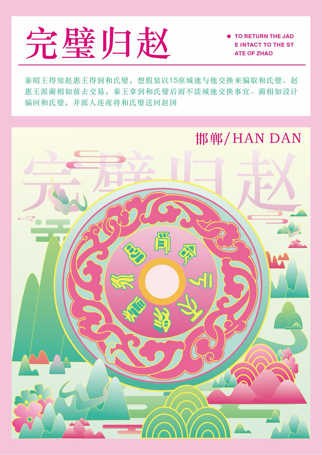 本作品以邯郸三千年赵都文化和现代的城市设计为核心主题,融合邯郸作为“中国成语典故之都”“北朝石窟艺术中心”的双重文化身份,通过现代插画设计,重构邯郸的历史符号与城市气质。成语典故意象:画面中的骑马武士对应“胡服骑射”,人物互动场景隐含“邯郸学步”等典故。为强化城市文化标识采用高饱和度粉绿撞色+线性风格,既保留传统工笔的线条韵律,又以现代色彩美学重构古建,契合年轻群体的审美偏好。作品既提炼了邯郸的文化辨识度符号(石窟、成语典故、赵都建筑等),又可适配城市文旅宣传、文创产品开发等多元场景,助力邯郸“文化IP可视化”的城市品牌建设。