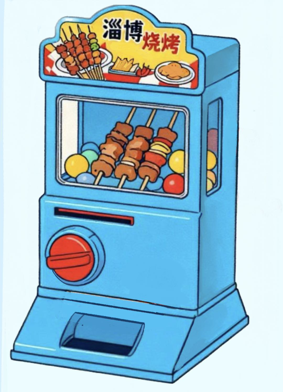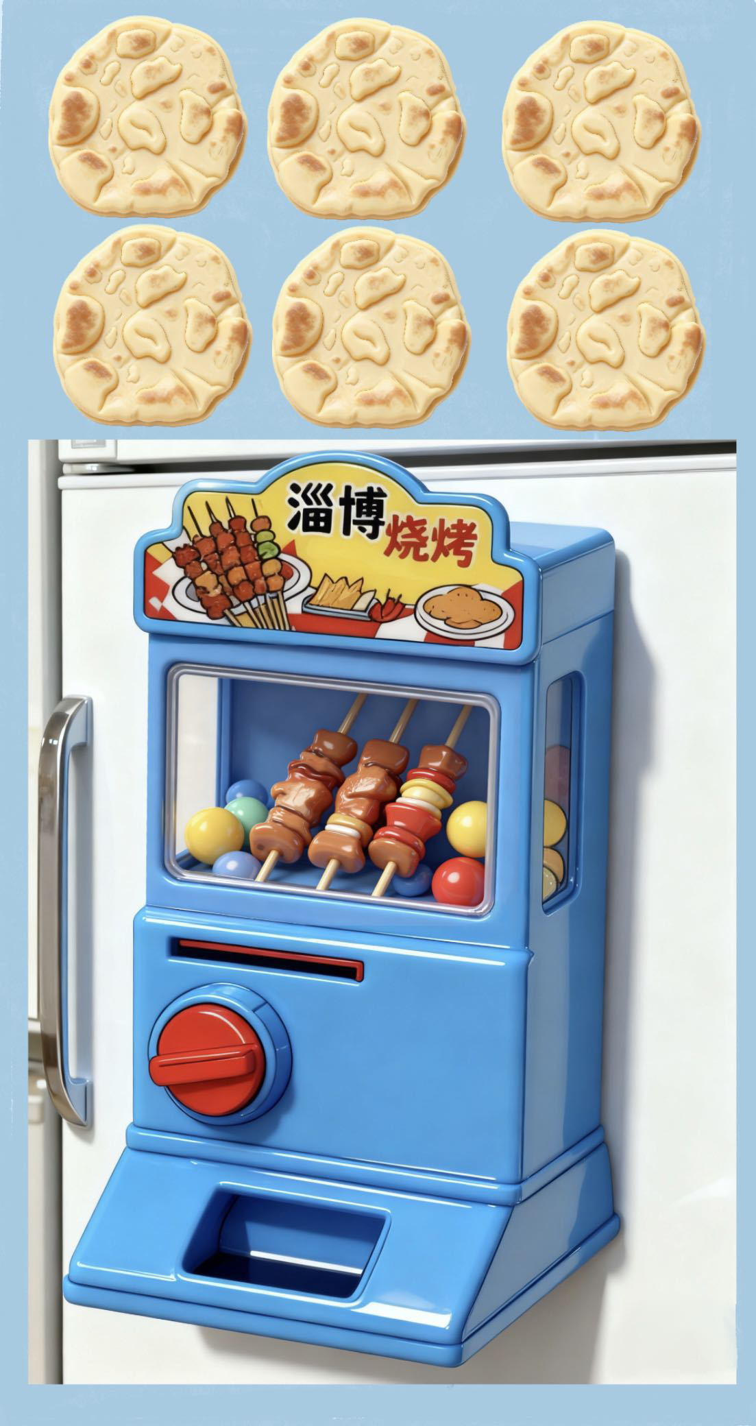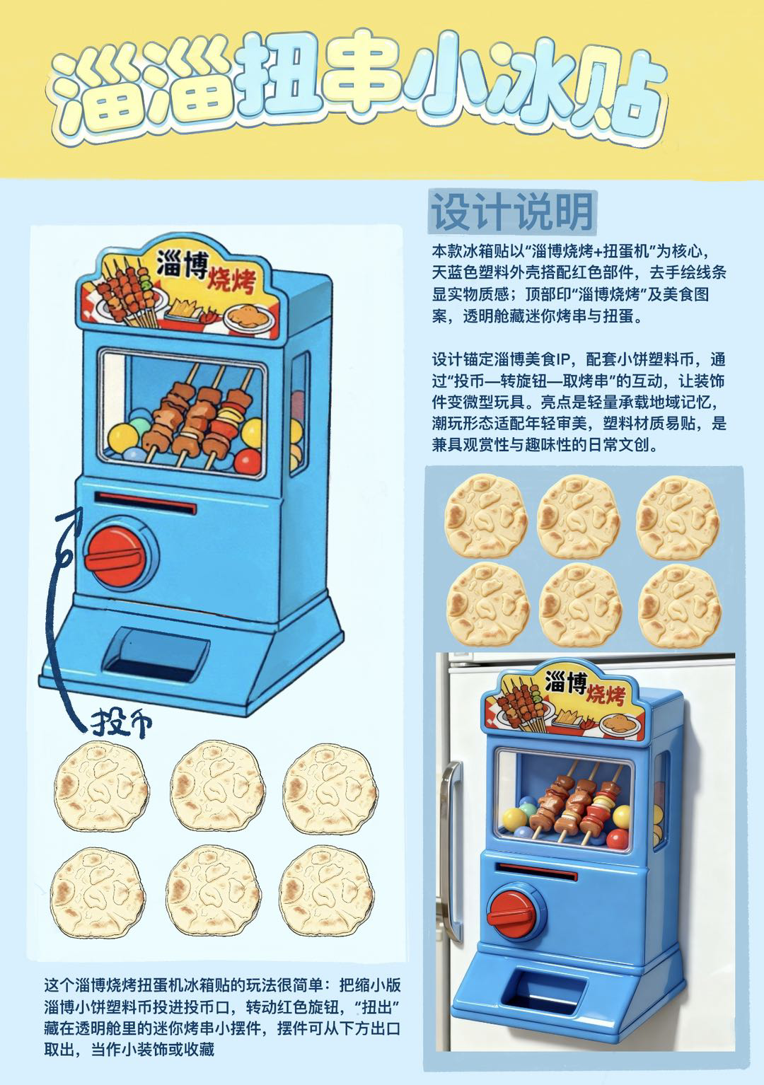 本款冰箱贴以“淄博烧烤+扭蛋机”为核心创意,将地域美食与趣味潮玩结合,打造兼具纪念性与互动感的文创单品。外观设计:主体还原经典扭蛋机造型,采用明亮的天蓝色塑料外壳,搭配红色旋钮、把手等撞色部件,弱化手绘线条,以光滑的塑料质感呈现真实器物的温润光泽; 顶部标识“淄博烧烤”,辅以烤串、小饼的立体印花,透明 舱内嵌入迷你烤串摆件与彩色扭蛋,还原扭蛋机的视觉层次。锚定淄博烧烤的地域IP属性,用扭蛋机的“盲盒式互动”强化趣味性-配套缩小版淄博小饼塑料投币,模拟 真实扭蛋机的操作流程,让冰箱贴从装饰单品升级为微型 互动玩具。以“小器物承载大文化”,既保留了淄博烧烤的美食符号,又通过扭蛋机的潮玩形态适配年轻群体审美;塑料材质轻便易贴,互动玩法让冰箱装饰更具参与 感,既是地域文创的轻量化表达,也是日常趣味的微型载体。