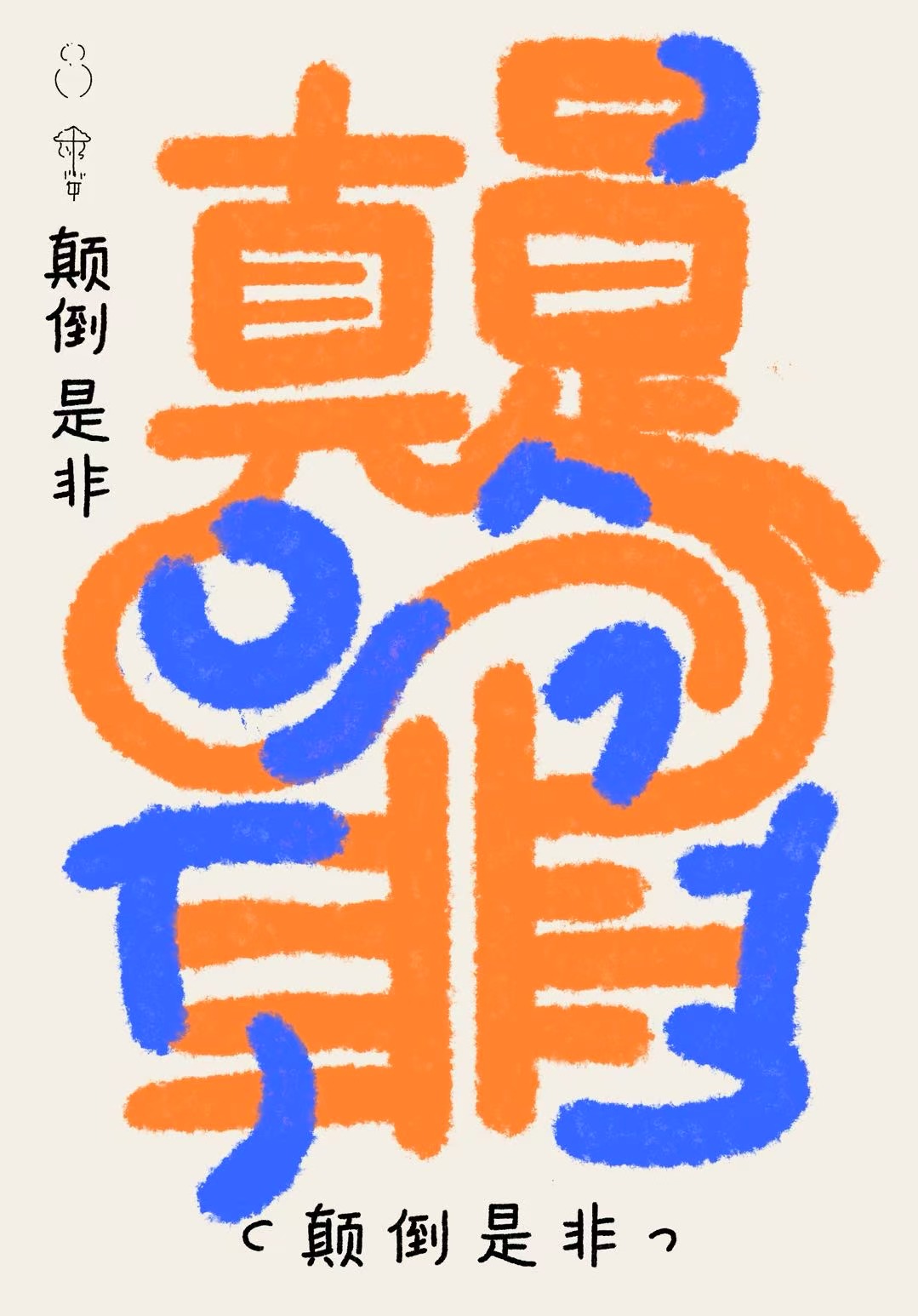 这个设计以邯郸文化中“颠倒是非”的思辨意象为核心:主视觉采用橙蓝撞色的书法字体,正看是“颠倒是非”,倒置后仍构成“颠倒是非”的字形解构,呼应成语“颠倒”的矛盾张力。左侧与底部的文字标注强化主题,毛笔肌理既保留邯郸书法文化的传统质感,又以现代色彩碰撞体现文化的当代转译——既暗合邯郸历史中“辩士纵横”的思辨底色,也以视觉游戏传递“是非本无定,思辨方见真”的文化哲思。