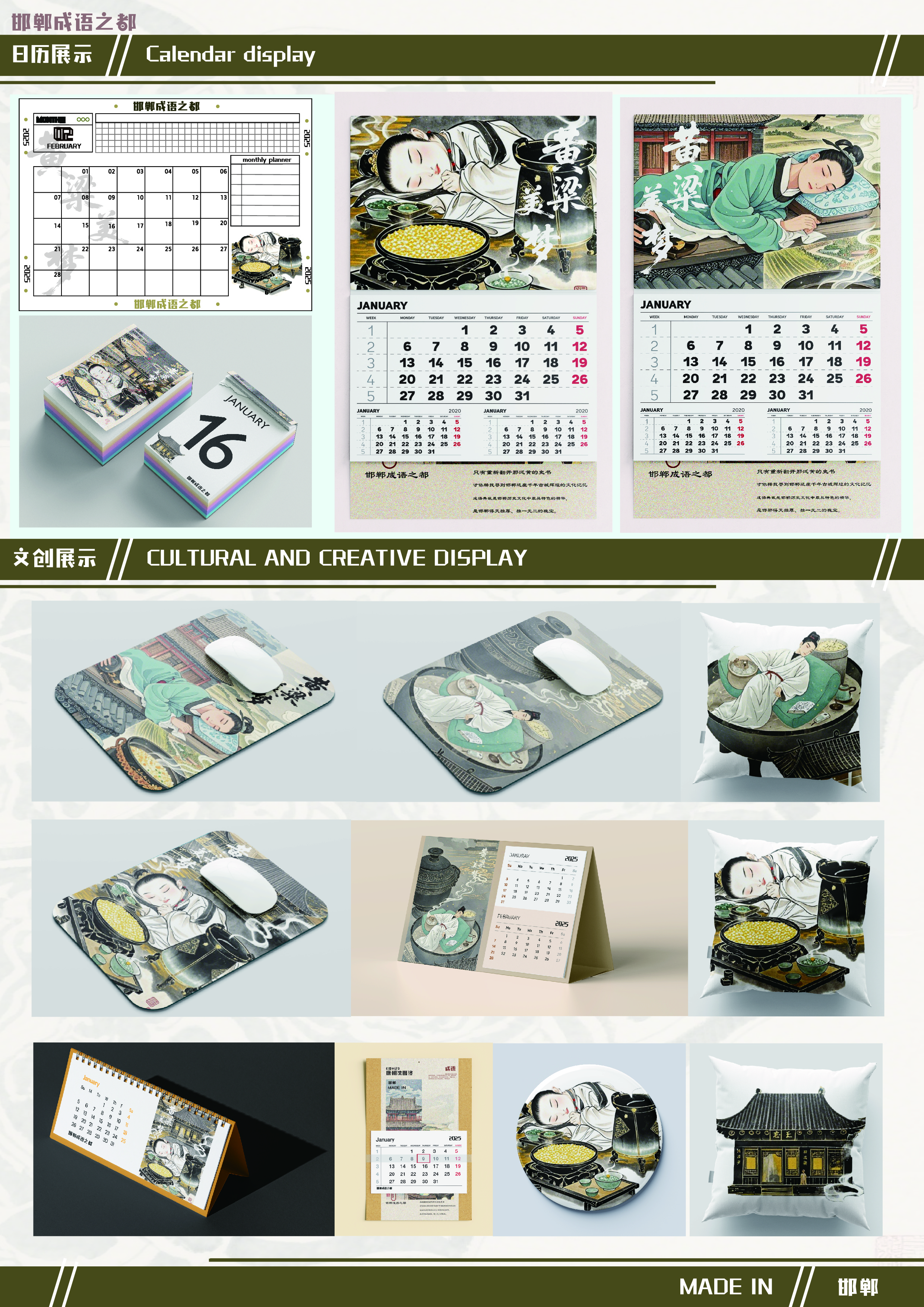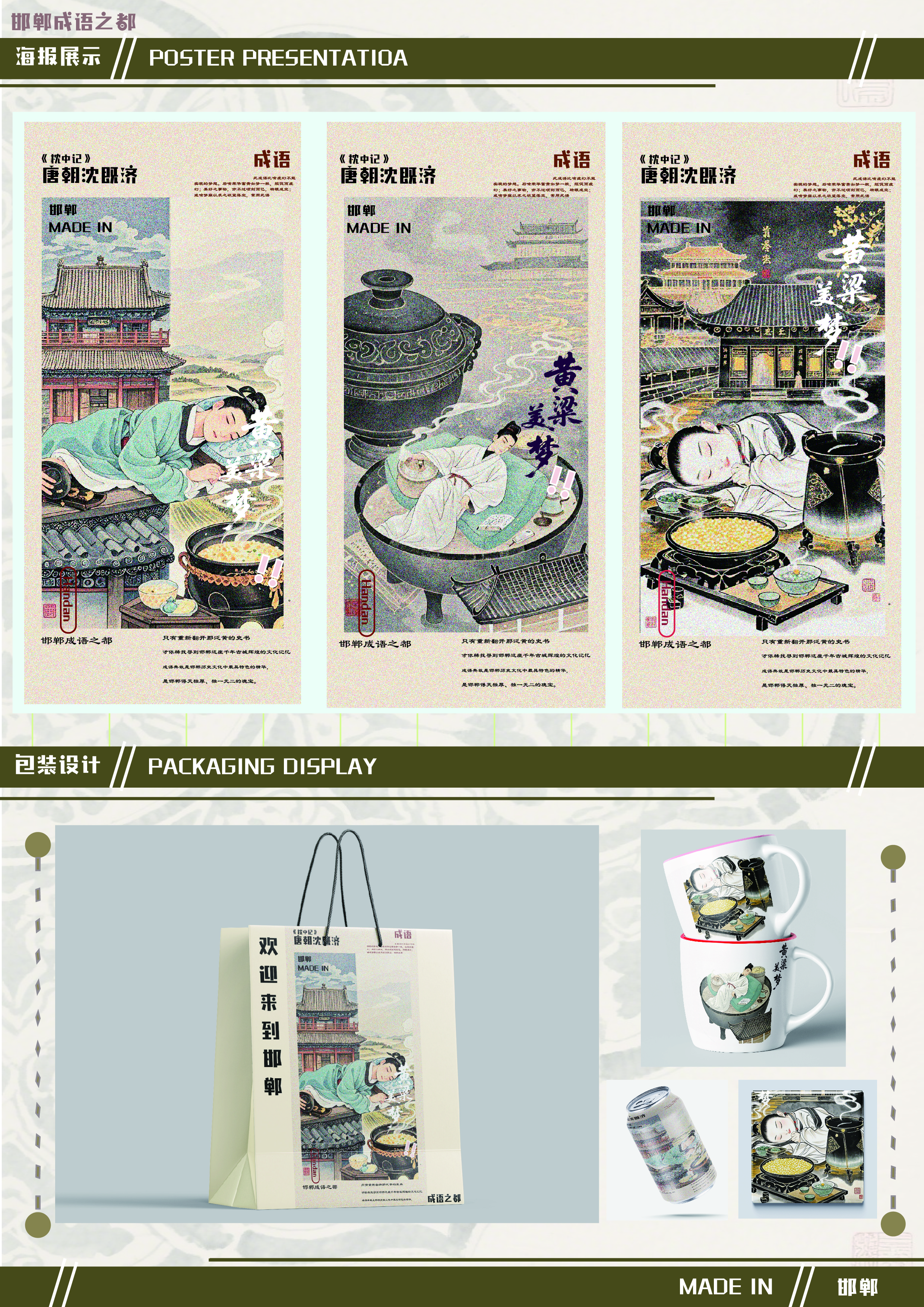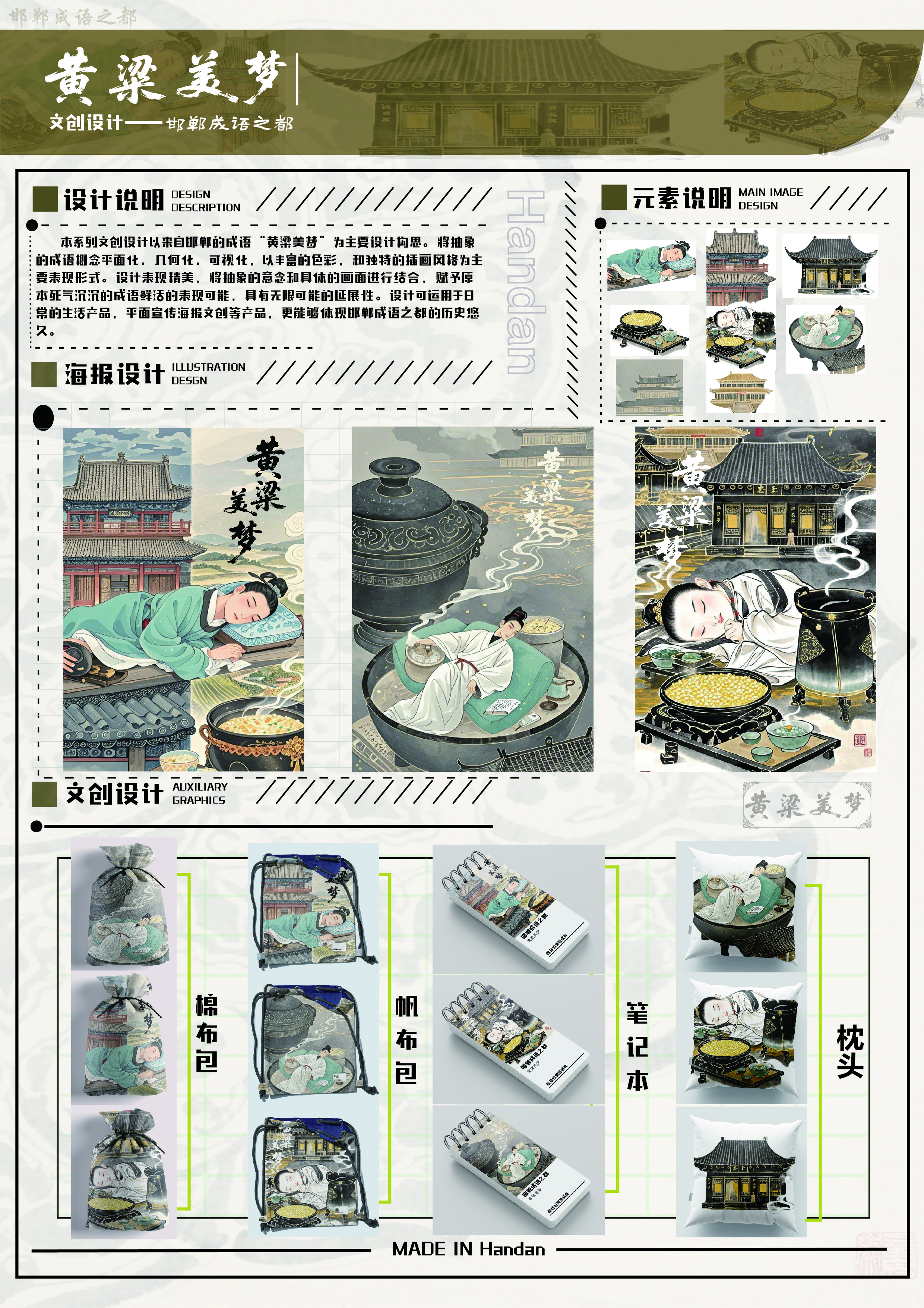 这是邯郸成语“黄粱美梦”主题文创设计,以成语典故为核心,将“梦中富贵”的抽象概念转化为具象插画:融合古建、睡者、黄粱炊具等元素,用国风插画风格呈现典故场景。 设计通过海报+文创(布袋、笔记本、枕头等)的形式,让成语文化落地日常用品,既还原“黄粱一梦”的故事质感,又以现代文创载体传递邯郸成语的历史韵味,实现传统典故的可视化与生活化表达。