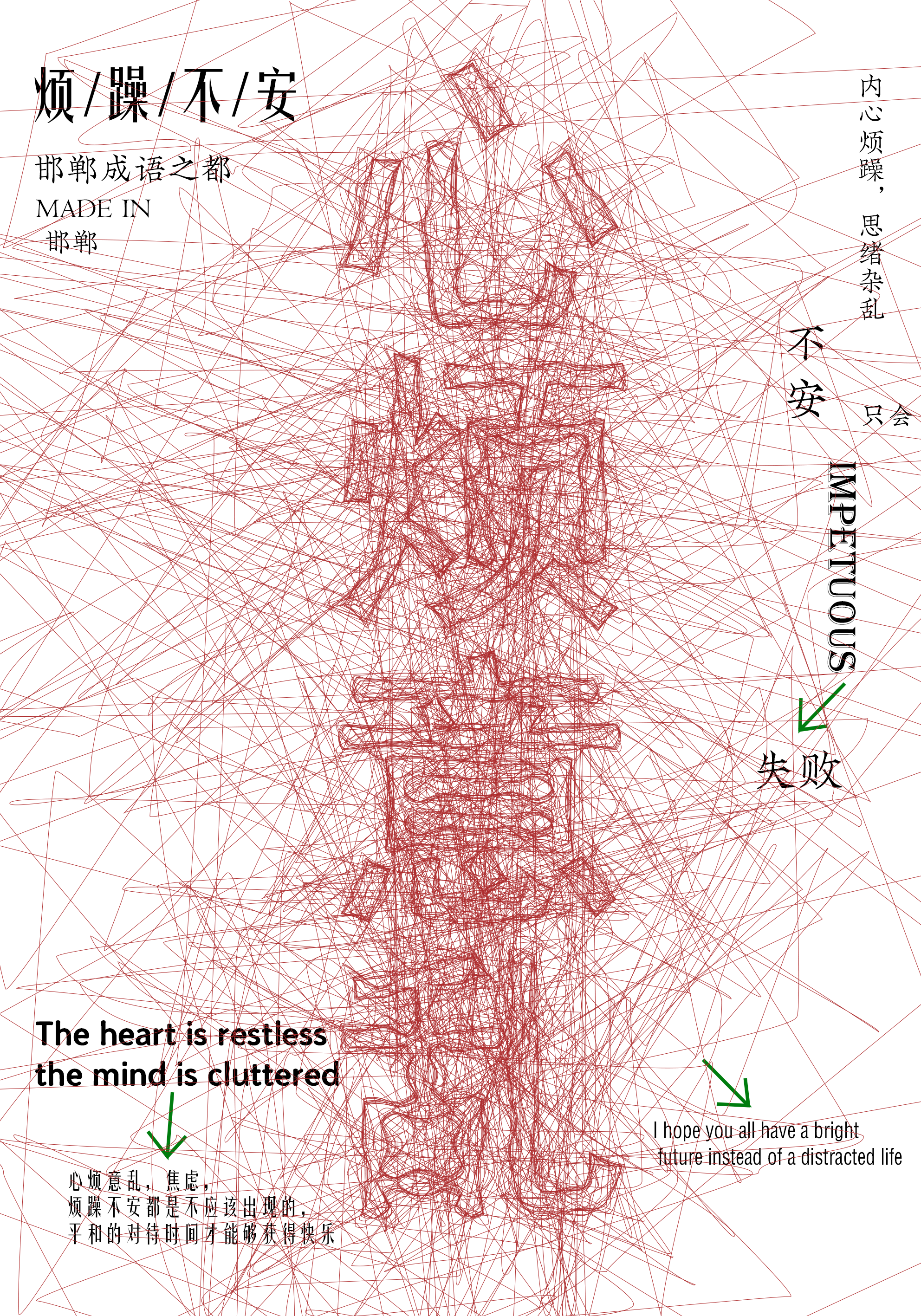 这是“邯郸成语之都”主题作品,聚焦成语“烦躁不安”。设计以缠绕的红色线条构建“心、烦、意、乱”字体,视觉化呈现“心绪杂乱”的状态;搭配中英释义与“烦躁→失败”的箭头逻辑,强化成语的情绪警示内涵。整体用抽象线条语言诠释成语的心理感受,既突出邯郸文化标识,又以现代视觉形式传递“平和待事”的价值导向,简洁传递成语的情绪与思辨内核。