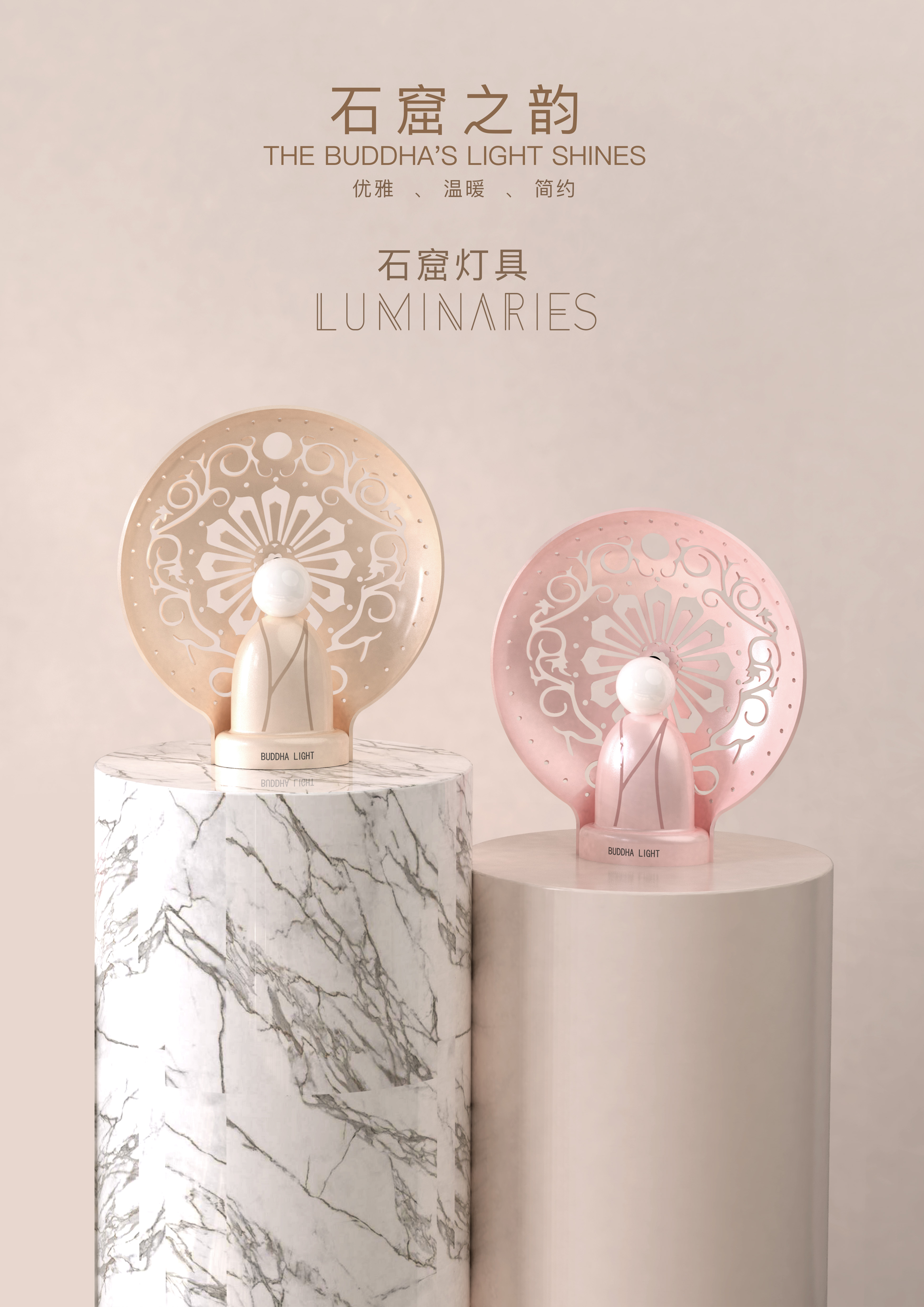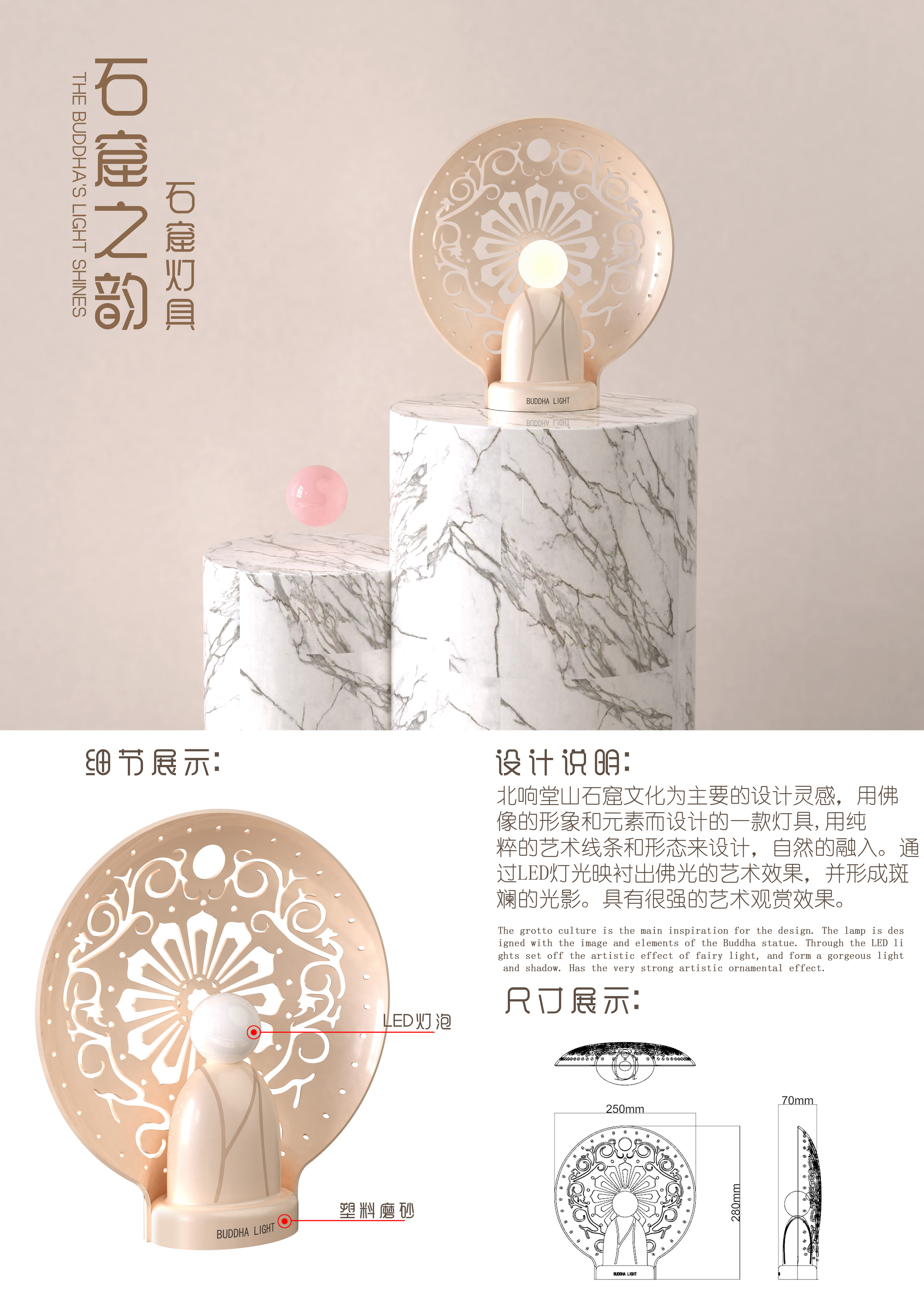 北响堂山石窟文化为主要的设计灵感,用佛 像的形象和元素而设计的一款灯具,用纯 粹的艺术线条和形态来设计,自然的融入。通 过LED灯光映衬出佛光的艺术效果,并形成斑 斓的光影。具有很强的艺术观赏效果。