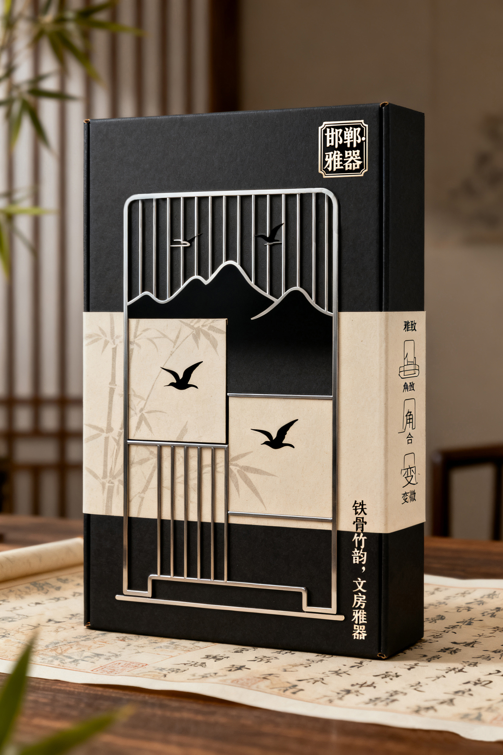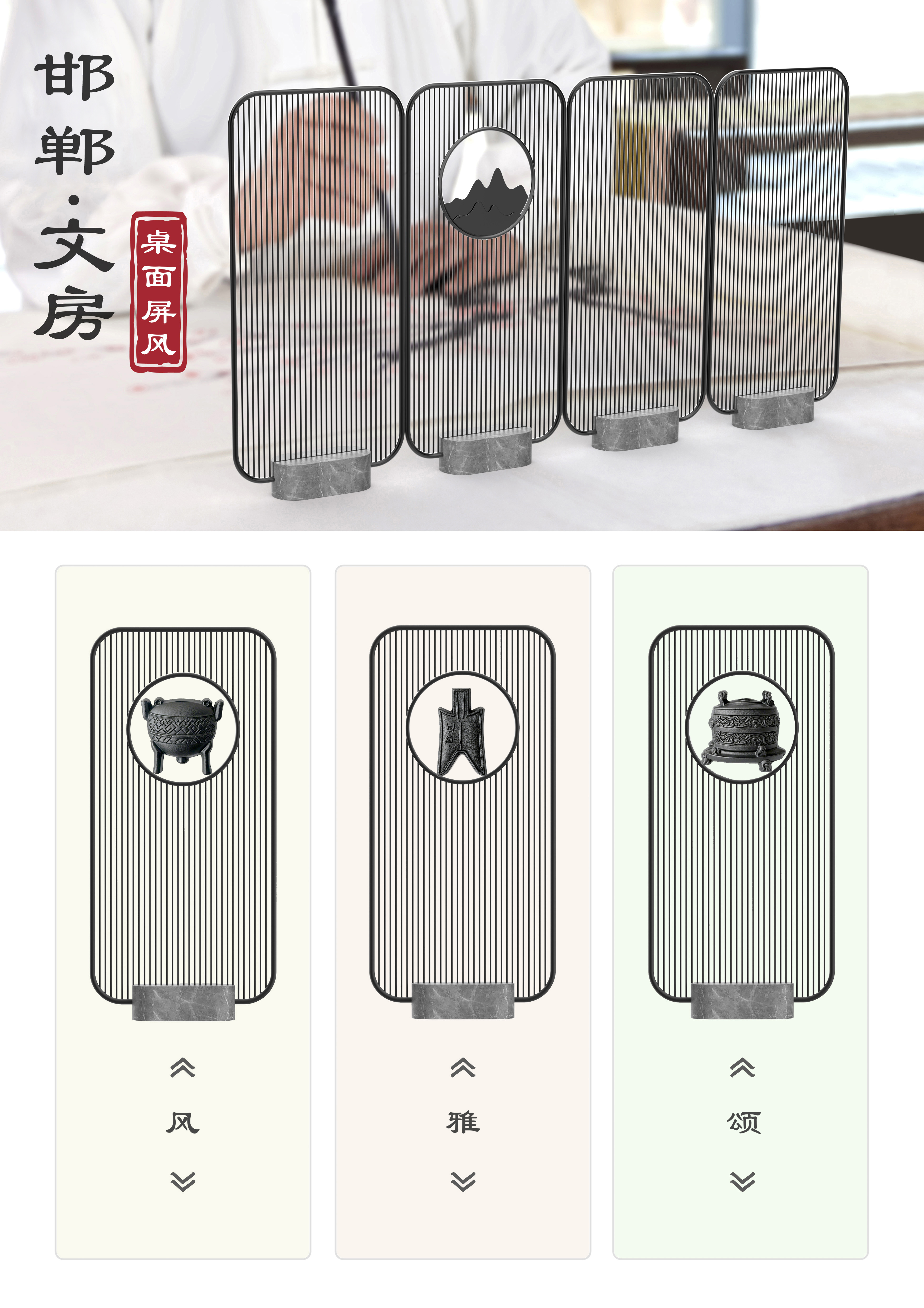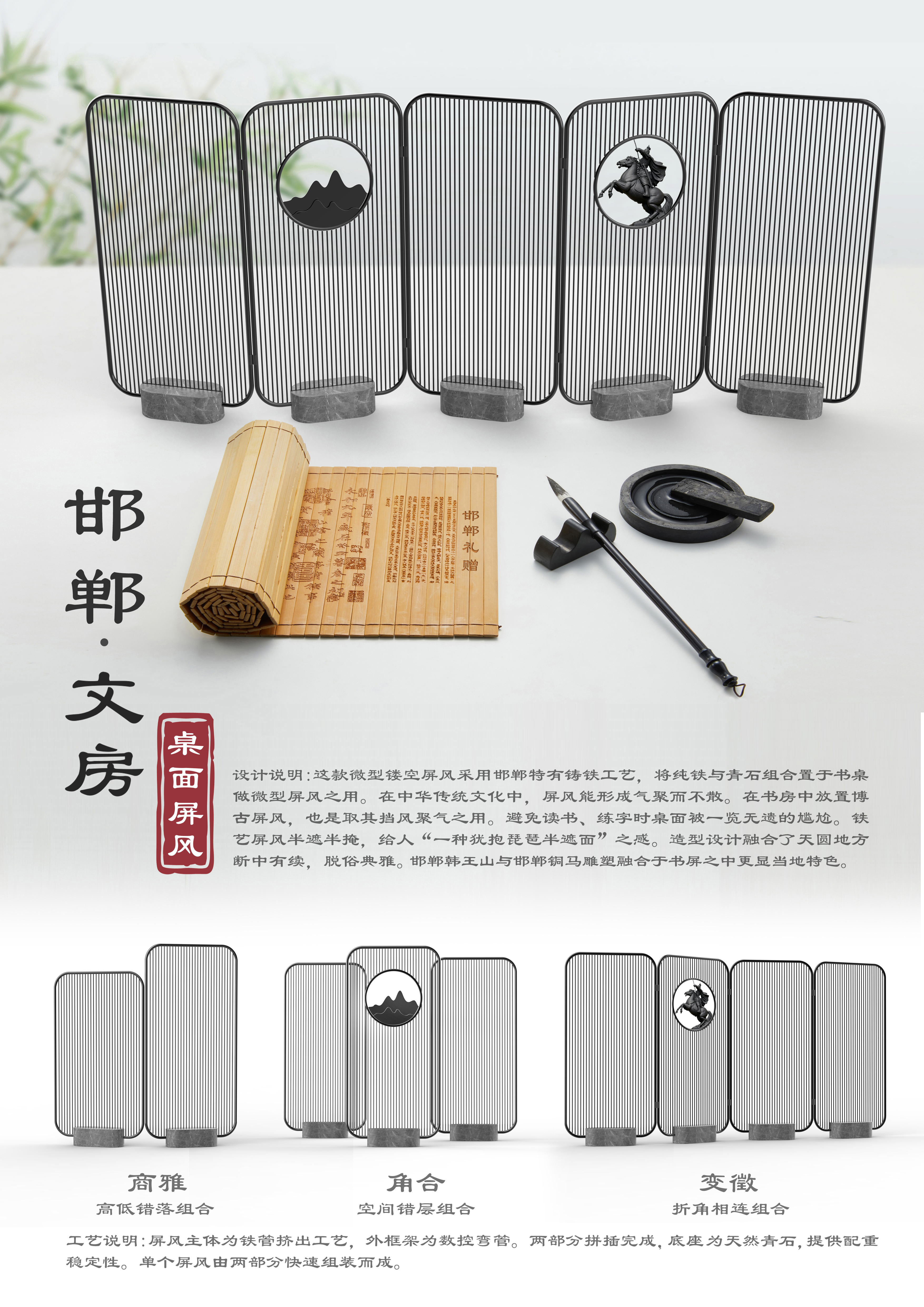 设计说明:这款微型镂空屏风采用邯郸特有铸铁工艺,将纯铁与青石组合置于书桌做微型屏风之用。在中华传统文化中,屏风能形成气聚而不散。在书房中放置博古屏风,也是取其挡风聚气之用。避免读书、练字时泉面被一览无遗的尴尬。铁艺屏风半遮半掩,给人“一种犹抱琵琶半遮面”之感。造型设计融合了天圆地方断中有续,脱俗典雅。邯郸韩王山与邯郸铜马雕塑融合于书屏之中更显当地特色。