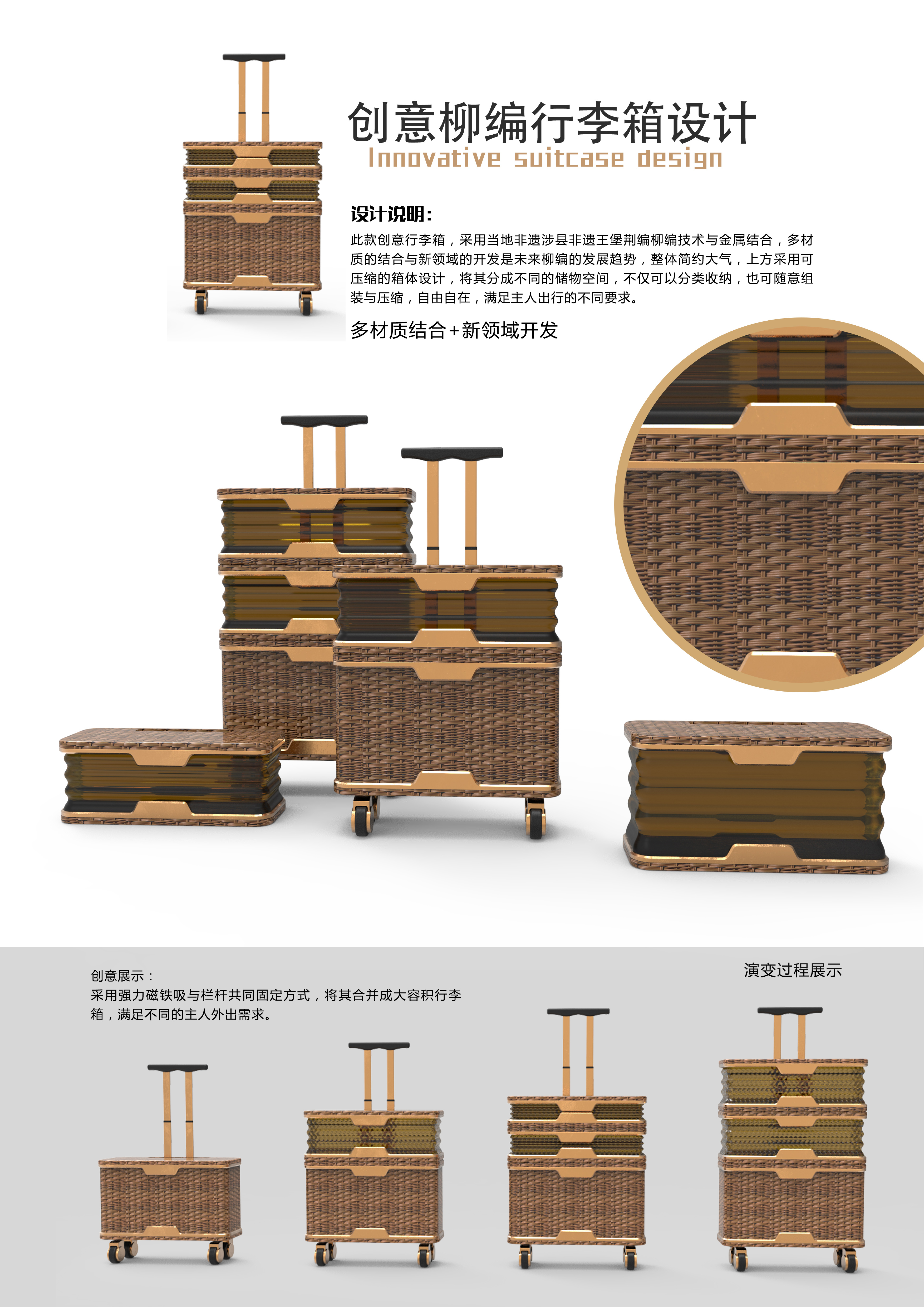 此款创意行李箱,采用当地非遗涉县非遗王堡荆编柳编技术与金属结合,多材质的结合与新领域的开发是未来柳编的发展趋势,整体简约大气,上方采用可压缩的箱体设计,将其分成不同的储物空间,不仅可以分类收纳,也可随意组装与压缩,自由自在,满足主人出行的不同要求。